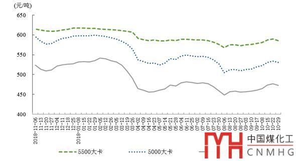 11月初,秦皇島港5500大卡煤炭綜合交易價(jià)格為每噸584元,比10月初上漲3元;5000大卡煤炭為每噸530元,上漲7元;4500大卡煤炭為每噸472元,上漲7元。
