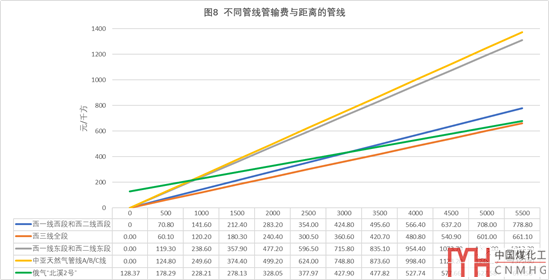 我們選取與進(jìn)口中亞天然氣有關(guān)的管線運(yùn)費(fèi),西一線西段和西二線西段0.1416元/千方.公里,西三線全段0.1202元/千方.公里,西一線東段和西二線東段0.2386元/千方.公里,中亞天然氣管線A/B/C線3.5美元/千方.百公里(0.2496元//千方.公里),對比俄氣(Gazrpom)北溪2號管線(從俄羅斯東北部沿海烏斯季-盧加地區(qū)穿越波羅的海到達(dá)德國北部格賴夫斯瓦爾德,年輸量550億方)管輸費(fèi)公式為18$+1.4*公里數(shù)/100,見圖8。同樣是跨境管線,中亞管道的取費(fèi)比北溪2號管線要貴得多,例如中亞管線到從土-烏邊境到中國的霍爾果斯,全長1837公里,管輸費(fèi)64.3美元/千方,如果按俄氣管輸費(fèi)公式,則管輸費(fèi)為43.764.3美元/千方,每千方氣20.58美元,降低32%,這樣有利于進(jìn)口天然氣。在國內(nèi)管道中,西一線東段和西二線東段定價(jià)太高。按俄氣價(jià)格公式,特別有利于長輸管線,這也是為什么俄羅斯那么多輸管線到歐洲距離都超過6000公里,一方面保證了天然氣出口,另一方面管道公司獲得長期回報(bào)。