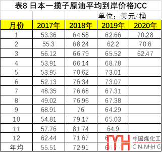 表8為主要掛鉤基準(zhǔn)價(jià)——日本一攬子原油平均到岸價(jià)近幾年的變化情況。我國進(jìn)口天然氣的價(jià)格一般是跟9個(gè)月之前的JCC(日本平均到岸油價(jià))掛鉤的,簡單理解,今年的進(jìn)口氣價(jià)基本上是跟去年的氣價(jià)掛鉤的。2018年進(jìn)口氣價(jià)掛鉤的是2017年4-12月以及2018年1-3月,這期間平均JCC價(jià)格為58.41美元;2019年掛鉤的平均JCC價(jià)格為72.14美元/桶。由于油價(jià)的變化,2019年天然氣進(jìn)口成本相對于2018年提高了23.5%,而國內(nèi)門站氣價(jià)沒有變化。