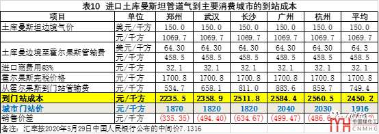 綜合上述因素,假設(shè)土庫曼斯坦天然氣土-烏邊境價(jià)格為150美元/千方,測算到鄭州、武漢、長沙、廣州和杭州的到站成本見表10 。這幾個(gè)城市的平均到站成本達(dá)2450.2元/千方,而平均的門站價(jià)格只有1916元/千方,每進(jìn)口一千方氣虧損490.12元。所以,中石油說的虧損數(shù)應(yīng)該是事實(shí)。