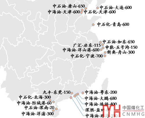 中國已投產(chǎn)21座接收站(圖3),共計(jì)接卸能力已達(dá)9035萬噸/年(1265億方/年),其中有5座接收站屬于非三桶油主導(dǎo)(新奧、廣匯、深燃、九豐、申能),接受能力為875萬噸、占9.7%。計(jì)劃新建或者擴(kuò)建8座LNG接收站,粗略統(tǒng)計(jì)這些新增的接卸能力就達(dá)到2355萬噸/年,全部投運(yùn)后中國LNG接收站接卸能力超億噸,達(dá)到11390萬噸/年(合1595億方/年)。