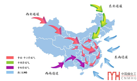 我國天然氣進(jìn)口通過以下四個(gè)通道(圖2),陸上通道3個(gè)包括:西北通道(管道進(jìn)口中亞天然氣)、東北通道(管道進(jìn)口俄羅斯天然氣)和西南通道(管道進(jìn)口緬甸天然氣)(見表3),海上通道目前有21個(gè)LNG接收終端(進(jìn)口來自澳大利亞、卡塔爾、美國、馬來西亞、印尼等國家的液化天然氣)。
