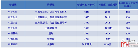 中國已經(jīng)建成的天然氣進(jìn)口管線包括中亞管線A/B/C三條線、中俄東線、中緬管線,已建成的管線長度為12996公里,建成的管輸能力為1050億方。計(jì)劃建設(shè)的中亞管線D線和中俄管線西線,將增加天然氣管輸能力600億方。未來管線天然氣進(jìn)口能力1650億方(表3)。