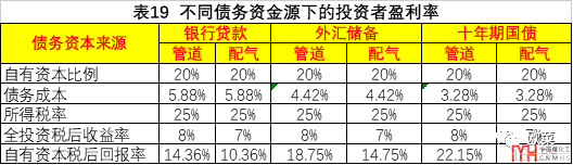 假設(shè)自有資本為20%(即4倍杠桿),債務(wù)資金來源分別為銀行貸款、中國外匯儲備和中國十年期國債,全部上浮20%,可以計(jì)算出管道和配氣投資者(自有資本)的投資盈利率(稅后),見表19。由此可見,國家規(guī)定8%或7%的全部投資稅后盈利率,投資者的稅后盈利率最低都有10%以上,最高可達(dá)22.15%。[!--empirenews.page--]