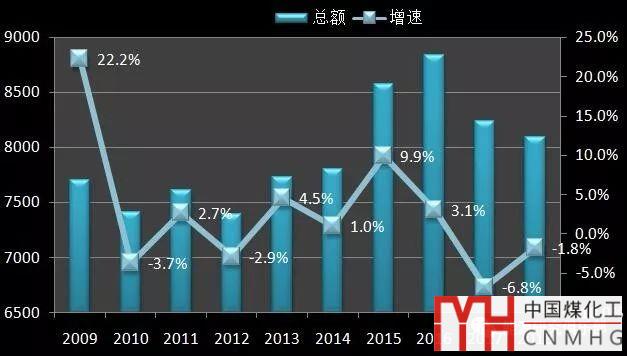 圖5-15 2009~2018年全國電力投資總量及增速(單位:億元、%)