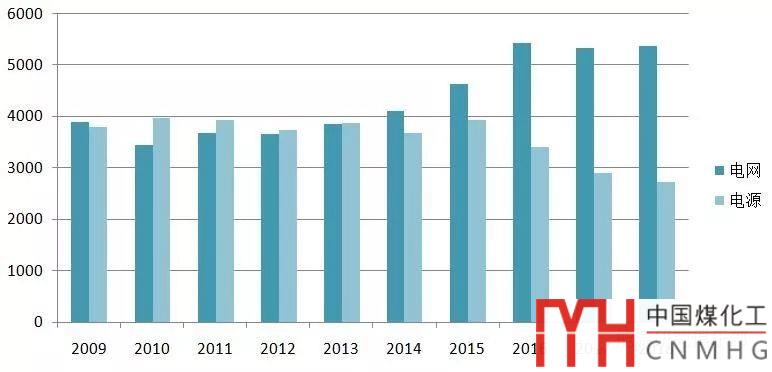 從近十年投資趨勢看,電網、電源投資均有波動,兩者差距在近五年逐步加大。電源投資呈現波動性,2015年之后連續(xù)三年大降,與2015年相比,2018年電源投資減少超1200億元。
