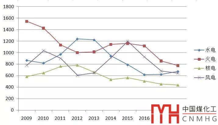 從不同電源的投資來看,增速差別巨大。其中水電投資674億元,增速為8.4%;火電投資777億元,同比降低9.4%;核電投資437億元,同比降低3.8%;風電投資642億元,同比降低5.7%。