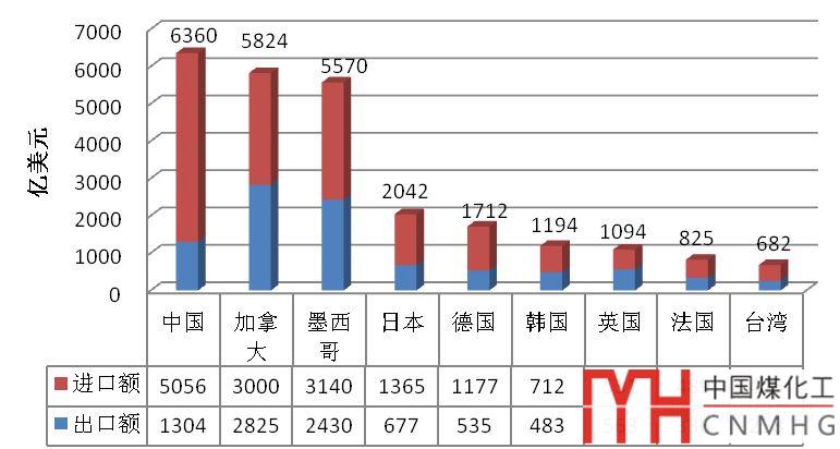 圖1 2017年美國與主要貿(mào)易伙伴國貿(mào)易情況