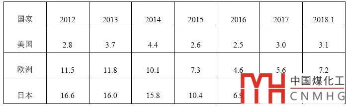 在天然氣價格方面,自從“頁巖革命”爆發(fā)以來,美國頁巖氣生產(chǎn)爆發(fā)式增長,使得美國迅速成為全球天然氣價格的洼地;東亞天然氣消費者則不得不承受國際天然氣市場長期存在的“東亞溢價”的負(fù)擔(dān),東亞市場天然氣價格高時可達(dá)北美市場6倍左右。從2012年至2018年第一季度,歐洲天然氣價格相當(dāng)于美國天然氣價格的1.8~4.1倍,東亞價格(以日本價格為基準(zhǔn))相當(dāng)于美國的2.7~5.9倍,具體見表4。