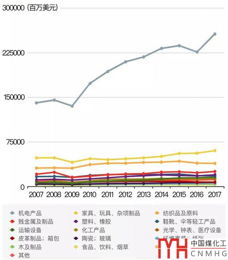 美國自中國進(jìn)口商品以機(jī)電產(chǎn)品為主,2017年美國進(jìn)口2566億美元,占美國自中國進(jìn)口總額的50.8%,增長13.4%,具體見圖4。其中,電機(jī)和電氣產(chǎn)品進(jìn)口1470億美元,增長14.0%;機(jī)械設(shè)備進(jìn)口1096億美元,增長12.5%。家具玩具、紡織品及原料和賤金屬及制品分別居美國自中國進(jìn)口商品的第二、第三和第四位,2017年進(jìn)口額606億美元、390億美元和254億美元,占美國自中國進(jìn)口總額的12.0%、7.7%和5.0%。中國的家具玩具、鞋靴傘等輕工產(chǎn)品和皮革制品箱包占美國進(jìn)口市場的60.4%、58.3%和53.3%,具有絕對競爭優(yōu)勢,中國產(chǎn)品的競爭者主要來自墨西哥、越南和意大利等國家。中國同時也是美國機(jī)電產(chǎn)品、紡織品及原料、賤金屬及制品和塑料橡膠的首位進(jìn)口來源國。