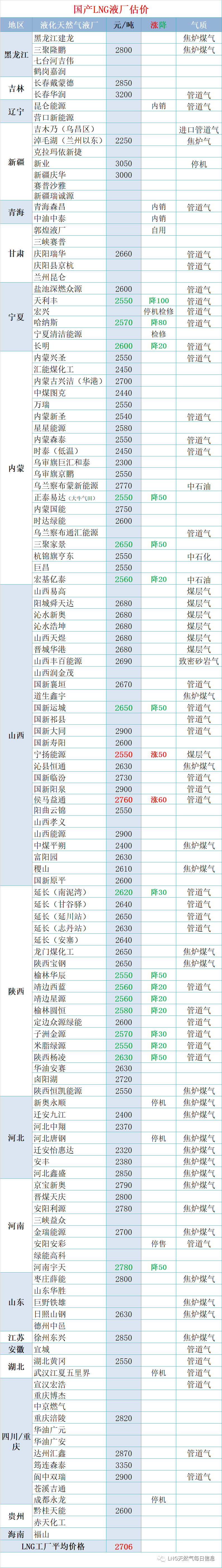 【5月29日】陜西、寧夏、山西、內(nèi)蒙18家LNG液廠降價(jià)20-100元/噸。山西2家漲價(jià)50-60元/噸。