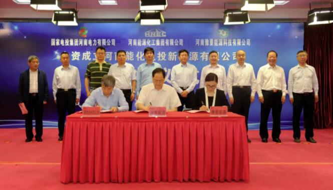 集團(tuán)公司副總經(jīng)理趙廷釗、國(guó)家電投集團(tuán)河南電力有限公司副總經(jīng)理張國(guó)干、河南豫景能源科技有限公司副總經(jīng)理魏曉霞代表三方共同簽署了《設(shè)立河南能化電投新能源有限公司合資協(xié)議》。