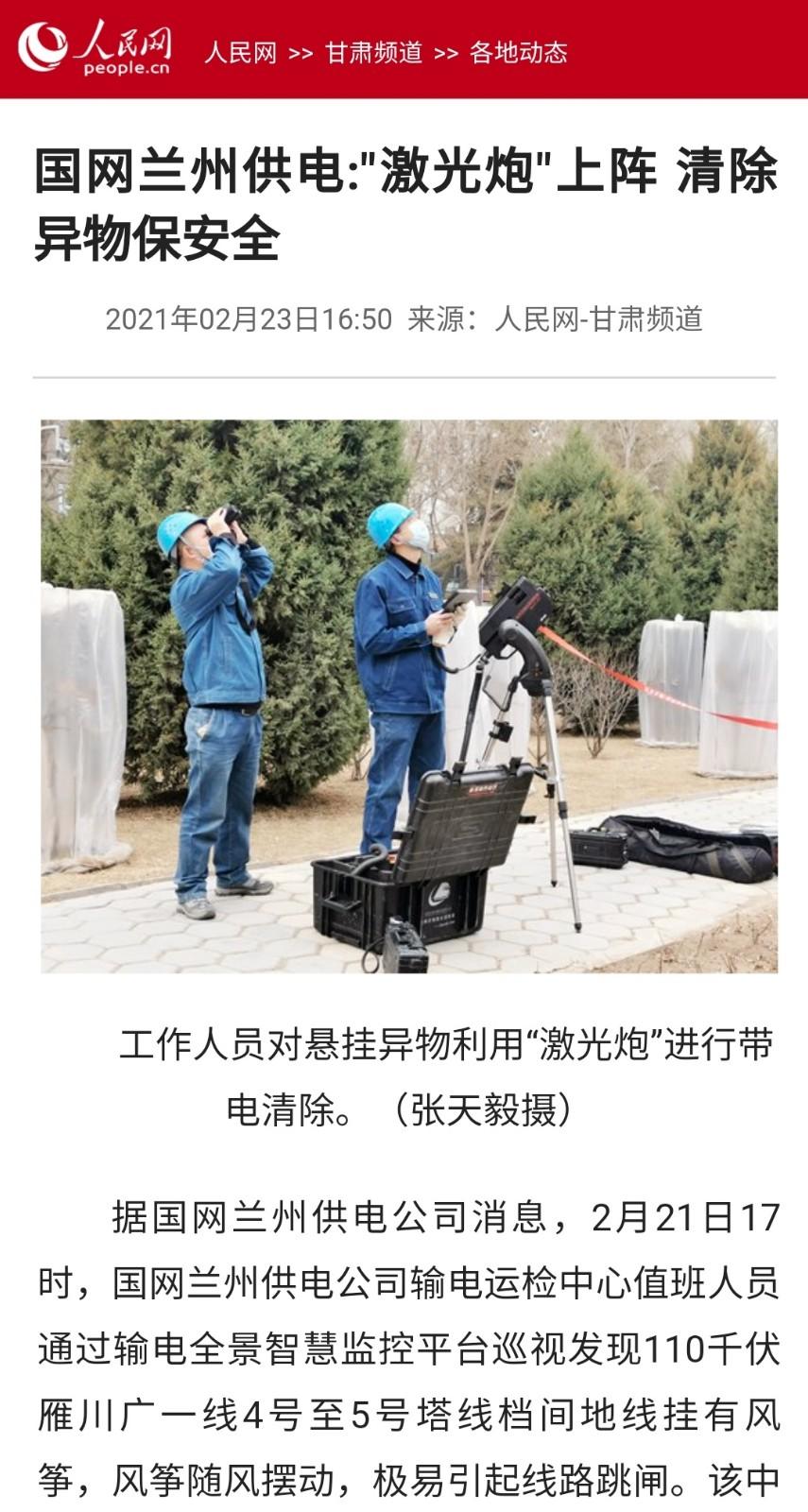 人民網(wǎng):國網(wǎng)蘭州供電:“激光炮“上陣 清除異物保安全
