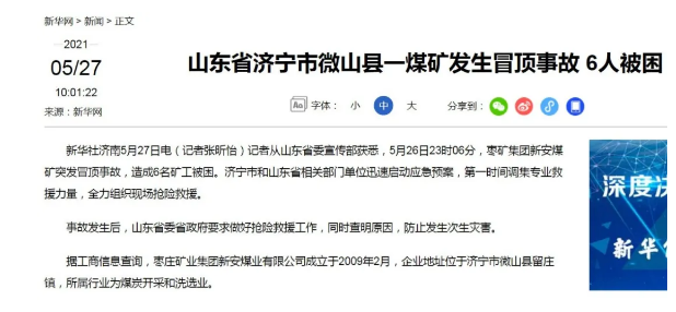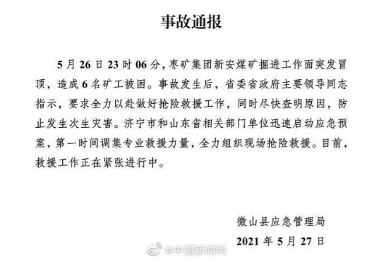 6人被困!山東省微山縣一煤礦發(fā)生冒頂事故