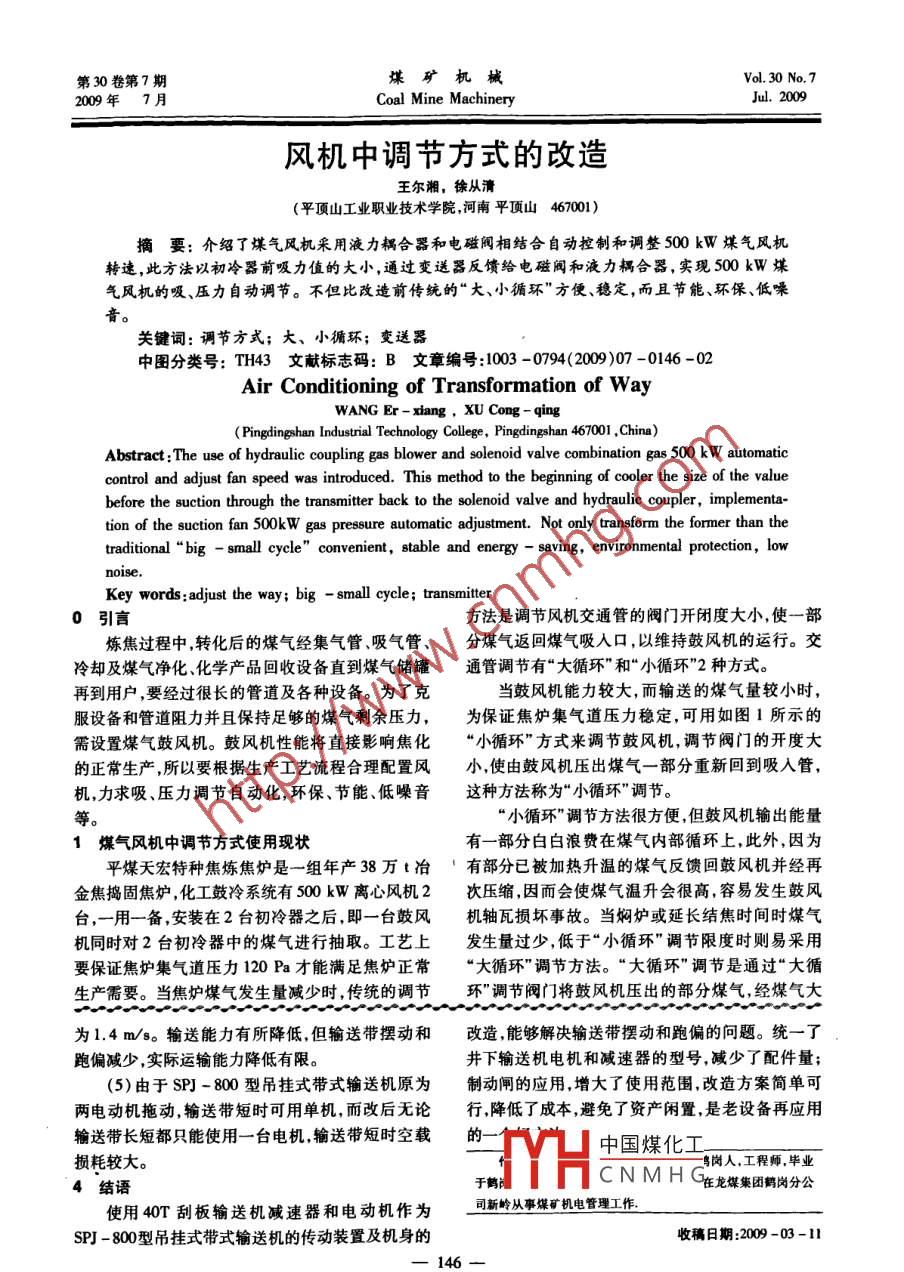 第30卷第7期煤礦機(jī)械Vol 30 No. 7009年7月Coal Mine MachineryJu.2009風(fēng)機(jī)中調(diào)節(jié)方式的改造王爾潮,徐從清(平頂山工業(yè)職業(yè)技術(shù)學(xué)院河南平頂山467001)摘要:介紹了煤氣風(fēng)機(jī)采用液力耦合器和電磁閥相結(jié)合自動控制和調(diào)整500kW煤氣風(fēng)機(jī)轉(zhuǎn)速,此方法以初冷器前吸力值的大小,通過變送器反饋給電磁閥和液力耦合器,實(shí)現(xiàn)500kW煤氣風(fēng)機(jī)的吸、壓力自動調(diào)節(jié)。不但比改造前傳統(tǒng)的“大、小循環(huán)”方便、穩(wěn)定,而且節(jié)能、環(huán)保、低噪關(guān)鍵詞:調(diào)節(jié)方式;大、小循環(huán);變送器中圖分類號:TH43文獻(xiàn)標(biāo)志碼:B文章編號:1003-0794(2009)07-0146-02Air Conditioning of Transformation of WayWANG Er-xiang, XU Cong-qingPingdingshan Industrial Technology College, Pingdingshan 467001, China)Abstract: The use of hydraulic coupling gas blower and solenoid valve combination gas 500 kW automaticcontrol and adjust fan speed was introduced. This method to the beginning of cooler the size of the valuebefore the suction through the transmitter back to the solenoid valve and hydraulic coupler, implementation of the suction fan 500k W gas pressure automatic adjustment. Not only transform the former than thetraditional"big -small cycle"convenient, stable and energy-saving, environmental protection, lowKey words: adjust the way: big -small cycle; transmitter0引言方法是調(diào)節(jié)風(fēng)機(jī)交通管的閥門開閉度大小,使一部煉焦過程中,轉(zhuǎn)化后的煤氣經(jīng)集氣管、吸氣管、分煤氣返回煤氣吸入口,以維持鼓風(fēng)機(jī)的運(yùn)行。交冷卻及煤氣凈化、化學(xué)產(chǎn)品回收設(shè)備直到煤氣儲罐通管調(diào)節(jié)有“大循環(huán)”和“小循環(huán)”2種方式。再到用戶,要經(jīng)過很長的管道及各種設(shè)備。為了克當(dāng)鼓風(fēng)機(jī)能力較大,而輸送的煤氣量較小時服設(shè)備和管道阻力并且保持足夠的煤氣剩余壓力,為保證焦?fàn)t集氣道壓力穩(wěn)定,可用如圖1所示的需設(shè)置煤氣鼓風(fēng)機(jī)。鼓風(fēng)機(jī)性能將直接影響焦化“小循環(huán)”方式來調(diào)節(jié)鼓風(fēng)機(jī),調(diào)節(jié)閥門的開度大的正常生產(chǎn)所以要根據(jù)生產(chǎn)工藝流程合理配置風(fēng)小,使由鼓風(fēng)機(jī)壓出煤氣一部分重新回到吸入管機(jī),力求吸、壓力調(diào)節(jié)自動化,環(huán)保、節(jié)能、低噪音這種方法稱為“小循環(huán)”調(diào)節(jié)。小循環(huán)”調(diào)節(jié)方法很方便,但鼓風(fēng)機(jī)輸出能量煤氣風(fēng)機(jī)中調(diào)節(jié)方式使用現(xiàn)狀有一部分白白浪費(fèi)在煤氣內(nèi)部循環(huán)上,此外,因為平煤天宏特種焦煉焦?fàn)t是一組年產(chǎn)38萬t冶有部分已被加熱升溫的煤氣反饋回鼓風(fēng)機(jī)并經(jīng)再金焦搗固焦?fàn)t,化工鼓冷系統(tǒng)有500kW離心風(fēng)機(jī)2次壓縮,因而會使煤氣溫升會很高,容易發(fā)生鼓風(fēng)臺,一用一備,安裝在2臺初冷器之后,即一臺鼓風(fēng)機(jī)軸瓦損壞事故。當(dāng)燜爐或延長結(jié)焦時間時煤氣機(jī)同時對2臺初冷器中的煤氣進(jìn)行抽取。工藝上發(fā)生量過少,低于“小循環(huán)”調(diào)節(jié)限度時則易采用要保證焦?fàn)t集氣道壓力120Pa才能滿足焦?fàn)t正?!按笱h(huán)”調(diào)節(jié)方法?!按笱h(huán)”調(diào)節(jié)是通過“大循生產(chǎn)需要。當(dāng)焦?fàn)t煤氣發(fā)生量減少時,傳統(tǒng)的調(diào)節(jié)環(huán)”調(diào)節(jié)閥門將鼓風(fēng)機(jī)壓出的部分煤氣,經(jīng)煤氣大為1.4m/s。輸送能力有所降低,但輸送帶擺動和改造,能夠解決輸送帶擺動和跑偏的問題。統(tǒng)一了跑偏減少,實(shí)際運(yùn)輸能力降低有限。井下輸送機(jī)電機(jī)和減速器的型號,減少了配件量(5)由于SPJ-800型吊掛式帶式輸送機(jī)原為制動閘的應(yīng)用,增大了使用范圍,改造方案簡單可兩電動機(jī)拖動輸送帶短時可用單機(jī),而改后無論行,降低了成本,避免了資產(chǎn)閑置,是老設(shè)備再應(yīng)用輸送帶長短都只能使用一臺電機(jī)輸送帶短時空載的中國煤化工損耗較大。鳥崗人,工程師,畢業(yè)結(jié)語于鶴HCNMH在龍媒集團(tuán)鶴崗分公使用40T刮板輸送機(jī)減速器和電動機(jī)作為司新嶺從事煤礦機(jī)電管理工作P-800型吊掛式帶式輸送機(jī)的傳動裝置及機(jī)身的收稿日期:2009-03-11Vol. 30No. 7風(fēng)機(jī)中調(diào)節(jié)方式的改造—王爾湘,等第30卷第7期循環(huán)管送到初冷器前的煤氣管道中,經(jīng)過冷卻后再回到鼓風(fēng)機(jī)去。根據(jù)實(shí)際經(jīng)驗獲知,當(dāng)煤氣量為電動機(jī)鼓風(fēng)機(jī)額定能力的1/4~1乃3時,就需要采用煤氣合器大循環(huán)”調(diào)節(jié)措施。顯然“大循環(huán)調(diào)節(jié)方法可較好地解決煤氣升溫過高的問題,但同樣存在鼓風(fēng)機(jī)變遠(yuǎn)箱能量的損耗,同時還會增加初冷器的負(fù)荷及低溫水的用量。如圖2所示為“大循環(huán)”調(diào)節(jié)法。而“大、沖心工風(fēng)機(jī)電磁小循環(huán)”調(diào)節(jié)方法都是通過煤氣風(fēng)機(jī)出口管道,把部分煤氣反饋到人口,這部分煤氣始終在做無用圖3煉焦鼓冷系統(tǒng)控制示意圖功。一般煤氣風(fēng)機(jī)在選型時要比實(shí)際焦?fàn)t煤氣發(fā