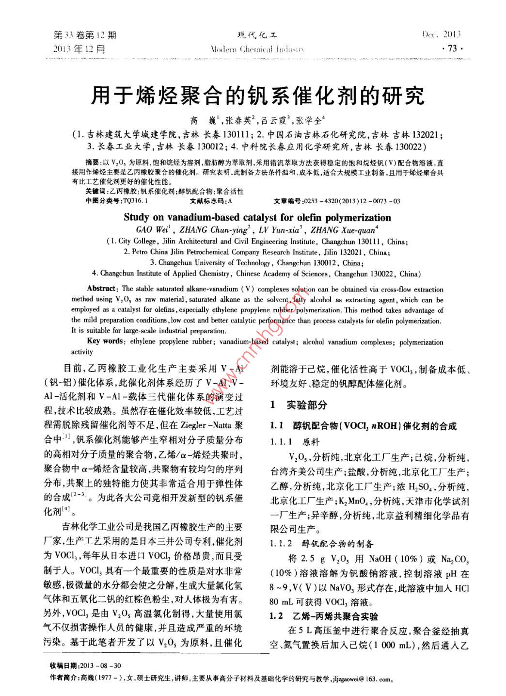 第33卷第12期現(xiàn)代化工Dee.20132013年12月\lodem Chenical iudustn73.用于烯烴聚合的釩系催化劑的研究高巍',張春英”,呂云霞',張學(xué)全*(1.吉林建筑大學(xué)城建學(xué)院,吉林長春130111;2.中國石油吉林石化研究院,吉林吉林132021;3.長春工業(yè)大學(xué),吉林長春130012;4.中科院長春應(yīng)用化學(xué)研究所,吉林長春13022)摘要:以V20s為原料,飽和烷烴為溶劑脂肪醇為萃取劑,采用錯流萃取方法獲得穩(wěn)定的飽和烷烴釩(V)配合物溶液,直接用作烯烴主要是乙丙橡膠聚合的催化劑。研究表明此制備方法條件溫和成本低,適合大規(guī)模工業(yè)制備.且用于烯烴聚合具有比工藝催化劑更好的催化性能。關(guān)鍵詞:乙丙橡膠;釩系催化劑;醇釩配合物;聚合活性中團(tuán)分類號:TQ316.1文獻(xiàn)標(biāo)志碼:A .文章編號:0253 - 4320(2013)12 -0073 -03Study on vanadium-based catalyst for olefin polymerizationGAO Wei , ZHANG Chun-ying , LV Yun-xia', ZHANG Xue-quan*(1. City College , Jilin Architectural and Civil Engineering Institute, Changchun 130111, China;2. Petro China Jilin Petrochemical Company Research Institute , Jilin 132021, China;3. Changchun University of Technology, Changchun 130012, China;4. Changchun Institute of Applied Chemistry, Chinese Academy of Sciences, Changchun 130022, China)Abstract: The stable saturated alkane-vanadium ( V) complexes solution can be obtained via cross-low extractionmethod using V2O3 as raw material , saturated alkane as the solvent, fatty alcohol as extracting agent, which can beemployed as a catalyst for olefins , espeially ethylene propylene rubber polymerization. This method takes advantage ofthe mild preparation conditions , low cost and better catalytic performance than process catalysts for olefin polymerization.It is suiable for large-scale industrial preparation.Key words: ethylene propylene rubber; vanadium-based catalyst; alcohol vanadium complexes; polymerizationactivity目前,乙丙橡膠工業(yè)化生產(chǎn)主要采用V-AI劑能溶于己烷,催化活性高于VOC],制備成本低、(釩-鋁)催化體系,此催化劑體系經(jīng)歷了V-A1、V-環(huán)境友好、穩(wěn)定的釩醇配體催化劑。Al-活化劑和V-Al-載體三代催化體系的演變過1實驗部分程,技術(shù)比較成熟。雖然存在催化效率較低,工藝過程需脫除殘留催化劑等不足,但在Ziegler-Natta聚1.1醇釩配合物 ( Voal, nROH)催化劑的合成合中”,釩系催化劑能夠產(chǎn)生窄相對分子質(zhì)量分布.1.1.1 原料的高相對分子質(zhì)量的聚合物,乙烯/a -烯烴共聚時,V2O, ,分析純,北京化工廠生產(chǎn);已烷,分析純,聚合物中a-烯烴含量較高,共聚物有較均勻的序列臺灣齊美公司生產(chǎn);鹽酸,分析純,北京化工廠生產(chǎn);分布,共聚上的獨特能力使其非常適合用于彈性體乙醇,分析純,北京化工廠生產(chǎn);濃H,SO,分析純,的合成(2-31。為此各大公司竟相開發(fā)新型的釩系催北京化工廠生產(chǎn);K2MnO, ,分析純,天津市化學(xué)試劑化劑|4)。一廠生產(chǎn);異辛醇,分析純,北京益利精細(xì)化學(xué)品有吉林化學(xué)工業(yè)公司是我國乙丙橡膠生產(chǎn)的主要限公司生產(chǎn)。廠家,生產(chǎn)工藝采用的是日本三井公司專利,催化劑1.1.2醇釩配合物的制備為VOCl; ,每年從日本進(jìn)口VOCl,價格昂貴,而且受將2.5 g V20, 用NaOH(10%)或Na2CO,制于人。VOCl,具有一個最重要的性質(zhì)是對水非常(10%)溶液溶解為釩酸鈉溶液,控制溶液pH在敏感,極微量的水分都會使之分解,生成大量氯化氫8 ~9,V( V )以NaVO,形式存在,此溶液中加入HCI氣體和五氧化二釩的紅粽色粉塵,對人體極為有害。80 mL可獲得VOCl,溶液。另外,VOCl3是由V20s高溫氯化制得,大量使用氯.2 乙烯-丙烯共聚合實驗氣不僅損害操作人員的健康,并且造成嚴(yán)重的環(huán)境在5L高壓釜中進(jìn)行聚合反應(yīng),聚合釜經(jīng)抽真污染?;诖斯P者開發(fā)了以V203為原料,且催化空、氮氣置換后加入已烷(1 000 mL), 然后通人乙收稿日期:2013 -08 -30作者簡介:高巍(1977- ),女,碩土研究生,講師,主要從事高分子材料及基礎(chǔ)化學(xué)的研究與教學(xué)jzgaowei@e 163. com?!?4.現(xiàn)代化工第33卷第12期烯、丙烯、氫氣混合氣體,流速穩(wěn)定后加入催化劑,反表1不同的醇配體對催化效率的影響應(yīng)1 h后停止,放出膠液,用質(zhì)量分?jǐn)?shù)為20%的n(A)/n(V) =30n(A1)/n(V) =50NaOH溶液洗滌數(shù)次,將聚合物在50C下真空干燥催化效率/制得樣品。釩催化劑類型產(chǎn)量/[kg( PE).[kg(PE).gg~"'(V)]g~'(V)]2結(jié)果表征VOCl,.n(異辛醇) 5.462.146.512. 562.1釩醇配合物結(jié)構(gòu)分析VOCl3.n(異戊醇)4.701.856.252.45以釩的異辛醇配合物為例:通過紅外光譜測試VOCl;.n(仲辛醇)3. 241. 275.102.00可見,異辛醇在3337 cm~處的羥基(- -OH)峰消VOCl3 °n(正辛醇)3. 181.263.501.37失,相應(yīng)地在951 cm-'處的VO峰增強(qiáng),說明羥基VOCl,2. 300.912.190.86(-0H).上的氧幾乎完全與釩配位,如圖1所示。、釩醇配合物醇)及仲醇(仲辛醇)作配體的催化活性。原因是(以異辛醇為例)異構(gòu)醇結(jié)構(gòu)中的乙基給電子基使1734 cm'! HO醇_上的氧原子電荷密度增大'5],有利于與釩金屬配異辛醇951 cm! vo位,且配位鍵0-→V的能力較強(qiáng),使釩的活性中心穩(wěn)33 em-oH定,活性中心存在時間長,因而聚合活性也較高。因3600 2800 2000 1200而,選取與異辛醇形成的配合物作為研究對象。同波數(shù)/cm-時從表1的數(shù)據(jù)可見,VOCl, nROH催化劑的催化效圖1異辛醇、釩的異辛醇配合物的紅外光譜率為工業(yè)所用的VOCl, 催化劑催化效率