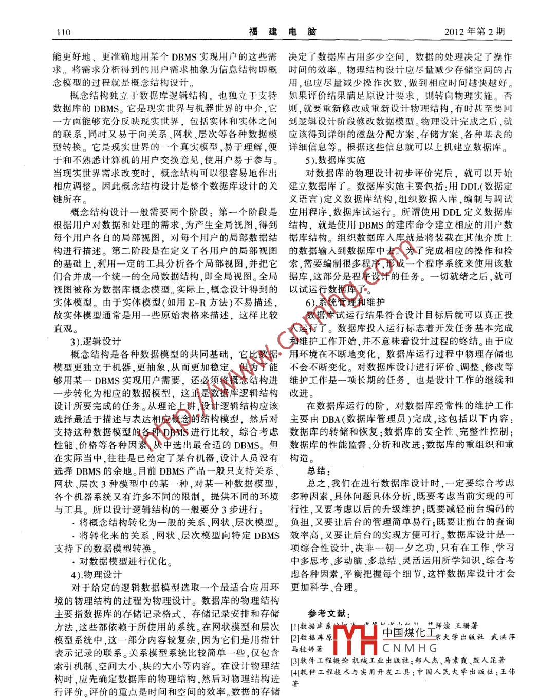2012年第2期福建電腦109數(shù)據(jù)庫設(shè)計(jì)陳艷,張冬姣(大連海洋大學(xué)職業(yè)技術(shù)學(xué)院電氣與信息工程系遼寧大連116300 )[摘 要]:數(shù)據(jù)庫技術(shù)是計(jì)算機(jī)科學(xué)中發(fā)展最快的領(lǐng)城之一,也是應(yīng)用最廣的技術(shù)之一, 它已成為計(jì)算機(jī)信息系統(tǒng)與應(yīng)用系統(tǒng)的核心技術(shù)和重要基礎(chǔ)。本文討論數(shù)據(jù)庫設(shè)計(jì),包括需求分析階段;概念設(shè)計(jì)階段;邏輯設(shè)計(jì)階段;物理設(shè)計(jì)階段;數(shù)據(jù)庫實(shí)施階段;數(shù)據(jù)庫運(yùn)行維護(hù)階段的六個(gè)階段。[關(guān)鍵詞]: 數(shù)據(jù)庫設(shè)計(jì),數(shù)據(jù)冗余,DBMS0、引言是指用戶需要從數(shù)據(jù)庫中獲得信息的內(nèi)容與性質(zhì)。由為什么需要設(shè)計(jì)數(shù)據(jù)庫?我們思考兩個(gè)問題,修建用戶 的信息要求可以導(dǎo)出數(shù)據(jù)要求,即在數(shù)據(jù)庫中需茅屋需要設(shè)計(jì)嗎?修建大廈需要設(shè)計(jì)嗎?結(jié)論是:當(dāng)數(shù)要 存儲(chǔ)哪些數(shù)據(jù)。處理要求是指用戶要求完成什么處據(jù)庫比較復(fù)雜(如數(shù)據(jù)量大,表較多,業(yè)務(wù)關(guān)系復(fù)雜)理功能 ,對處理的響應(yīng)時(shí)間有什么要求,處理方式是批時(shí),我們需要先設(shè)計(jì)數(shù)據(jù)庫。處理還是聯(lián)機(jī)處理。新系統(tǒng)的功能必須滿足用戶的信近年來,隨著多媒體技術(shù)和計(jì)算機(jī)網(wǎng)絡(luò)的飛速發(fā)息要求,處理要求,安全性和完整性要求。展,數(shù)據(jù)庫系統(tǒng)的發(fā)展十分迅速,應(yīng)用領(lǐng)域愈來愈廣,需求分析是整個(gè)設(shè)計(jì)過程的基礎(chǔ),是最困難最耗企事業(yè)單位、政府部門的行政管理、辦公自動(dòng)化;銀行時(shí)的一步。 作為“地基"的需求分析是否做得充分與準(zhǔn)財(cái)務(wù)管理;鐵路、民航飛機(jī)票預(yù)定系統(tǒng);鐵路車次調(diào)度確 ,決定了在其上構(gòu)建“數(shù)據(jù)庫大廈”的速度與質(zhì)量。這系統(tǒng);賓館、酒店房間預(yù)定系統(tǒng);人口普查;氣象預(yù)報(bào);一 階段的工作是否能準(zhǔn)確地反映實(shí)際系統(tǒng)的信息流程地震,勘探等大量數(shù)據(jù)的貯存和統(tǒng)計(jì)分析,其背后都是情況 和用戶對數(shù)據(jù)庫系統(tǒng)的要求,直接影響到以后各一個(gè)規(guī)模巨大的數(shù)據(jù)庫。階段的工作,并影響到數(shù)據(jù)庫系統(tǒng)將來運(yùn)行的效率,需良好的數(shù)據(jù)庫設(shè)計(jì)能夠節(jié)省數(shù)據(jù)的存儲(chǔ)空間,能求分析做得不好 ,可能會(huì)導(dǎo)致整個(gè)數(shù)據(jù)庫重新設(shè)計(jì),因夠保證數(shù)據(jù)的完整性,能夠方便進(jìn)行數(shù)據(jù)庫應(yīng)用系統(tǒng)此,務(wù)必引起高度重視。的開發(fā)。糟糕的數(shù)據(jù)庫設(shè)計(jì),會(huì)有數(shù)據(jù)冗余、存儲(chǔ)空間應(yīng)用需求需求收集和分析需求分析階段浪費(fèi),內(nèi)存空間浪費(fèi),使得數(shù)據(jù)更新和插人異常。(數(shù)據(jù)、處如何合理高效地設(shè)計(jì)數(shù)據(jù)庫已成為當(dāng)務(wù)之急。好轉(zhuǎn)換規(guī)則概念設(shè)計(jì)階段的靈活的數(shù)據(jù)庫設(shè)計(jì),既能給前臺(tái)應(yīng)用程序的設(shè)計(jì)帶DBMS功能設(shè)計(jì)概念結(jié)構(gòu)來簡便,又能給后臺(tái)數(shù)據(jù)庫的編碼和擴(kuò)充以及系統(tǒng)的優(yōu)化方法維護(hù)帶來極大的便利?,F(xiàn)在關(guān)系型數(shù)據(jù)庫已成為業(yè)界設(shè)計(jì)邏輯結(jié)構(gòu)的主流,而我們討論的也主要是基于關(guān)系型數(shù)據(jù)庫的。邏輯設(shè)計(jì)階段C數(shù)據(jù)模型優(yōu)化 _1、數(shù)據(jù)庫設(shè)計(jì)一一般將數(shù)據(jù)庫設(shè)計(jì)分為以下六階段:需求分析階DBMS詳細(xì)特征設(shè)計(jì)物理結(jié)構(gòu)段;概念設(shè)計(jì)階段;邏輯設(shè)計(jì)階段;物理設(shè)計(jì)階段;數(shù)據(jù)無理設(shè)計(jì)階段[平面設(shè)計(jì)、 性能預(yù)測庫實(shí)施階段;數(shù)據(jù)庫運(yùn)行維護(hù)階段。(如圖1:數(shù)據(jù)庫設(shè)計(jì)流程圖)物理實(shí)現(xiàn)在數(shù)據(jù)庫設(shè)計(jì)開始之前,數(shù)據(jù)庫設(shè)計(jì)人員將始終數(shù)據(jù)庫參與數(shù)據(jù)庫設(shè)計(jì),他們的水平直接影響了數(shù)據(jù)庫系統(tǒng)實(shí)驗(yàn)性運(yùn)行實(shí)施階段的質(zhì)量:用戶在數(shù)據(jù)庫設(shè)計(jì)中也舉足輕重的,他們主要十參加需求分析和數(shù)據(jù)庫的運(yùn)行維護(hù),他們的積極參與使用、 維護(hù)數(shù)據(jù)庫數(shù)據(jù)庫運(yùn)行不但能加速數(shù)據(jù)庫設(shè)計(jì),而且是決定數(shù)據(jù)庫設(shè)計(jì)的質(zhì)維護(hù)階段量的又一因素。程序員和操作人員則在系統(tǒng)實(shí)施階段中國煤化工參與進(jìn)來,分別負(fù)責(zé)編制程序和準(zhǔn)備軟硬環(huán)境。1).需求分析2).概念設(shè)計(jì)MYHCNMHG進(jìn)行數(shù)據(jù)庫設(shè)計(jì)首先必須準(zhǔn)確了解與分析用戶需在需求分析階段數(shù)據(jù)庫設(shè)計(jì)人員充分調(diào)查并描述求,設(shè)計(jì)者和用戶雙方要密切合作,在系統(tǒng)分析過程了用戶的應(yīng)用需