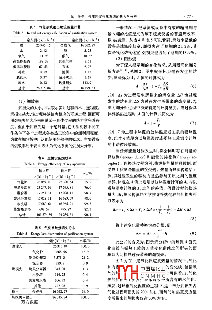 第35卷第2期化學(xué)工程Vol. 35 No.22007年2月CHEMICAL ENCINEERING( CHINA)Feb. 2007氣流床煤氣化系統(tǒng)的熱力學(xué)分析汪洋,于廣鎖,代正華,梁欽鋒,于遵宏(華東理工大學(xué)潔凈煤技術(shù)研究所,上海200237)摘要:在使用Aspen Plus對激冷型氣流床煤氣化系統(tǒng)進(jìn)行模擬和優(yōu)化的基礎(chǔ)上,采用熱力學(xué)分析方法,對氣化系統(tǒng)進(jìn)行了能量衡算和朔量衡算。計算結(jié)果表明,系統(tǒng)中炯損失最大的過程是化學(xué)能轉(zhuǎn)變?yōu)槲锢砟艿倪^程。洗滌冷卻室是炯損失最大的設(shè)備,擁損失占了總擁的21.2% ;其次是氣化爐氣化室,占到了總擁的13. 9% ,氣化室的擁損失主要發(fā)生在水的汽化等過程中,這一部分擁損失占?xì)饣^程擁損失的70%左右,而氧氣加熱至反應(yīng)溫度所帶來的煳損失僅占30%左右。采用傭分析方法可以更準(zhǔn)確地揭示系統(tǒng)中棚損失最大的環(huán)節(jié)和過程,為改進(jìn)設(shè)備、節(jié)約能源提供目標(biāo)和對策。關(guān)鍵詞:氣流床煤氣化;能分析;爛分析中圖分類號:TQ 54文獻(xiàn)標(biāo)識碼:A文章編號:1005-9954( 2007 )02-0075-04Thermodynamic analysis of entrained-flow coal gasification systemWANG Yang, YU Guang-suo , DAI Zheng hua ,LIANG Qin-feng, YU Zun-hong( Institute of Clean Coal Technology , East China University of Science and Technology , Shanghai 200237 ,China)Abstract : Based on the simulation and optimization results of quenching entrained-flow coal gasification process withAspen Plus,thermodynamic analysis was applied to calculate energy distribution and exergy distribution of thegasification system. The results show that the process with the maximal exergy ]oss is chemical energy transforminginto physical energy. The equipment with the maximum exergy loss is scrubbing cooling chamber, sharing 21. 2%of total input exergy ; the second is gasifier, with exergy loss sharing 13. 9%,and 70% of exergy loss in gasifierroot in vaporization of water, the temperature rise of oxygen result in the other 30%. By using exergy analysismethod, it can be more accurate and convenient to uncover the process with the maximal exergy loss so as to set uptarget and provide suggestion of equipment rebuilding and energy saving.Key words :entained-low gasification; energy analysis; exergy analysis自20世紀(jì)70年代以來,由于能源短缺,迫使人析的方法 ,對氣化系統(tǒng)進(jìn)行了能量衡算和炯量衡算,們不得不認(rèn)真地研究各種運(yùn)動形態(tài)能量的開發(fā)和利為提高過程效率提供理論基礎(chǔ)。用,“炯”的概念引起人們的重視‘。此后,在基本概念(基準(zhǔn)態(tài))環(huán)境模型的建立、擁值計算、能級分1系統(tǒng)炯分析方法析等理論研究方面得到迅速發(fā)展,擁方法趨于成熟,擁的定義是:一定形式的能量或一定狀態(tài)的物工程應(yīng)用逐漸展開。通過對生產(chǎn)工藝系統(tǒng)的擁分質(zhì), 經(jīng)過完全可逆的變化過程后(傳熱、傳質(zhì)、化學(xué)析,可以展示系統(tǒng)用炯狀況,揭示擁損分布規(guī)律,由反應(yīng)等) ,達(dá)到與環(huán)境完全平衡的狀態(tài),在這個過程此得到對系統(tǒng)能量和能質(zhì)利用的科學(xué)評價。目前,中該能量或物質(zhì)所能做的最大功稱為擁,用符號E,在石化、石油、動力、冶金制冷等技術(shù)領(lǐng)域以及能源表示。擁概念是通過熱力學(xué)第二定律揭示的,對于等管理部門,以傭方法評價和指導(dǎo)用能實踐,已獲得日量不同溫度的熱能,其能質(zhì)差表現(xiàn)為擁的差”。依據(jù)益廣泛的應(yīng)用。.熱力學(xué)中國煤化工的做功能力為本文在基于Aspen Plus對激冷型氣流床煤氣化系統(tǒng)進(jìn)行模擬和優(yōu)化的基礎(chǔ).上,首次采用熱力學(xué)分TYHCNMHG(1)基金項目:國家重點基礎(chǔ)研究發(fā)展計劃資助項目(2004CB217707) ;國家高技術(shù)研究發(fā)展計劃資助項目(2003AA521020) ;上海市青年科技啟明星計劃資助項目(03QF14013)作者簡介;汪洋( 1980-) ,男,碩士研究生,研究方向為過程系統(tǒng)工程:于廣鎖,通訊聯(lián)系人,E-mail: gyu@ ecusl. edu. cn?!?6●化學(xué)工程2007 年第35卷第2期式(1)表示溫度為T的熱量Q利用卡諾機(jī)和低3氣化系統(tǒng)的熱力學(xué)分析溫?zé)嵩碩??勺龀龅淖畲蠊?不同溫度熱能的做功能(1)物質(zhì)的基準(zhǔn)炯計算力不同,溫度越高,做功能力越大,其價值也就越大,物理炯選用的基準(zhǔn)條件為25 C、101 325 Pa。因此,熱量的做功能力反映了等量、不等溫?zé)崮茉谀艽藭r,各類物質(zhì)的物理炯為0。質(zhì)上的差別,擁分析理論中稱W..為熱量Q具有的在計算化學(xué)炯時,除了物理條件外,還必須選定基擁,式中To為環(huán)境溫度。準(zhǔn)物質(zhì)。到目前為止,在分析理論中,選定水空氣等用傭定義不同溫度、壓力物質(zhì)的能質(zhì)差別,即讓在自然界廣泛存在而且化學(xué)穩(wěn)定性很好的物質(zhì)作為基具有參數(shù)H、S的流體經(jīng)歷可逆過程通過某一物系,準(zhǔn)物質(zhì),可以確保所有物質(zhì)的化學(xué)擁不出現(xiàn)負(fù)值。在此過程中,對外做功W與環(huán)境交換熱量Q最終達(dá)(2)煤的炯值計算到與環(huán)境平衡。流體經(jīng)歷這樣的過程對外做出的對整個氣流床煤氣化系統(tǒng)的熱力學(xué)分析均基于功,即稱為具有參數(shù)H、S流體的擁。根據(jù)熱力學(xué)第1 kg 北宿煤(干基) ,煤質(zhì)分析見表 1。一定律得國H=H。+W+Q(2)表1工業(yè)分析和元素 分析(質(zhì)量分?jǐ