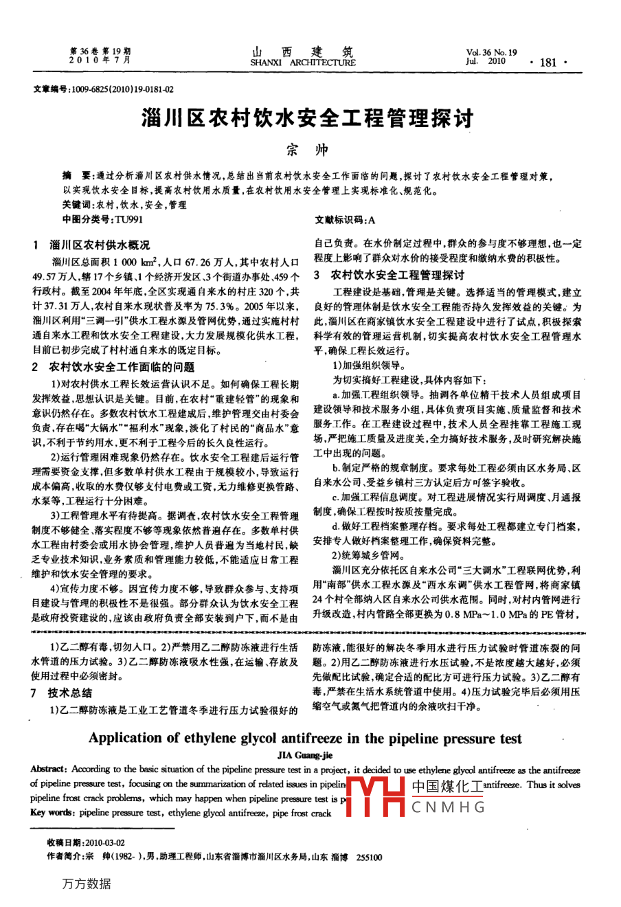 第36卷第19山西建筑2010年7SHANXI ARCHITECTURE文章編號(hào):10096825(2010】19018002乙二醇防凍液在管道壓力試驗(yàn)中的應(yīng)用賈廣杰擴(kuò)要:根據(jù)某工程管道進(jìn)行壓力試驗(yàn)的基本情況,決定選用乙二醇作為管道壓力試驗(yàn)的防凍液,重點(diǎn)對(duì)乙二醇防凍液進(jìn)行壓力試驗(yàn)的相關(guān)問(wèn)題作了歸納,解決了工藝管道冬季進(jìn)行壓力試驗(yàn)時(shí)管道凍裂的問(wèn)題關(guān)鍵詞:管道壓力試驗(yàn),乙二醇防凍液,管道凍裂中圖分類號(hào):TU991.36文獻(xiàn)標(biāo)識(shí)碼:A某工程工藝管道包括硫酸系統(tǒng)、硝酸系統(tǒng)氫氟酸系統(tǒng)蒸汽1009%(體積比)配好的乙二醇水溶液做好標(biāo)簽分為兩組,一組放冷凝水系統(tǒng)、工業(yè)水系統(tǒng)軟水系統(tǒng)及生活水系統(tǒng)輸送的介質(zhì)有入大熱線酸洗段車間內(nèi)溫度最低的地方另一組放在車間外風(fēng)口硫酸硝酸氫氟酸、工業(yè)水、蒸汽軟水及生活水,管道材質(zhì)選擇最冷的地方連續(xù)兩天夜間做試驗(yàn)(見(jiàn)圖1)。為:酸系統(tǒng)管道主要使用PPH管和鋼+PIFE管,其他系統(tǒng)管道主要使用不銹鋼304L管和碳鋼Q235A。車間外車間內(nèi)1施工難點(diǎn)濃度(15%)濃度(15%)當(dāng)該工程管道基本安裝完畢時(shí)需要盡快進(jìn)行壓力試驗(yàn)及沖洗(吹掃),否則將會(huì)嚴(yán)重影響整體工程的試車運(yùn)行,造成整體工程拖期。管道要進(jìn)行壓力試驗(yàn),PPH管道屬于脆性材料禁止使用圖1乙二醇配比試驗(yàn)氣體進(jìn)行;管道用水進(jìn)行壓力試驗(yàn)要求環(huán)境溫度必須在5℃以3)試驗(yàn)時(shí)環(huán)境溫度:第一夜車間外環(huán)境溫度為-16.5℃;第上,此時(shí)施工現(xiàn)場(chǎng)環(huán)境溫度為-15℃~-20℃,管道此時(shí)進(jìn)行壓二夜車間外環(huán)境溫度為-18℃。力試驗(yàn)必須采取有效的防凍措施4)試驗(yàn)結(jié)果:車間內(nèi)25%和30%的乙二醇水溶液沒(méi)有結(jié)冰經(jīng)過(guò)反復(fù)研究,提出用水進(jìn)行壓力試驗(yàn)試驗(yàn)用水中加入防外,其余濃度的乙二醇溶液都不同程度的有結(jié)冰現(xiàn)象。車間外凍液30%的乙二醇水溶液沒(méi)有結(jié)冰外,其余濃度的乙二醇溶液都不同2防凍液的選擇程度的有結(jié)冰現(xiàn)象根據(jù)調(diào)查目前市場(chǎng)上防凍液有:z醇型丙三醇型及乙二醇4確定壓力試驗(yàn)乙二醇濃度及用量型三種。乙醇型,即酒精水溶液型防凍液,其沸點(diǎn)低、易蒸發(fā)、使根據(jù)以上試驗(yàn)確定使用30%的乙二醇水溶液作為壓力試驗(yàn)用中損失量大;丙三醇型其價(jià)格昂貴;乙二醇是目前最常用的汽介質(zhì)經(jīng)計(jì)算壓力試驗(yàn)用溶液體積為7m3,所需要的乙二醇用量車防凍液使用性能良好價(jià)格合理,因而選用乙二醇作為管道壓為21m3,考慮施工安全系數(shù)確定采購(gòu)25m3乙二醇。力試驗(yàn)的防凍液。5乙二醇防凍液配比試驗(yàn)3乙二醇防凍液配比試驗(yàn)按照30%配比配好7m3乙二醇水溶液放入密閉的容器內(nèi)1)試驗(yàn)月的確定管道進(jìn)行壓力試驗(yàn)時(shí)乙二醇水溶液體積比進(jìn)行管道壓力試驗(yàn),試驗(yàn)完畢后,用壓縮空氣或氮?dú)獍压艿纼?nèi)的濃度;確定臂道進(jìn)行壓力試驗(yàn)乙二醇的用量。余液沖洗干凈。2)試驗(yàn)方法按配比分別為15%,20%,25%,30%,35%,90%,6用乙二醇防凍液進(jìn)行壓力試驗(yàn)時(shí)應(yīng)注意的事項(xiàng)防泵房根據(jù)其發(fā)出的啟動(dòng)消防泵報(bào)警信號(hào)綜合不同消防系統(tǒng)其[2]GB50015-2003,建筑給水排水設(shè)計(jì)規(guī)范[S]他信號(hào)確定啟動(dòng)消火栓消防泵或自動(dòng)噴水消防泵。[3]2009全國(guó)民用建筑工程設(shè)計(jì)技術(shù)措施·給水排水[S]參考文獻(xiàn)[4]98≌05,消防增壓穩(wěn)壓設(shè)備選用與安裝(隔膜式氣壓罐)[1]GB5004595,高規(guī)民用建筑設(shè)計(jì)防火規(guī)范(2005年版)[S][S]Several problems about building superchargingand stabilizing charge equipments in internal fire fight systemYI Jia-song ZHOU XinAbstract: Combining with GB 50045-95 Fire Fighting Regulation for High-leued Civil Architectural Designs(2005 edition), the thesis discussed several problems about building supercharging and stabilizing charge equipments in intermal fire fighting system, introduced workingprinciples of supercharging and stabilizing charge equipments, illustrated theequipments in details, so as to guide practices, to make sure that correct and ratinal中國(guó)煤化工強(qiáng)dKey words: high-rise building, fire fighting system, supercharging and stabilizCN MH Gf designs收稿日期:20100306作者簡(jiǎn)介:賈廣杰(1978),男助理工程師山西鋼鐵建設(shè)(集團(tuán))有限公司,山西太原030024263率山西vo.36No.19SHANXI ARCHITECTUJu.2010181·文章編號(hào):10096825(2010)19018102淄川區(qū)農(nóng)村飲水安全工程管理探討宗帥摘要:通過(guò)分析淄川區(qū)農(nóng)村供水情況,總結(jié)出當(dāng)前農(nóng)村飲水安全工作面臨的問(wèn)題,探討了農(nóng)村飲水安全工程管理對(duì)策以實(shí)現(xiàn)飲水安全目標(biāo),提高農(nóng)村飲用水質(zhì)量,在農(nóng)村飲用水安全管理上實(shí)現(xiàn)標(biāo)準(zhǔn)化、規(guī)范化關(guān)鍵詞:農(nóng)村,飲水,安全,管理中圖分類號(hào):TU91文獻(xiàn)標(biāo)識(shí)碼:A1淄川區(qū)農(nóng)村供水概況自已負(fù)責(zé)。在水