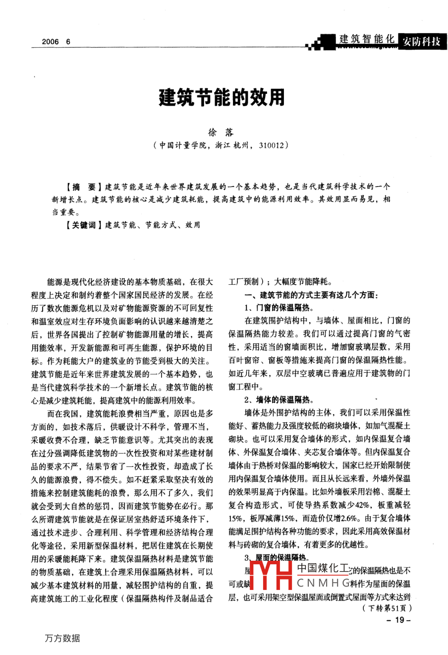 20066建筑智能化安防科技建筑節(jié)能的效用徐落(中國(guó)計(jì)量學(xué)院,淅江杭州,310012)【摘要】建筑節(jié)能是近年來(lái)世界建筑發(fā)展的一個(gè)基本趨勢(shì),也是當(dāng)代建筑科學(xué)技術(shù)的一個(gè)新增長(zhǎng)點(diǎn)。建筑節(jié)能的核心是減少建筑耗能,提高建筑中的能源利用效率。其效用顯而易見(jiàn),相當(dāng)重要?!娟P(guān)鍵詞】建筑節(jié)能、節(jié)能方式、效用能源是現(xiàn)代化經(jīng)濟(jì)建設(shè)的基本物質(zhì)基礎(chǔ),在很大工廠預(yù)制);大幅度節(jié)能降耗。程度上決定和制約著整個(gè)國(guó)家國(guó)民經(jīng)濟(jì)的發(fā)展。在經(jīng)建筑節(jié)能的方式主要有這幾個(gè)方面歷了數(shù)次能源危機(jī)以及對(duì)礦物能源資源的不可回復(fù)性1、門(mén)窗的保溫隔熱。和溫室效應(yīng)對(duì)生存環(huán)境負(fù)面影響的認(rèn)識(shí)越來(lái)越清楚之在建筑圍護(hù)結(jié)構(gòu)中,與墻體、屋面相比,門(mén)窗的后,世界各國(guó)提出了控制礦物能源用量的增長(zhǎng),提高保溫隔熱能力較差。我們可以通過(guò)提高門(mén)窗的氣密用能效率,開(kāi)發(fā)新能源和可再生能源,保護(hù)環(huán)境的目性,采用適當(dāng)?shù)拇皦γ娣e比,增加窗玻璃層數(shù),采用標(biāo)。作為耗能大戶的建筑業(yè)的節(jié)能受到極大的關(guān)注。百葉窗簾、窗板等措施來(lái)提高門(mén)窗的保溫隔熱性能建筑節(jié)能是近年來(lái)世界建筑發(fā)展的一個(gè)基本趨勢(shì),也如近幾年來(lái),雙層中空玻璃已普遍應(yīng)用于建筑物的門(mén)是當(dāng)代建筑科學(xué)技術(shù)的一個(gè)新增長(zhǎng)點(diǎn)。建筑節(jié)能的核窗工程中心是減少建筑耗能,提高建筑中的能源利用效率。2、墻體的保溫隔熱。而在我國(guó),建筑能耗浪費(fèi)相當(dāng)嚴(yán)重,原因也是多墻體是外圍護(hù)結(jié)構(gòu)的主體,我們可以采用保溫性方面的,如技術(shù)落后,供暖設(shè)計(jì)不科學(xué),管理不當(dāng),能好、蓄熱能力及強(qiáng)度較低的砌塊墻體,如加氣混凝土采暖收費(fèi)不合理,缺乏節(jié)能意識(shí)等。尤其突出的表現(xiàn)砌塊。也可以采用復(fù)合墻體的形式,如內(nèi)保溫復(fù)合墻在過(guò)分強(qiáng)調(diào)降低建筑物的一次性投資和對(duì)某些建材制體、外保溫復(fù)合墻體、夾芯復(fù)合墻體等。但內(nèi)保溫復(fù)合品的要求不嚴(yán),結(jié)果節(jié)省了一次性投資,卻造成了長(zhǎng)墻體由于熱橋?qū)Ρ氐挠绊戄^大,國(guó)家已經(jīng)開(kāi)始限制使久的能源浪費(fèi),得不償失。如不趕緊采取堅(jiān)決有效的用內(nèi)保溫復(fù)合墻體使用。而且從長(zhǎng)遠(yuǎn)來(lái)看,外墻外保溫措施來(lái)控制建筑能耗的浪費(fèi),那么用不了多久,我們的效果明顯高于內(nèi)保溫。比如外墻板采用巖棉、混凝土就會(huì)受到大自然的懲罰,因而建筑節(jié)能勢(shì)在必行。那復(fù)合構(gòu)造形式,可使導(dǎo)熱系數(shù)減少42%,板重減輕么所謂建筑節(jié)能就是在保證居室熱舒適環(huán)境條件下,15%,板厚減薄15%,而造價(jià)僅增26%。由于復(fù)合墻體通過(guò)技術(shù)進(jìn)步、合理利用、科學(xué)管理和經(jīng)濟(jì)結(jié)構(gòu)合理能滿足圍護(hù)結(jié)構(gòu)各種功能的要求,因此采用高效保溫材化等途徑,采用新型保溫材料,把居住建筑在長(zhǎng)期使料與磚砌的復(fù)合墻體,有著更多的優(yōu)越性。用的采暖能耗降下來(lái)。建筑保溫隔熱材料是建筑節(jié)能3、屋面的保溫隔熱的物質(zhì)基礎(chǔ),在建筑上合理采用保溫隔熱材料,可以中國(guó)煤化工的保溫隔熱也是不減少基本建筑材料的用量,減輕圍護(hù)結(jié)構(gòu)的自重,提可或缺CNMHG料作為屋面的保溫高建筑施工的工業(yè)化程度(保溫隔熱構(gòu)件及制品適合層,也可采用架空型保溫屋面或倒置式屋面等方式來(lái)達(dá)到(下轉(zhuǎn)第51頁(yè))1安全技術(shù)與管理安防科技燃燒的沙發(fā),這樣火勢(shì)很容易發(fā)展起來(lái)。火勢(shì)通過(guò)包探測(cè)系統(tǒng),所以當(dāng)電熱器引燃周?chē)嘲l(fā)的時(shí)候,產(chǎn)生間向影廳迅速蔓延,恰好影廳放置的也是可燃性的座的濃煙沒(méi)有被及時(shí)探測(cè)到,延誤了報(bào)警、滅火時(shí)間椅,這樣火勢(shì)發(fā)展越來(lái)越快,到了不可控制的程度。要不然火災(zāi)就能消滅在萌芽狀態(tài)的。所以,從火災(zāi)發(fā)展來(lái)講,火勢(shì)能夠如此迅速蔓延,主②安全出口不暢通。這也是影響火災(zāi)發(fā)生后人員要?dú)w結(jié)于兩個(gè)大的原因:逃生的最大因素。本案例火災(zāi)中,由于影院播放黃色錄①火源自身溫度高,容易點(diǎn)燃周?chē)矬w。像,老板怕夜間公安機(jī)關(guān)過(guò)來(lái)查,于是把所有的出口通②室內(nèi)可燃物體多,助長(zhǎng)了火勢(shì)的蔓延道都封鎖了,以至于70多人活活的燒死在影院里面。火災(zāi)的迅速蔓延產(chǎn)生的高溫、熱輻射、有毒氣五、本次火災(zāi)的教訓(xùn)體,對(duì)人體也產(chǎn)生了巨大的危害,最終造成了人員的消防管理部門(mén)應(yīng)該對(duì)大型人員聚集場(chǎng)所進(jìn)行火死亡?;馂?zāi)中影響人員生命安全的因素作用于下圖:災(zāi)風(fēng)險(xiǎn)評(píng)價(jià),看建筑物的結(jié
