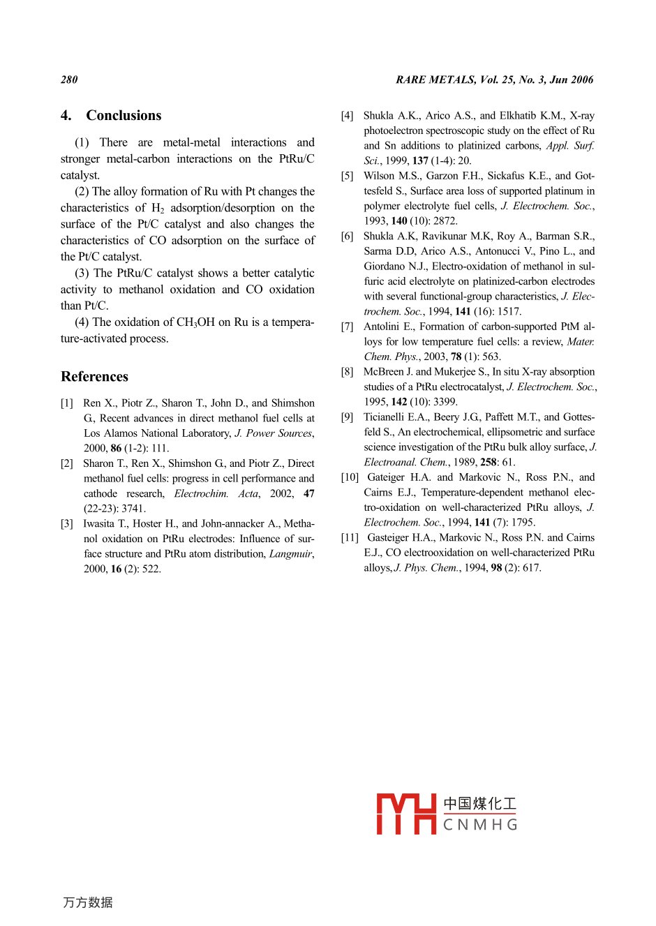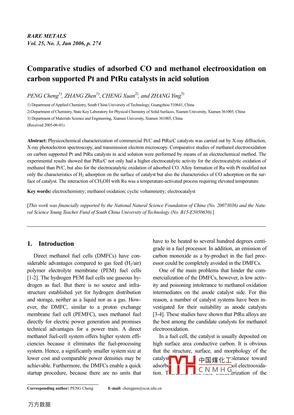 RARE METALSVol. 25, No. 3, Jun 2006, p. 274Comparative studies of adsorbed CO and methanol electrooxidation oncarbon supported Pt and PtRu catalysts in acid solutionPENG Cheng), ZHANG Zhen'", CHENG Xuan?, and ZHANG Ying'1) Department of Applied Chemistry, South China University ofTechnology, Guangzhou 510641, China2)Department of Chemitry, State Key Laboratory for Plhysical Chemistry of Solid Surfaces, Xiamen University, Xiamen 361005, China3) Department of Materials Science and Engineering, Xiamen University, Xiamen 361005, China(Received 2005-06-01)Abstract: Physicochemical characterization of commercial Pt/C and PtRu/C catalysts was carried out by X-ray diffraction,X-ray photoelectron spectroscopy, and transmission electron microscopy. Comparative studies of methanol electrooxidationon carbon supported Pt and PtRu catalysts in acid solution were performed by means of an eletrochemical method. Theexperimental results showed that PtRu/C not only had a higher electrocatalytic activity for the electrocatalytic oxidation ofmethanol than PUC, but also for the electrocatalytic oxidation of adsorbed CO. Alloy formation of Ru with Pt modified notonly the characteristics of H2 adsorption on the surface of catalyst but also the characteristics of CO adsorption on the sur-face of catalyst. The interaction of CH2OH with Ru was a temperature-activated process requiring elevated temperature.Key words: electrochemistry; methanol oxidation; cyclic voltammetry; electrocatalyst[This work was financially supported by the National Natural Science Foundation of China No.20073036) and the Natu-ral Science Young Teacher Fund of South China University of Technology (No. BI5-E5050650.]1. Introductionhave to be heated to several hundred degrees centi-grade in a fuel processor. In addition, an emission ofDirect methanol fuel cells (DMFCs) have con-carbon monoxide as a by-product in the fuel proc-siderable advantages compared to gas feed (H/air)essor could be completely avoided in the DMFCs.polymer electrolyte membrane (PEM) fuel cellsOne of the main problems that hinder the com-[1-2]. The hydrogen PEM fuel cells use gaseous hy-mercialization of the DMFCs, however, is low activ-drogen as fuel. But there is no source and infra-ity and poisoning intolerance to methanol oxidationstructure established yet for hydrogen distributionintermediates on the anode catalyst side. For thisand storage, neither as a liquid nor as a gas. How-reason, a number of catalyst systems have been in-ever, the DMFC, similar to a proton exchangevestigated for their suitability as anode catalystsmembrane fuel cell (PEMFC), uses methanol fuel[3-4]. These studies have shown that PtRu alloys aredirectly for electric power generation and promisesthe best among the candidate catalysts for methanoltechnical advantages for a power train. A directelectrooxidation.methanol fuel-cell system offers higher system effi-In a fuel cell, the catalyst is usually deposited onciencies because it eliminates the fuel-processinghigh surface area conductive carbon. It is obvioussystem. Hence, a significantly smaller system size atthat the structure, surface, and morphology of thelower cost and comparable power densities may becatalyst中國煤化工olerance towardachievable. Furthermore, the DMFCs enable a quickadsorbe5ol electrooxida-startup procedure, because there are no units thattion.YHCNMHG。....rization.. of theCorresponding author: PENG ChengE-mail: chengpen@scut.edu.cnPeng C. et al, Comparative studies of adsorbed CO and methanol electrooxidation on...275catalyst is of fundamental importance for the inter-made by proportionally mixing the catalysts withpretation of electrochemical properties. In this article,isopropanol, 5% Nafion solutions, and DI water.we present a comparative study of adsorbed CO andCamel hairbrushes were used to carefully paint themethanol electrooxidation on commercial catalystsinks onto the polished mirror-imaging surface of thePt/C and PtRu/C in acid solution, and at the sameGC electrode. After painting two to three layers, thetime, the physicochemical characterizations of theelectrode was dried (120°C, 1 h) and weighed againtwo catalysts are to be carried out by means of X-rayto obtain the catalyst loading.diffraction, X -ray photoelectron spectroscopy, andElectrochemical measurements were performedtransmission electron microscopy.using an Autolab general purpose electrochemicalsystem (Ecochemie, Netherlands). The data were2. Experimentalacquired with a personal computer. The solutionswere continuously purged by nitrogen gas for at2.1. Materialsleast 30 min before each measurement. The nitrogenGlassy carbon (GC) rods with a diameter of 5atmosphere was also maintained during the electro-mm and a length of 10 cm were purchased from Alfachemical measurement. Unless stated otherwise, allAesar. Commercial catalysts, 30% PtRu (1:1 inpotentials in this article are referred to the SCE.atomic ratio) and 40% Pt catalysts, both of whichwere supported on a high surface area conductive2.3. Characterization of catalystscarbon black (Vulcan XC-72)(E-TEK), and 5%X-ray diffraction (XRD) analysis was carried outNafion solutions were purchased from Du Pont. Thewith a Rigaku D/max-rC diffractometer usinga Cugases used in this work including nitrogen and car-Ka source. X-ray photoelectron spectroscopy (XPS)bon monoxide were of high purity (> 99.99%) andanalysis was performed using an Escalab MkII pho-the chemicals were of analytical grade. The deion-toelectron spectrometer. The X-ray source was Mgized water of 18 M9 was used to prepare all aque-Ka operating at a power of 22 W. XPS spectra wereous solutions.obtained with a pass energy of 50 eV for wide scansand 15 eV per individual elements.2.2. Electrochemical measurementsTransmission electron microscopy (TEM) analy-A conventional 3-electrode cell was used in elec-sis was performed with a JEOL JEM-100CX IItrochemical measurements. The working electrodeselectron microscope, working at 100 kV accelera
