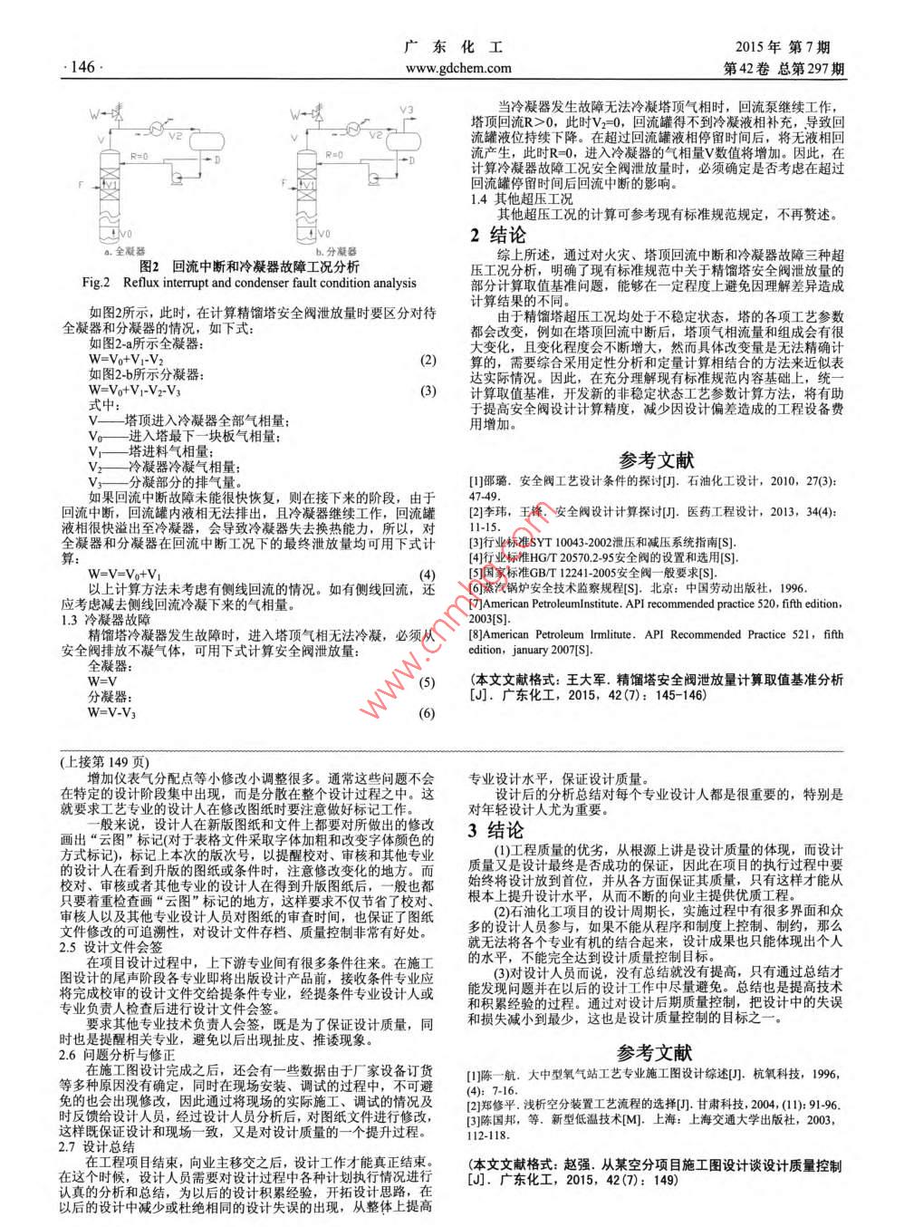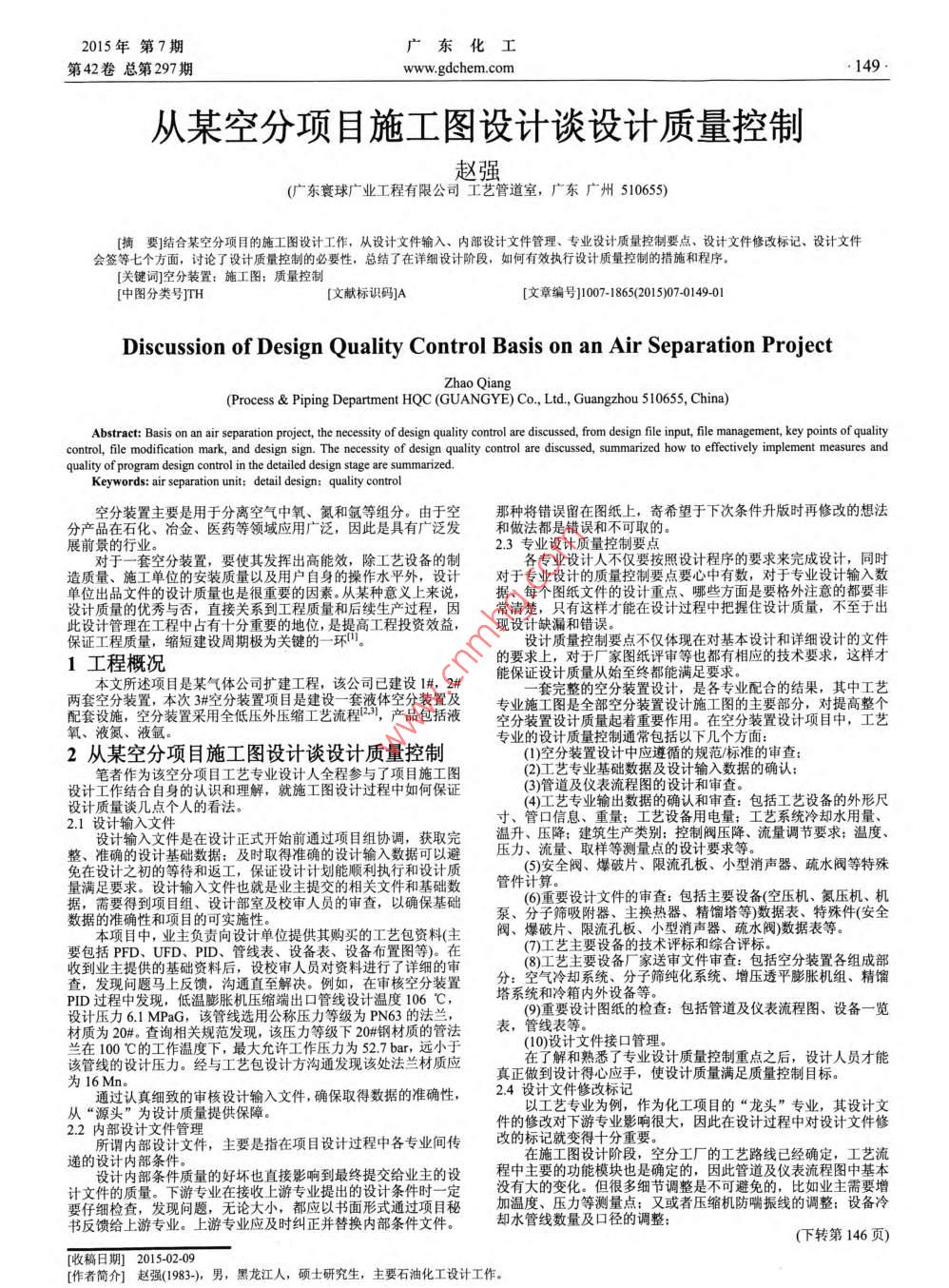 2015年第7期廣東化工第42卷總第297期www.gdchem.com149從某空分項目施工圖設計談設計質(zhì)量控制趙強(廣東寰球廣業(yè)工程有限公司工藝管道室,廣東廣州510655摘要]結(jié)合某空分項目的施工圖設計工作,從設計文件輸入、內(nèi)部設計文件管理、專業(yè)設計質(zhì)量控制要點、設計文件修改標記、設計文件會簽等七個方面,討論了設計質(zhì)量控制的必要性,總結(jié)了在詳細設計階段,如何有效執(zhí)行設計質(zhì)量控制的措施和程序鍵詞空分裝置:施工圖:質(zhì)量控制[中圖分類號]TH文獻標識碼]A[文章編號1007-1865(201507-014901Discussion of Design Quality Control Basis on an Air Separation Project(Process& Piping Department HQC (GUANGYE)Co, Ltd, Guangzhou 510655, China)Abstract: Basis on an air separation project, the necessity of design quality control are discussed, from design file input, file management, key points of qualitycontrol, file modificationn sign. The necessity of design quality control are discussed, summarized how to effectively implement measures andquality of program designtailed design stage are summarized.Keywords: air separation unitsign: quality control空分裝置主要是用于分離空氣中氧、氮和氬等組分。由于空那種將錯誤留在圖紙上,寄希望于下次條件升版時再修改的想法產(chǎn)品在石化、冶金、醫(yī)藥等領(lǐng)域應用廣泛,因此是具有廣泛發(fā)和做法都是錯誤和不可取的展前景的行業(yè)。23專業(yè)設計質(zhì)量控制要點施工單位的安裝質(zhì)量以及用戶自身的操作水平外,設計對于專業(yè)設計的質(zhì)量控制要點要心中有數(shù),對于專業(yè)設計輸入數(shù)品文件的設計質(zhì)量也是很重要的因素。從某種意義上來說,據(jù)、每個圖紙文件的設計重點、哪些方面是要格外注意的都要非量的優(yōu)秀與否,直接關(guān)系到工程質(zhì)量和后續(xù)生產(chǎn)過程,因此設計管理在工程中占有十分重要的地位,是提高工程投資效益,現(xiàn)設計缺漏和錯誤。保證工程質(zhì)量,縮短建設周期極為關(guān)鍵的一環(huán)設計質(zhì)量控制要點不僅體現(xiàn)在對基本設計和詳細設計的文件1工程概況的要求上,對于廠家圖紙評審等也都有相應的技術(shù)要求,這樣才能保證設計質(zhì)量從始至終都能滿足要求。③2置,木次空分裝置項目是建設一套液體空分裝置及專業(yè)施工圖是全部空分裝置設計施工圖的主要部分,對提高整個配套設施,空分裝置采用全低壓外壓縮工藝流程,產(chǎn)品包括液計質(zhì)量起氧、液氮、液氬專業(yè)的設計質(zhì)量控制通常包括以下幾個方面:2從某空分項目施工圖設計談設計質(zhì)量控制空分裝置設計中應遵循的規(guī)范/標準的審查筆者作為該空分項目工藝專業(yè)設計人全程參與了項目施工圖)工藝專業(yè)基礎(chǔ)數(shù)據(jù)及設計輸入數(shù)據(jù)的確認設計工作結(jié)合自身的認識和理解,就施工圖設計過程中如何保證(3)管道及儀表流程圖的設計和審查設計質(zhì)量談幾點個人的看法。4)工藝專業(yè)輸出數(shù)據(jù)的確認和審查:包括工藝設備的外形尺寸、管口信息、重量;工藝設備用電量;工藝系統(tǒng)冷卻水用量設計輸入文件是在設計正式開始前通過項目組協(xié)調(diào),獲取完溫升,‘降建掉生類別:的把斑流量調(diào)節(jié)要求:溫度整、準確的設計基礎(chǔ)數(shù)據(jù);及時取得準確的設計輸入數(shù)據(jù)可以避(5)安全閥、爆破片、限流孔板、小型消聲器、疏水閥等特殊量滿足要求。設計輸入文件也就是業(yè)主提交的相關(guān)文件和基礎(chǔ)數(shù)管件計算據(jù),需要得到項目組、設計部室及校審人員的審查,以確?;A(chǔ)(6)重要設計文件的審查:包括主要設備(空壓機、氮壓機、機數(shù)據(jù)的準確性和項目的可實施性泵、分子篩吸附器、主換熱器、精餾塔等)數(shù)據(jù)表、特殊件(安全閥、爆破片、限流孔板、小型消聲器、疏水閥)數(shù)據(jù)表等(7)工藝主要設備的技術(shù)評標和綜合評標收到業(yè)主提供的基礎(chǔ)資料后,設校審人員對資料進行了詳細的審(8)工藝主要設備廠家送審文件審查:包括空分裝置各組成部查,發(fā)現(xiàn)問題馬上反饋,至解決。例如,在審核空分裝置PID過程中發(fā)現(xiàn),低溫膨脹機壓縮端出口管線設計溫度106℃塔系統(tǒng)和冷箱內(nèi)外設備等設計壓力6MPaG,該管線選用公稱壓力等級為PN63的法(9)重要設計圖紙的檢查:包括管道及儀表流程圖、設備一覽材質(zhì)為20#。查詢相關(guān)規(guī)范發(fā)現(xiàn),該壓力等級下20#鋼材質(zhì)的管法表,管線表等。(10)設計文件接口管理該管線的設計壓力。經(jīng)與工藝包設計方溝通發(fā)現(xiàn)該處法蘭材質(zhì)應在了解和熟悉了專業(yè)設計質(zhì)量控制重點之后,設計人員才能為16Mn真正做到設計得心應手,使設計質(zhì)量滿足質(zhì)量控制目標。通過認真細致的審核設計輸入文件,確保取得數(shù)據(jù)的準確性,24設計文件修改標記頭”為設計質(zhì)量提供保障以工藝專業(yè)為例,作目的“龍頭”專業(yè),其設計文22內(nèi)部設計文件管理件的修改對下游專業(yè)影響因此在設計過程中對設計文件修所謂內(nèi)部設計文件,主要是指在項目設計過程中各專業(yè)間傳改的標記就變得十分重要遞的設計內(nèi)部條件在施工圖設計階段,空分工廠的工藝路線已經(jīng)確定,工藝流設計內(nèi)部