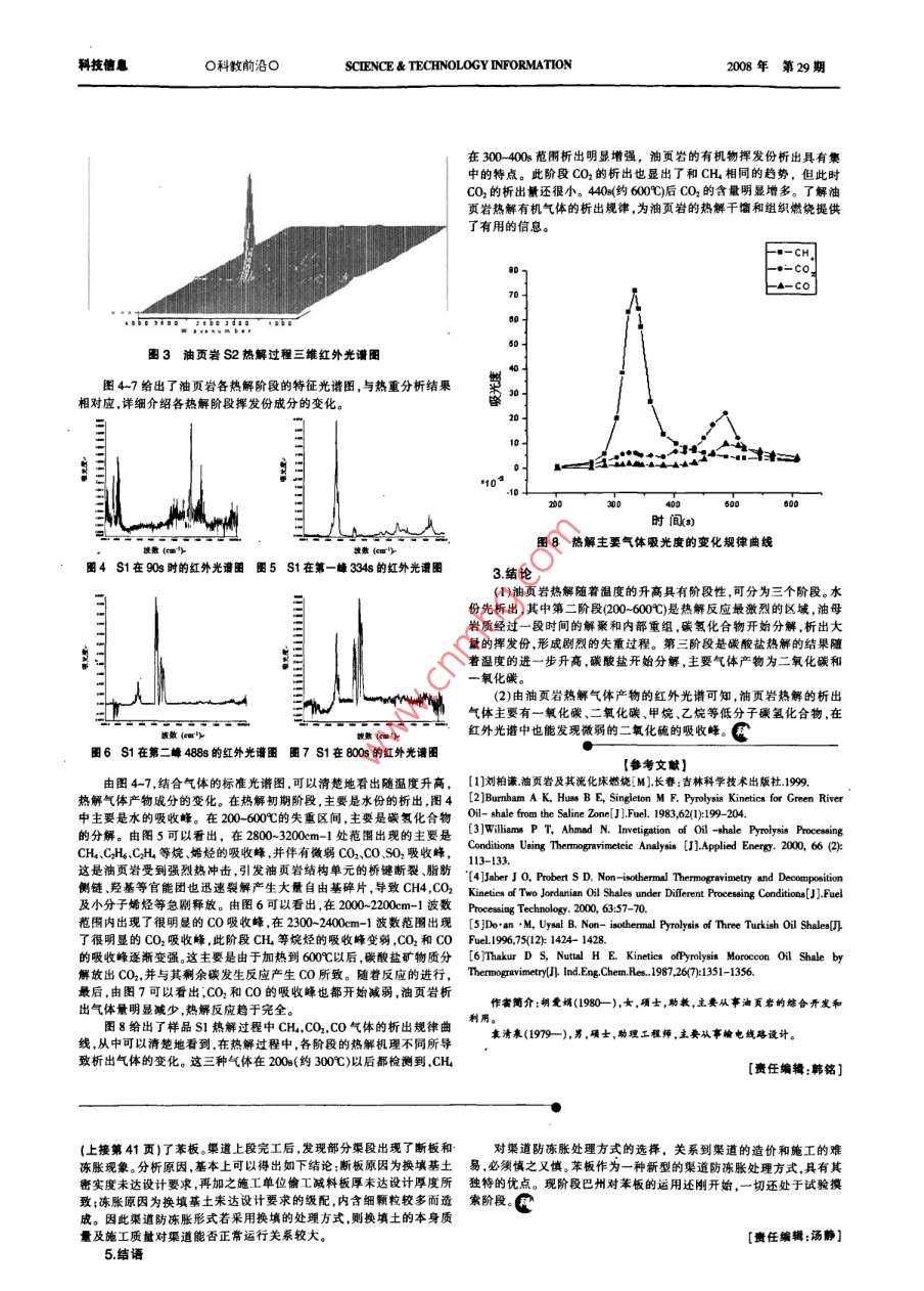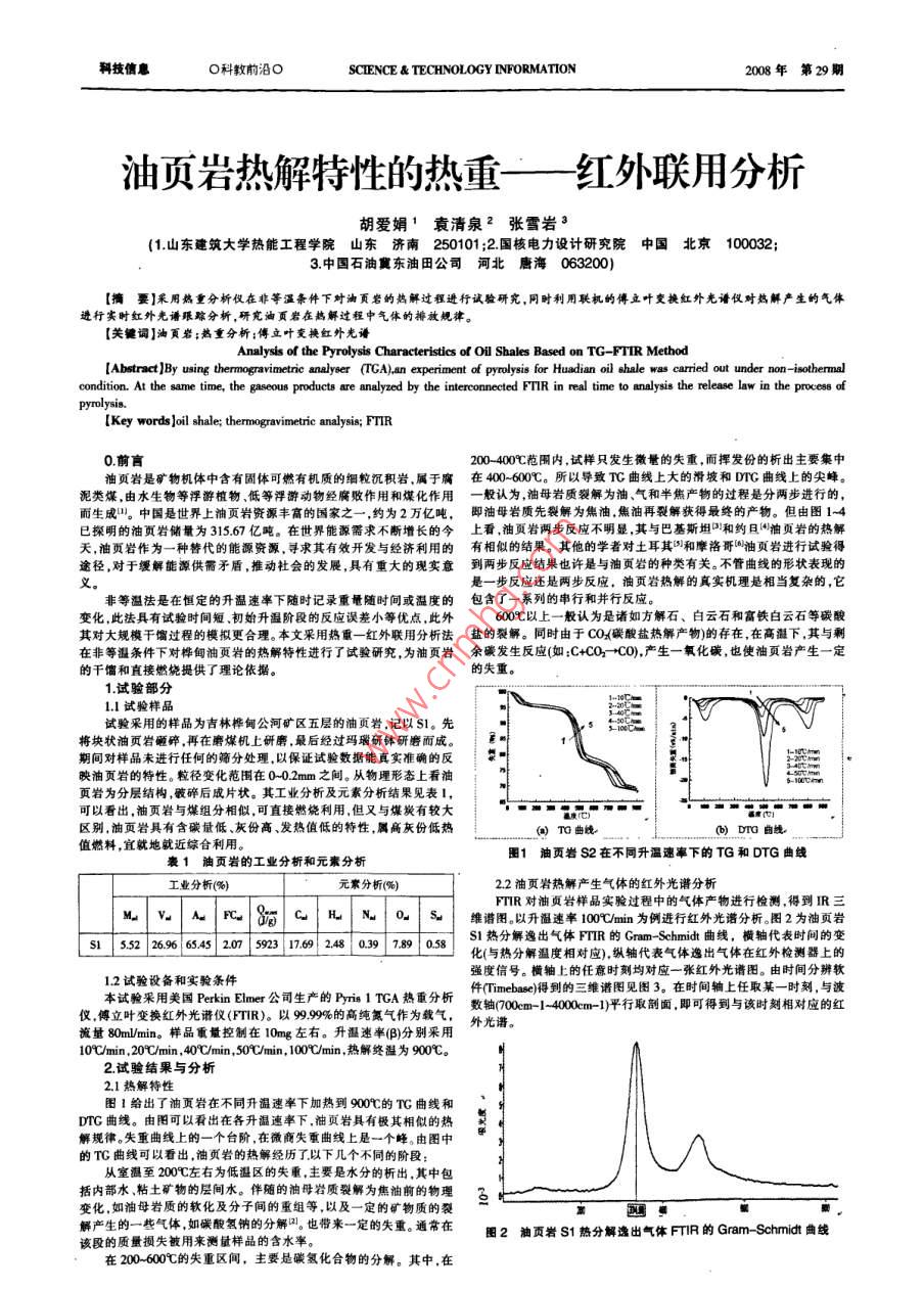 科技信息O科教前沿OSCTENCE & TECHNOLOGY INFORMATION2008年第29期油頁巖熱解特性的熱重一紅外聯(lián)用分析胡愛娟'袁清泉?張雪巖3(1.山東建筑大學熱能工程學院山東濟南250101;2.國核電力設計研究院 中國北京100032;3.中國石油冀東油田公司河北唐海063200)[摘要]采用鵝重分析儀在非等溫條件 下對油頁巖的熱解過程進行試驗研究,同時利用聯(lián)機的博立葉變換紅外光譜儀對熱解產(chǎn)生的氣體進行實時紅外光譜跟蹤分析,研究油頁巖在熱解過程中氣體的排放規(guī)律。[關鍵詞]油頁巖;熱重分析:傅立葉變換紅外光譜Analysis of the Pyrolysts Characteristis of Oil Shales Based on TG-FTIR Method[Abstract)By using thermogravimetrie analyeser (TCA),an experiment of pyrolysis for Huadian oil shale was carried out under non - isothernalcondition. At the same time, the gaseous products are analyzed by the interconnected FTIR in real time to analysis the release law in the process ofpyrolysis.[Key wordsloil shal; trogravietre anlysis; FTIR0.前言200- 400:范圍內,試樣只發(fā)生微量的失重,而揮發(fā)份的析出主要集中油頁巖是礦物機體中含有固體可燃有機質的細粒沉積巖,屬于腐在 400- 600C。所以導致TC曲線上大的滑坡和DYG曲線上的尖峰。泥類煤,由水生物等浮游植物、低等浮游動物經(jīng)腐敗作用和煤化作用-般認為 ,油母巖質裂解為油氣和半焦產(chǎn)物的過程是分兩步進行的,而生成。中國是世界上油頁巖資源豐高的國家之一,約為2萬億噸, 即 油母巖質先裂解為焦油.焦油再裂解獲得最終的產(chǎn)物。但由圖1-4已探明的油頁巖儲量為315.67億噸。在世界能源需求不斷增長的今上看 油頁巖兩步反應不明顯.其與巴基斯坦”'和約且“油頁巖的熱天,油頁巖作為-種替代的能源資源, 尋求其有效開發(fā)與經(jīng)濟利用的有 相似的結果。其他的學者對土耳其)和摩路哥油頁巖進行試驗得途徑,對于緩解能源供需矛盾,推動社會的發(fā)展,具有重大的現(xiàn)實意到兩步 反應結果也許是與油頁巖的種類有關。不管曲線的形狀表現(xiàn)的是一步反應還是兩步反應。油頁巖熱解的真實機理是相當復雜的,它非等溫法是在恒定的升溫速率下隨時記錄重量隨時間或溫度的包含一系列的串行和并行反應變化,此法具有試驗時間短、初始升溫階段的反應誤差小等優(yōu)點.此外600C以上一般認為是諸如方解石、白云石和富鐵白云石等碳酸其對大規(guī)模干熘過程的模擬更合理。本文采用熱重- -紅外聯(lián)用分析法鹽的裂解。 同時由于CO(碳酸鹽熱解產(chǎn)物)的存在,在高溫下,其與剩在非等溫條件下對樺甸油頁巖的熱解特性進行了試驗研究,為油頁巖余碳發(fā)生 反應(如:C+CO2 +C0),產(chǎn)生一氧化碳, 也使油頁巖產(chǎn)生-定的干餾和直接燃燒提供了理論依據(jù)。的失重。1.試驗部分1.1試驗樣品試驗采用的樣品為吉林樺甸公河礦區(qū)五層的油頁巖,記以S1。先將塊狀油頁巖砸碎,再在磨煤機上研磨,最后經(jīng)過瑪瑞研缽研磨而成。期間對樣品來進行任何的篩分處理.以保證試驗數(shù)據(jù)能真實準確的反映油頁巖的特性。粒徑變化范圍在0-0.2mm之間。從物理形態(tài)上看油頁巖為分層結構,破碎后成片狀。其工業(yè)分析及元素分析結果見表I,可以看出,油頁巖與煤組分相似,可直接燃燒利用,但又與煤炭有較大區(qū)別,油頁巖具有含碳量低、灰份高、發(fā)熱值低的特性,屬高灰份低熱間) To曲娩( Dra 曲線。值燃料,宜就地就近綜合利用。圖1 油頁巖S2在不同升溫速率下的TG和DTG曲線表1油頁巖的工業(yè)分析和元素分析工業(yè)分析(%)元素分析(%)2.2油頁巖熱解產(chǎn)生氣體的紅外光譜分析PFTIR 對油頁巖樣品實驗過程中的氣體產(chǎn)物進行檢測,得到IR三v_| A|F CHNO| s.維譜圖。以升溫速率100C/min為例進行紅外光譜分析。圖2為油頁巖| SI S5.52 26.966.45 2.07 5923 17.69 2.48 0.39 7.89 0.58S1熱分解逸出氣體FTIR的Gram-Schmidt曲線,橫軸代表時間的變化(與熱分解溫度相對應),縱軸代表氣體逸出氣體在紅外檢測器上的強度信號。橫軸上的任意時刻均對應一張紅外光譜圖。 由時間分辨軟12試驗設備和實驗條件本試驗采用美國Perkin Elmer公司生產(chǎn)的Pyris 1 TCA熱重分析件(Timebase)得 到的三維諾圖見圖3。在時間軸上任取某-一時刻,與波儀,健立葉變換紅外光譜儀(FTIR)。以9%的高純氮氣作為載氣,數(shù)軸(700cm-1-4000em-1)平行取剖面,即可得到與該時刻相對應的紅流量80m/min。樣品重量控制在10mg 左右。升溫速率(B)分別采用外光譜。10C/min, 20C/min ,40C/min,50C/min, 100C/min,熱解終溫為900C。2.試驗結果與分析2.1熱解特性圖1給出了油頁巖在不同升溫速率下加熱到900C的TC曲線和DTG曲線。由圖可以看出在各升溫速事下,油頁巖具有極其相似的熱解規(guī)律。失重曲線上的一個臺階,在微商失重曲線上是一個峰。由圖中的TC曲線可以看出.油頁巖的熱解經(jīng)歷了以下幾個不同的階段:從室溫至200C左右為低溫區(qū)的失重,主要是水分的析出,其中包括內部水、粘土礦物的層間水。伴隨的油母巖質裂解為焦油前的物理3變化,如油母巖質的軟化及分子間的重組等,以及一-定 的礦物質的裂這國事面.解產(chǎn)生的一些氣體,如碳酸氫鈉的分解切。也帶來- -定的失重。 通常在圈2油頁巖S1 熱分解逸出氣體FTIR的Gram -Schmidt曲線該段的質量損失敏用來測量樣品的含水率。,在 200-600C的失重區(qū)間,主要是碳氫化合物的分解。其中,在;科技
