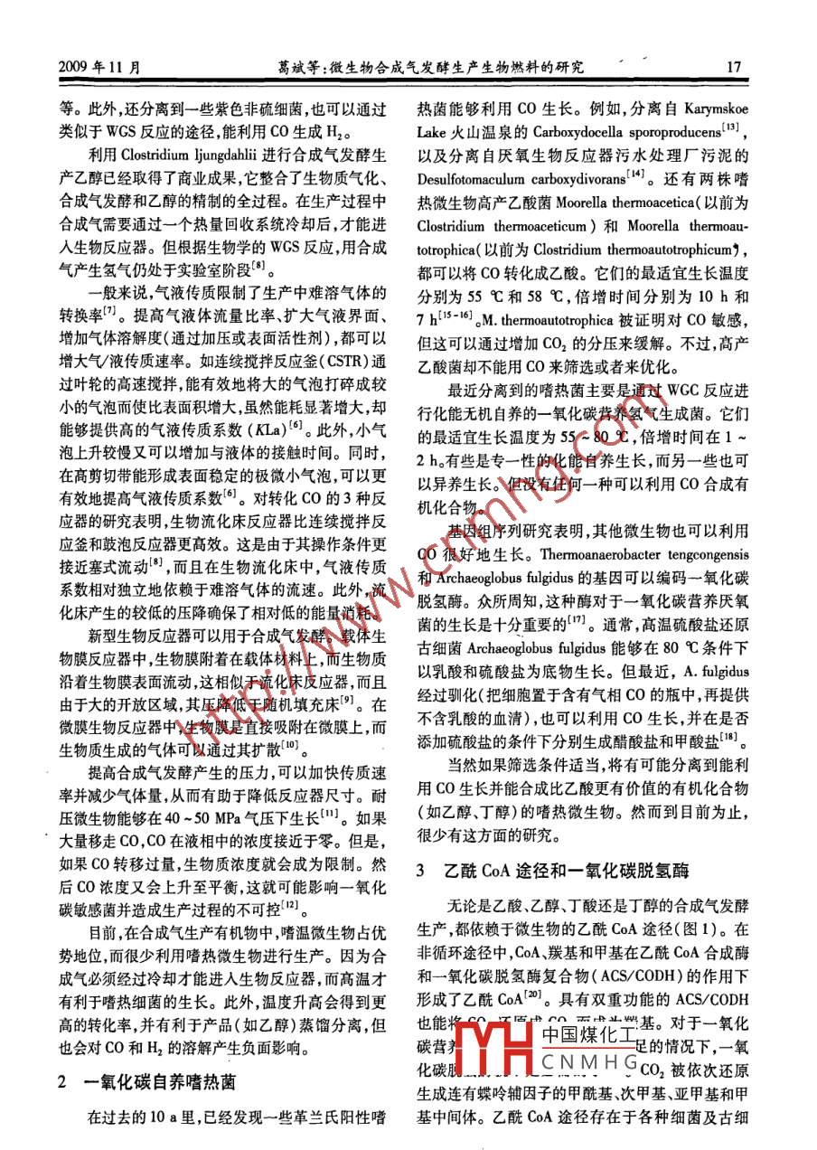 化工科技市場第32卷第11期CHEMICAL TECHNOLOGY MARKET2009年11月微生物合成氣發(fā)酵生產(chǎn)生物燃料的研究葛斌劉麗麗(青島科技大學(xué)化工學(xué)院,山東青島266042)摘要:許多生物質(zhì)原料(如秸稈和木材)不易被微生物直接降解并轉(zhuǎn)化為生物燃料。而將它們氣化為合成氣就可解決這一問題,因?yàn)橛行┪⑸锸悄軌蚶肅0和H2(合成氣的基本組成部分)合成多碳化合物的。而氫氣又可以由一氧化碳自養(yǎng)氫氣生成菌在利用CO和H2O進(jìn)行生長的過程中提供。但是,目前只有少數(shù)的嗜熱菌能良好地利用合成氣生長,而能夠被用來進(jìn)行有機(jī)化合物生產(chǎn)。新菌株的分離鑒定和代謝工程將擴(kuò)大合成氣發(fā)酵的產(chǎn)品范圍。另外,盡管基因手段目前無法用于此生產(chǎn)過程,合成氣發(fā)酵在生物燃料生產(chǎn)方面仍然有優(yōu)勢并具有潛力。關(guān)鍵詞:合成氣;發(fā)酵;生物燃料中圖分類號:TQ033文獻(xiàn)標(biāo)識碼:A文章編號:1009-4725(2009)11-0016-04Production of biofuel by fermentation from microbiology synthesis gasGe Bin, Liu LiliCollege of Chemical Engineering, Qingdao University of Science and Technology, Qingdao 266042, China)Abstract: biomass sources like straw and wood are hardly degradable and cannot be converted to biofuels by microor-anisms. While gasification of this material to produce synthesis gas could offer a solution to this problem, as microorganismscan convert CO and H2(essential components of synthesis gas)to multicarbon compounds, and hydrogen can be also produced by carboxydotrophic hydrogenogenic bacteria that convert CO and H,0 to H, and CO2. However, few thermophilescan grow well on synthesis gas and produce organic compounds. The identification of new isolates and metabolic engineeringcould broaden the product range of synthesis gas fermentation. Although genetic tools for such engineering are currently una-vailable synthesis gas fermentation possess advantage for biofuel production and hold potential future engineering effortsKey words: synthesis gas; fermentations; biofuel當(dāng)前石油和其他礦物資源作為燃料和化學(xué)商 Tropsch反應(yīng),合成線性烷烴。純的氫氣可在合成品被大量使用。但由于化石燃料的儲量有限并且在氣生產(chǎn)過程中,由水煤氣變換反應(yīng)(WGS)制得。反燃燒過程中會產(chǎn)生二氧化碳和各種污染物,如二氧應(yīng)式:CO+H2O一CO2+H2?;蚝偷趸?對環(huán)境造成影響,因此有必要選擇合成氣中的CO和H2可作為微生物代謝的底生產(chǎn)清潔燃料作為替代能源,以減輕化石燃料對環(huán)物,利用這一點(diǎn)可以開發(fā)多種化工產(chǎn)品的生產(chǎn)合成。境的影響顯然,合成氣發(fā)酵將在那些難以直接發(fā)酵的生物質(zhì)、清潔燃料可以通過改善煉油技術(shù)而得到,或者廢棄物和殘?jiān)奶幚碇邪l(fā)揮重要的作用2。由是使用合成燃料或乙醇。由于后者可以從生物質(zhì)中于這些物質(zhì)氣化產(chǎn)生的合成氣溫度很高,嗜熱微生獲得而有更大的潛力。生物乙醇主要是通過易降解物更適于此生產(chǎn)技術(shù)。的糖類底物(如玉米淀粉和甘蔗)發(fā)酵生產(chǎn)的。而發(fā)酵用的糖,又可通過酸法或酶法處理不溶性纖維1合成氣發(fā)酵素而獲得-2)。但是,大多數(shù)生物質(zhì)原料,如秸稈和相比于傳統(tǒng)的金屬催化反應(yīng),合成氣發(fā)酵在燃木材,不能被微生物直接轉(zhuǎn)換為乙醇。一種解決方料和中國煤化工為它具有更高的生法是將這些生物質(zhì)原料氣化,生成合成氣作為合成物催的抗催化劑毒性,乙醇和化合物的原料。合成氣是合成燃料生產(chǎn)的關(guān)并且,L是yCNMHG-n。在過去20鍵中間體,其主要成分為CO與H2,可由煤、天然氣里已經(jīng)分離到一些能以CO和H2為底物生長的厭和其他可再生的生物質(zhì)制得,并能通過 Fischer-氧微生物,其產(chǎn)物包括甲酸、乙酸、丁酸、乙醇、丁醇2009年11月葛斌等:微生物合成氣發(fā)酵生產(chǎn)生物燃料的研究17等。此外,還分離到一些紫色非硫細(xì)菌,也可以通過熱菌能夠利用CO生長。例如,分離自 Karymskoe類似于WGS反應(yīng)的途徑能利用CO生成H2Iake火山溫泉的 Carboxydocella sporoproducens利用 Clostridium ljungdahlii進(jìn)行合成氣發(fā)酵生以及分離自厭氧生物反應(yīng)器污水處理廠污泥的產(chǎn)乙醇已經(jīng)取得了商業(yè)成果它整合了生物質(zhì)氣化、 Desulfotomaculum carboxydivorans。還有兩株嗜合成氣發(fā)酵和乙醇的精制的全過程。在生產(chǎn)過程中熱微生物高產(chǎn)乙酸菌 Moorella thermoacetica(以前為合成氣需要通過一個熱量回收系統(tǒng)冷卻后,才能進(jìn) Clostridium thermoaceticum)和 Moorella thermoau入生物反應(yīng)器。但根據(jù)生物學(xué)的WS反應(yīng),用合成 totrophica(以前為 Clostridium thermoautotrophicum氣產(chǎn)生氫氣仍處于實(shí)驗(yàn)室階段。都可以將CO轉(zhuǎn)化成乙酸。它們的最適宜生長溫度般來說氣液傳質(zhì)限制了生產(chǎn)中難溶氣體的分別為55℃和58℃,倍增時間分別為10h和轉(zhuǎn)換率。提高氣液體流量比率擴(kuò)大氣液界面、7hM. thermoautotrophicum被證明對co敏感,增加氣體溶解度(通過加壓或表面活性劑),都可以但這可以通過增加CO2的分壓來緩解。不過高產(chǎn)增大氣/液傳質(zhì)速率。如連續(xù)攪拌反應(yīng)釜(CSTR)通乙酸菌卻不能用CO來篩選或者來優(yōu)化。過葉輪的高速攪拌,能有效地將大的氣泡打碎成較最近分離到的嗜熱菌主要