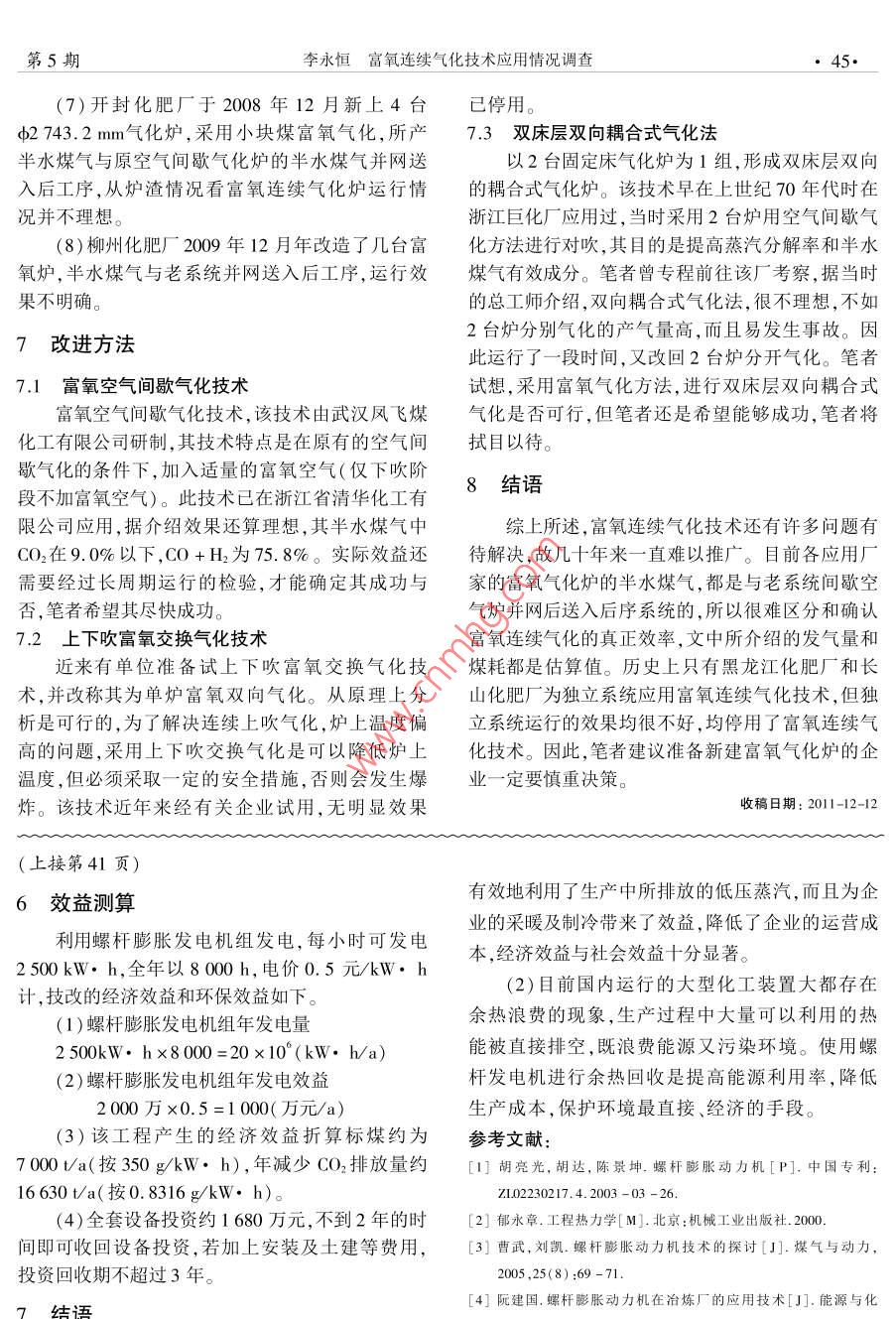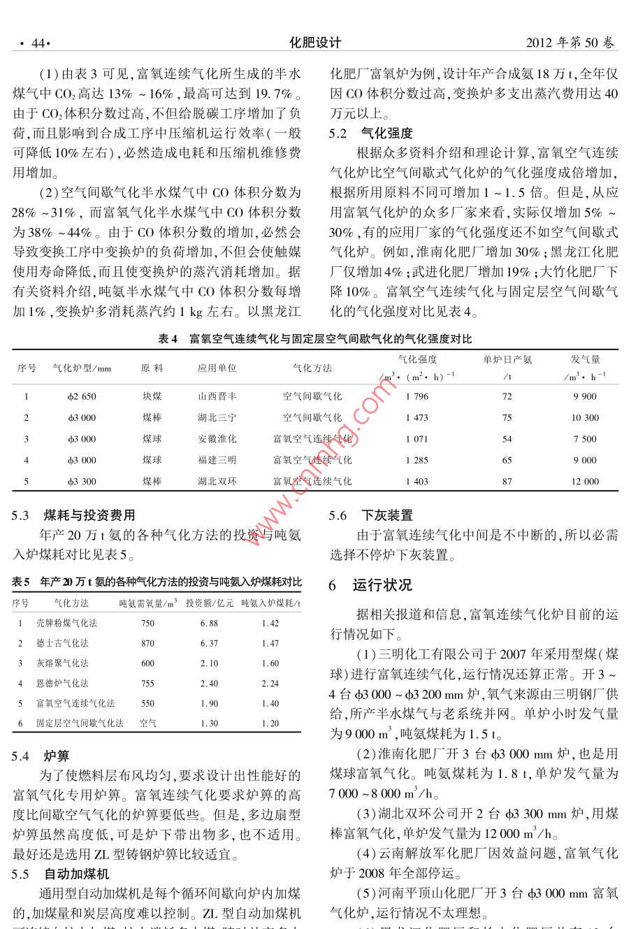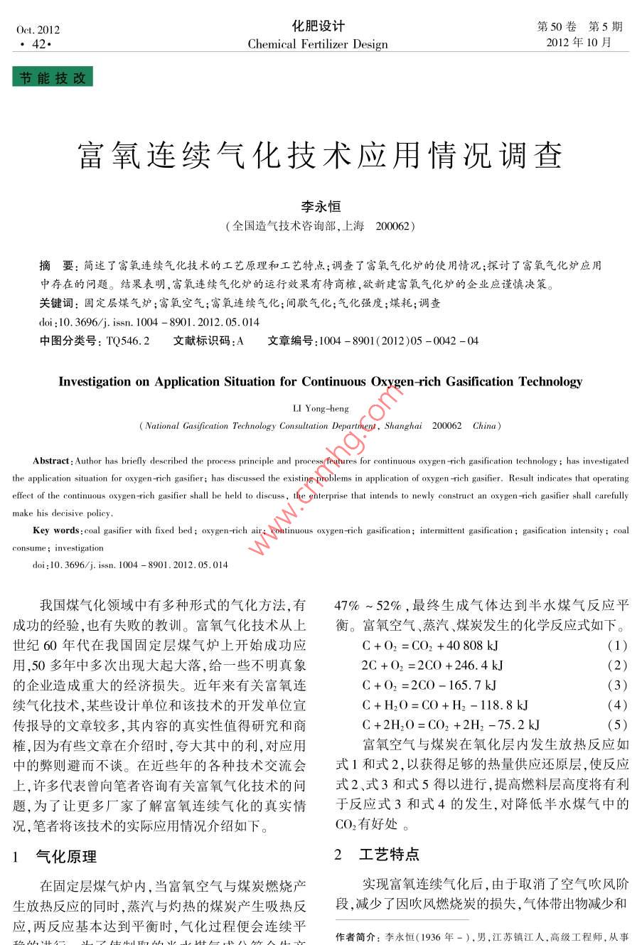 Oct. 2012化肥設(shè)計第50卷第5期●42.Chemical Fertilizer Design2012年10月節(jié)能技改富氧連續(xù)氣化技術(shù)應(yīng)用情況調(diào)查李永恒(全國造氣技術(shù)咨詢部,上海200062 )摘要:簡述了富氧連續(xù)氣化技術(shù)的工藝原理和工藝特點;調(diào)查了富氧氣化爐的使用情況;探討了富氧氣化爐應(yīng)用中存在的問題。結(jié)果表明,富氧連續(xù)氣化爐的運行效果有待商榷,欲新建富氧氣化爐的企業(yè)應(yīng)謹(jǐn)慎決策。關(guān)鍵詞:固定層煤氣爐;富氧空氣;富氧連續(xù)氣化;間歇氣化;氣化強度;煤耗;調(diào)查doi :10.3696/j. issn. 1004 - 8901. 2012.05. 014中圖分類號: TQ546. 2文獻(xiàn)標(biāo)識碼:A文章編號:1004 - 8901(2012)05 -0042 -04Investigation on Application Situation for Continuous Oxygen +rich Gasification TechnologyuI Yong-heng( National Gasification Technology Consulaion Department, Shanghai 200062 China)Abstract: Author has brielly deseribed the proess prineiple and process features for continuous oxygen -rich gasifcaion technology ; has investigatedthe application situation for oxygen +rich gasifier; has discussed the existing problems in application of oxygen -rich gasifier. Result indicates that operatingeffect of the continuous oxygen-rich gasifier shall be held to discuss, the enterprise that intends to newly construct an oxygen -rich gasifier shall carefullymake his deisive poliey.Key words :coal gasitfier with fixed bed ; oxygen-ich air; continuous oxygen-rich gasifieation; intermittent gasification; gasification intensity; coalconsume ; investigationdoi:10. 3696/j. issn. 1004 - 8901.2012. 05.014我國煤氣化領(lǐng)域中有多種形式的氣化方法,有47% ~52% ,最終生成氣體達(dá)到半水煤氣反應(yīng)平成功的經(jīng)驗,也有失敗的教訓(xùn)。富氧氣化技術(shù)從上衡。富氧空氣、蒸汽煤炭發(fā)生的化學(xué)反應(yīng)式如下。世紀(jì)60年代在我國固定層煤氣爐.上開始成功應(yīng)C+O2 =CO2 +40 808 kJ(1)用,50多年中多次出現(xiàn)大起大落,給一些不明真象2C+O2 =2C0 +246.4 kJ的企業(yè)造成重大的經(jīng)濟(jì)損失。近年來有關(guān)富氧連C+O2 =2C0- 165.7kJ(3)續(xù)氣化技術(shù),某些設(shè)計單位和該技術(shù)的開發(fā)單位宣C+H2O=CO+H2-118.8 kJ(4)傳報導(dǎo)的文章較多,其內(nèi)容的真實性值得研究和商C +2H2O=CO2 +2H2 -75.2 kJ(5)榷,因為有些文章在介紹時,夸大其中的利,對應(yīng)用富氧空氣與煤炭在氧化層內(nèi)發(fā)生放熱反應(yīng)如中的弊則避而不談。在近些年的各種技術(shù)交流會式1和式2,以獲得足夠的熱量供應(yīng)還原層,使反應(yīng)上,許多代表曾向筆者咨詢有關(guān)富氧氣化技術(shù)的問式2、式3和式5得以進(jìn)行,提高燃料層高度將有利題,為了讓更多廠家了解富氧連續(xù)氣化的真實情于反應(yīng)式3和式4的發(fā)生,對降低半水煤氣中的況,筆者將該技術(shù)的實際應(yīng)用情況介紹如下。CO2有好處。1氣化原理2工藝特點在固定層煤氣爐內(nèi),當(dāng)富氧空氣與煤炭燃燒產(chǎn)實現(xiàn)富氧連續(xù)氣化后,由于取消了空氣吹風(fēng)階生放熱反應(yīng)的同時,蒸汽與灼熱的煤炭產(chǎn)生吸熱反段,減少了因吹風(fēng)燃燒炭的損失,氣體帶出物減少和應(yīng),兩反應(yīng)基本達(dá)到平衡時,氣化過程便會連續(xù)平作者簡介:李永恒(1936年- ),男,江蘇鎮(zhèn)江人,高級工程師,從事第5期李永恒富氧連續(xù) 氣化技術(shù)應(yīng)用情況調(diào)查●43.爐渣含炭量的降低等原因,使炭的利用率得到提表1 2種制氧裝置性能比較高,煤耗有所降低。另外,由于氣體空速低,可以應(yīng)300m31000 m1500m’3500m序號項目用小粒煤和型煤進(jìn)行氣化。VPSA深冷VPSA深冷VPSA 深冷VPSA 深冷由于該技術(shù)是連續(xù)氣化,爐溫相對比較穩(wěn)定,1 02.4/%9399.693 99.69399.69399.6蒸汽分解率比空氣間歇式氣化要高。另外,因為高電耗/(kW.h)>m-30.43 0.79 0.42 0.7 0.41 0.650.4 0.溫煤氣全部進(jìn)入廢鍋,余熱回收效果好(原中氮廠3水耗/. h-110 405015075300 120450大直徑煤氣爐的流程下吹煤氣的顯熱未回收),因4啟動時間/h<1 12<1 36l 36連續(xù)運行時間/h 8000 4000 80000 7500 8000 8000 8000 8000副產(chǎn)蒸汽量增加,氨系統(tǒng)可以實現(xiàn)蒸汽自給(理論6占地面積/m2120 300.22020002502400 4002700推算)。7綜合投資/萬元60 600 83013901100185020002600該技術(shù)選用ZL型自動加煤機(jī),可以恒定炭層高度,有利于富氧氣化;選用不停爐下灰裝置,可以4應(yīng)用統(tǒng)計達(dá)到連續(xù)氣化的要求。另外,減少了許多自動閥曾經(jīng)使用過富氧連續(xù)氣化技術(shù)的單位及其相門,簡化了工藝流程,降低了系統(tǒng)故障率,減少了設(shè)關(guān)統(tǒng)計數(shù)據(jù)見表2。備維修費用。富氧連續(xù)氣化工藝流程見圖1。表2富氧氣化技術(shù)的應(yīng)用單位及數(shù)據(jù)空氣煤炭氣化爐規(guī)格,氣化爐應(yīng)用單位應(yīng)用時期φ/ mm數(shù)量/臺氧句一富氧空氣混合器一鼓風(fēng)機(jī)-一蒸汽混合器一氣化炯1 太原化肥廠上世紀(jì)60年代初36002長春第 一汽車制造廠60年代3A-13型.[氣柜]-一選滌塔一[廢鍋]← -除塵器3吉林化肥廠3 0004淮南化肥廠70年代3 0000圖1富氧連續(xù)氣化工藝流程5云南解放軍化肥廠6黑龍江化肥廠1994年3氧氣來源7四川大竹化肥廠1996年2 400氧氣的來源有2種情況,一是有的企業(yè)內(nèi)部其8江蘇武進(jìn)化肥廠他工序中有多余的氧氣,可直接將氧氣引入原固定9河南平頂山 化肥廠1998年層煤氣