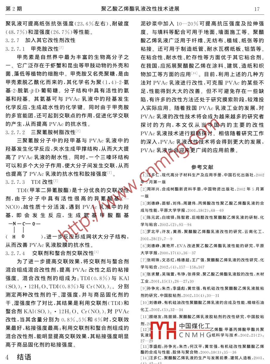 第2期聚乙酸乙烯酯乳液改性技術(shù)進(jìn)展.15聚乙酸乙烯酯乳液改性技術(shù)進(jìn)展陶紅森(武漢理工大學(xué)資源與環(huán)境工程學(xué)院,武漢,430070)吳魁(陜西省現(xiàn)代建筑設(shè)計(jì)研究院,西安,410078)摘要本文結(jié)合當(dāng)今主要聚乙酸乙烯酯乳液改性技術(shù),探討了其改性技術(shù)的進(jìn)展?fàn)顩r。關(guān)鍵詞:聚乙酸乙烯酯乳液改性技術(shù) 進(jìn)展(聚乙烯醇)3%、蒸餾水45%、DBP(鄰苯二甲酸二前言..丁酯)5%、鄰苯二甲酸二甘醇酯0.5%、過硫酸銨聚乙酸乙烯酯(PVAc)俗稱乳白膠。PVAc乳0.1%、乳化劑OP-10 0.2%、聚氧乙烯蓖麻油液具有無毒無害且不易燃、易爆,生產(chǎn)容易,價(jià)格低0.2%、碳酸氫鈉0.15%?;静僮鬟^程為將5%廉,性能良好,應(yīng)用方便等特點(diǎn)。已廣泛用于建筑、PVA按定量投入反應(yīng)釜內(nèi),溶脹30min后開始攪紡織、包裝、印刷、木材加工、涂料及粘合劑等領(lǐng)域拌,加入VAC單體總量的1/8和1/4過硫酸銨,升中。但是PVAc乳液也存在缺點(diǎn),主要是抗水性溫到85'C后保溫1h,降溫到65'C,緩慢滴加剩余的差,在濕熱條件下其粘接強(qiáng)度會(huì)有很大程度的下降;VAC,同時(shí)加入全部的乳化劑??刂聘獌?nèi)溫度為其成膜的抗蠕變性差,在長(zhǎng)時(shí)間靜載荷的作用下,膠60C,再緩慢滴入溶解好的過硫酸銨溶液總量的層也會(huì)產(chǎn)生滑動(dòng)。同時(shí),它的耐濕性、抗凍性及耐機(jī)30%,控制滴加速度,防止沖料。由于反應(yīng)放熱,應(yīng).械穩(wěn)定性也較差。故國(guó)內(nèi)外都將其改性作為開發(fā)研盡量使釜溫自然上升到80士2C。待回流基本結(jié)束究的重點(diǎn)。主要是通過加入增塑劑、溶劑、改性劑,后,滴入剩余的VAC和過硫酸銨溶液。此時(shí)VAC .單體共聚合以及與另一種乳液共混等方法[- -5.8]。與過硫酸銨應(yīng)同步滴加,并剩余過硫酸銨約1%,反現(xiàn)今,許多科技工作者正致力于PVAc乳液改性的應(yīng)后期釜溫自然上升到90"C,保溫30-40min,以利研究,本文將初步探討PVAc乳液改性技術(shù)的進(jìn)展于減少殘留在乳液中的VAC殘留量,冷卻到70C狀況。加入增塑劑A,50"C時(shí)加入增塑劑B和已配成10%2 PVAc發(fā)展?fàn)顩r及基本生產(chǎn)技術(shù)濃度的NaHCO:溶液。抽樣檢驗(yàn),合格后裝桶。3PVAc乳液改性技術(shù)2.1發(fā) 展?fàn)顩r簡(jiǎn)介PVAc的研究始于1912年,美國(guó)1945年開發(fā)3.1聚合物的改性--般方法[2]出此產(chǎn)品。我國(guó)在20世紀(jì)80年代初由上海等地開各種單一的純聚合物總有固有的優(yōu)點(diǎn)和缺點(diǎn),始生產(chǎn)。國(guó)內(nèi)開發(fā)現(xiàn)狀是生產(chǎn)規(guī)模小,產(chǎn)品品種少,有時(shí)制品在使用過程中達(dá)不到所需要的性能要求。應(yīng)用水平不夠高,但是隨著合資引進(jìn)新項(xiàng)目的投產(chǎn),為了中國(guó)煤化工性能要求.必須對(duì)單-PVAc乳液工業(yè)正在快速發(fā)展。聚合YHCNMHG的性能要求?,F(xiàn)在聚2.2 基本生產(chǎn)技術(shù)口合物的改性一般有物理改性和化學(xué)改性。其中物理現(xiàn)今,對(duì)PVAc乳液的改性一般基于其基本生改性包括共混改性、增強(qiáng)改性、填充改性等;而化學(xué)產(chǎn)技術(shù),因此有必要對(duì)其進(jìn)行一定了解。生產(chǎn)改性包括共聚改性和交聯(lián)改性等?,F(xiàn)今國(guó)內(nèi)外對(duì)PVAc的基本德勞為: VAC(乙酸乙烯)46%、PVAPVAc乳液改性技術(shù)的研究,也主要在這些改性方16四川化工第8卷2005年第2期法之中。力低,抗水性好,因此經(jīng)它改性的PVAc乳液也具3.2國(guó)內(nèi)主要的 PVAc乳液改性技術(shù)淺析有較低的表面張力和較好的抗水性。3.2.1丙烯酸改性[3]3.2.4 有機(jī)硅改性主要采用交聯(lián)性單體AA(丙烯酸)與VAC(乙有機(jī)硅具有許多優(yōu)異的性能,有優(yōu)異的透氣性、酸乙烯酯)進(jìn)行乳液聚合,用部分縮甲醛化的PVA疏水性,具有較低的玻璃化轉(zhuǎn)變溫度及低的表面張(聚乙烯醇)作為乳化穩(wěn)定劑,并采用復(fù)配乳化技術(shù),力。因此,用功能性有機(jī)硅改性PVAc乳液,可以既提高了PVAc乳液的抗水性和貯藏穩(wěn)定性,又提改善PVAc乳液的抗水性,提高其綜合性能,擴(kuò)大高了乳液的粘接性能.并可減少乙酸乙烯單體的耗應(yīng)用范圍[9.13]用有機(jī)硅改性PVAc乳液可收到一量,降低生產(chǎn)成本。其中主要的作用機(jī)理在于PVA定效果。國(guó)內(nèi)有學(xué)者采用復(fù)配乳化穩(wěn)定劑并進(jìn)行縮在酸性條件下與甲醛進(jìn)行縮醛反應(yīng),在相鄰分子的醛化,然后用有機(jī)硅油(甲基含氫硅油)與VAC單羥基間形成六元環(huán)縮醛,減少了PVA分子的羥基體進(jìn)行接枝共聚,提高了PVAc乳液的抗水性。將數(shù)目,使自身的抗水性增強(qiáng),從而提高了乳液膜的抗部分醇解型PVA(聚合度1788)和完全醇解型PVA水性;另外引入了具有交聯(lián)作用的AA與VAC進(jìn)(聚合度1799)進(jìn)行縮甲醛化,主要是在相鄰分子的行共聚,乳液在成膜過程與交聯(lián)劑交聯(lián),使固化后膜羥基間形成六元環(huán)縮醛,減少了PVA分子的羥基層的抗水性得以提高。此外,改性乳液的粘接強(qiáng)度數(shù)目,增加了乳化穩(wěn)定劑自身的抗水性,也就提高了和抗水性在-定粘度內(nèi)隨AA用量增加得以提高,PVAc乳液的抗水性。甲基含氫硅油的最大優(yōu)點(diǎn)是.這是由于引入了具有內(nè