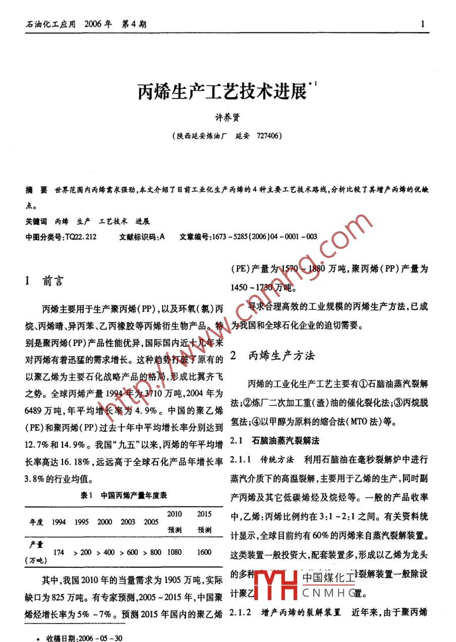 石油化工應(yīng)用2006年第4期丙烯生產(chǎn)工藝技術(shù)進(jìn)展許養(yǎng)賢(陜西延安煉油廠延安727406摘要世界范圍內(nèi)丙烯需求強(qiáng)勁,本文介紹了目前工業(yè)化生產(chǎn)丙烯的4種主要工藝技術(shù)路線,分析比較了其增產(chǎn)丙烯的優(yōu)缺關(guān)鍵詞丙烯生產(chǎn)工藝技術(shù)進(jìn)展中圖分類號(hào)TQ22212文獻(xiàn)標(biāo)識(shí)碼A文章編號(hào):1673-5285(2006)04-0001-003(PE)產(chǎn)量為1570~1880萬噸,聚丙烯(PP)產(chǎn)量為1前言1450~1730萬噸丙烯主要用于生產(chǎn)聚丙烯(P),以及環(huán)氧(氯)丙尋求合理高效的工業(yè)規(guī)模的丙烯生產(chǎn)方法,已成烷丙烯晴、異丙苯、乙丙橡膠等丙烯衍生物產(chǎn)品。特為我國(guó)和全球石化企業(yè)的迫切需要。別是聚丙烯(PP)產(chǎn)品性能優(yōu)異,國(guó)際國(guó)內(nèi)近十幾年來對(duì)丙烯有著迅猛的需求增長(zhǎng)。這種趨勢(shì)打破了原有的2丙烯生產(chǎn)方法以聚乙烯為主要石化戰(zhàn)略產(chǎn)品的格局,形成比翼齊飛丙烯的工業(yè)化生產(chǎn)工藝主要有①石腦油蒸汽裂解之勢(shì)。全球丙烯產(chǎn)量1994年為3710萬噸,2004年為法;②煉廠二次加工重(渣)油的催化裂化法;③丙烷脫6489萬噸,年平均增長(zhǎng)率為4.9%。中國(guó)的聚乙烯(PE)和聚丙烯(P)過去十年中平均增長(zhǎng)率分別達(dá)到氫法:④以甲醇為原料的縮合法(M法)等。127%和14.9%。我國(guó)“九五”以來丙烯的年平均增2.1石腦油蒸汽裂解法長(zhǎng)率高達(dá)16.18%,遠(yuǎn)遠(yuǎn)高于全球石化產(chǎn)品年增長(zhǎng)率211傳統(tǒng)方法利用石腦油在毫秒裂解爐中進(jìn)行38%的行業(yè)均值。蒸汽介質(zhì)下的高溫裂解,主要用于乙烯的生產(chǎn),同時(shí)副表1中國(guó)丙烯產(chǎn)量年度表產(chǎn)丙烯及其它低碳烯烴及烷烴等。一般的產(chǎn)品收率年度1994199520002003200520102015中,乙烯:丙烯比例約在3:1~2:1之間。有關(guān)資料統(tǒng)預(yù)測(cè)預(yù)測(cè)計(jì)顯示,全球目前約有60%的丙烯來自蒸汽裂解裝置。產(chǎn)量(萬噸)174>200400>60>80100160這類裝置一般投資大配套裝置多,形成以乙烯為龍頭其中我國(guó)2010年的當(dāng)量需求為1905萬噸實(shí)際的多種中國(guó)煤化工裂解裝置一般除設(shè)缺口為825萬噸。有專家預(yù)測(cè),20-2015年,中國(guó)聚計(jì)聚乙CNMHG置。烯烴增長(zhǎng)率為5%-7%。預(yù)測(cè)2015年國(guó)內(nèi)的聚乙烯2.1.2增產(chǎn)丙烯的裂解裝置近年來由于聚丙烯收稿日期2006-05-30石油化工應(yīng)用2006年第4期(PP)全球需求強(qiáng)勁,已有國(guó)外企業(yè)開發(fā)乙烯丙烯產(chǎn)提升管底部回?zé)捠沟闷椭械南N進(jìn)一步轉(zhuǎn)化,達(dá)到出比例提高到50%:50%的工藝技術(shù),利用重新研究和有效地降低DCC汽油烯烴含量并增產(chǎn)丙烯的目的。開發(fā)設(shè)計(jì)的生產(chǎn)設(shè)備及操作工藝已完成了工業(yè)化生當(dāng)汽油回?zé)捔空?%~7%時(shí),丙烯質(zhì)量產(chǎn)率增加1個(gè)產(chǎn)裝置運(yùn)行可靠。百分點(diǎn)左右。3但是這一回?zé)挿绞侥撤N程度上犧牲了22重(渣)油催化裂化(FcC)法部分高辛烷值汽油組分,且回?zé)捠沟醚b置總體加工處2.2.1傳統(tǒng)方法重(渣)油催化裂化(FCC)法是利理能力有所下降。用重質(zhì)(渣)油在催化劑的高溫作用下(450~00℃),3.丙烷脫氫法。由于油田伴生氣及煉廠氣中富含將大分子(重油)催化轉(zhuǎn)化為小分子(輕油)的重要的大量的丙烷(C3~C4)成分,丙烷脫氫研究一直是一個(gè)二次油品加工手段,其主要產(chǎn)品是汽油柴油和液化石熱門研究方向。目前成熟的低碳飽和烷烴脫氫工藝基油氣(。其中液化石油氣(C3~C)中富含不飽和烯本上是催化脫氫法。一般用于異丁烷(iC)脫氫制取烴,丙烯的體積分?jǐn)?shù)約在30%-45%之間,使得催化裂甲基叔丁基醚(MTBE)的原料異丁烯和用丙烷(C3)脫化法成為生產(chǎn)丙烯的一個(gè)重要來源。氫制丙烯的工藝。這種生產(chǎn)工藝已被國(guó)外于20世紀(jì)催化裂化生產(chǎn)丙烯技術(shù)由于使用廉價(jià)的重質(zhì)原80年代開發(fā)成功,90年代開始大量應(yīng)用于全球多家石料,丙烯生產(chǎn)成本明顯低于蒸汽裂解使得加工聚丙烯化企業(yè)中。我國(guó)目前尚未見工業(yè)化應(yīng)用報(bào)道,可以預(yù)(PP)產(chǎn)品已成為國(guó)內(nèi)外煉油企業(yè)的一個(gè)效益增長(zhǎng)點(diǎn)。料在不久的將來,這種較為便捷的丙烯生產(chǎn)方法將入222國(guó)內(nèi)的情況我國(guó)的丙烯生產(chǎn)企業(yè)有60多主國(guó)內(nèi)的煉化企業(yè)。典型的工業(yè)化應(yīng)用工藝有Lum家年產(chǎn)量在10萬噸以上的約20家。其中,大部分為mus公司的 Catofin工藝及UOP公司的 Oleflex工藝另煉油廠丙烯生產(chǎn)企業(yè),乙烯蒸汽裂解生產(chǎn)丙烯的廠家外還有Phip公司的STAR工藝和 Linde公司的工相對(duì)較少,以煉化一體化為主的生產(chǎn)企業(yè)丙烯產(chǎn)量約藝。這里僅列表介紹工業(yè)化應(yīng)用較廣泛的前兩種占全國(guó)丙烯總產(chǎn)量的70%。這其中,催化裂化裝置貢工藝。獻(xiàn)最大。催化裂化裝置液化石油氣產(chǎn)品收率約10%-基于專利型的催化劑使用固定床或移動(dòng)床(或流15%,丙烯約占液化石油氣的20%-30%(W%)。在化床)技術(shù)C2~C3的飽合烷烴的高單程脫氫轉(zhuǎn)化率催化裂化工藝基礎(chǔ)上我國(guó)相繼