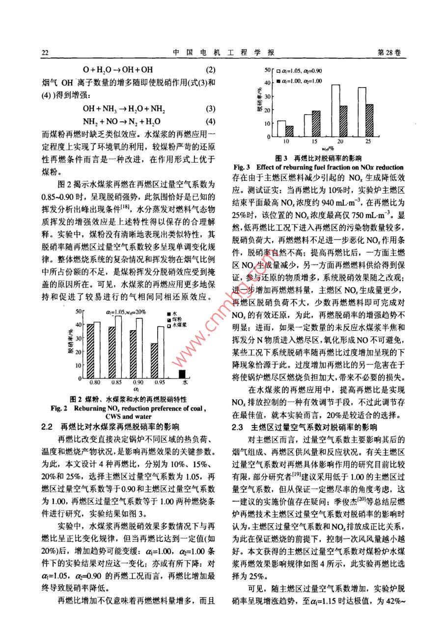 第28卷第23期中國(guó)電機(jī)工程學(xué)報(bào)vol28No23Aug.15.2008202008年8月15日Proceedings of the文章編號(hào):0258-8013(2008)23002005中圖分類號(hào):TK16文獻(xiàn)標(biāo)識(shí)碼:A學(xué)科分類號(hào):47020水煤漿再燃降低鍋爐NO排放的實(shí)驗(yàn)研究董若凌',周俊虎2,岑可法2,韓志英2(1.浙江理工大學(xué)機(jī)械與自動(dòng)控制學(xué)院,浙江省杭州市3100182.浙江大學(xué),淅江省杭州市310027)Experimental Study on Reducing Furnace NO Emission Through Coal Water Slurry ReburningDONG Ruo-ling', ZHOU Jun-hu?, CEN Ke-fa, HAN Zhi-ying(1. College of Mechanical and Automation Control, Zhejiang Sci-Tech University, Hangzhou 310018, Zhejiang Province, China,2. Zhejiang University, Hangzhou 310027, Zhejiang Province, China)ABSTRACT: The performance of coal water slurry(CwS)同比例的燃料/空氣混合物,在不同區(qū)域內(nèi)形成氧化reburning technology for NO, emission control was性或還原性氛圍,在保證燃燒的前提下,將已有NOxinvestigated in a025 MW down-fired fumace. Shenhua還原為N2。目前,再燃技術(shù)在工業(yè)應(yīng)用中可獲得的脫硝率在20%-70%,除技術(shù)本身原因外,再燃燃indicate that Cws is superior to pulverized coal in regard to料選擇是引起以上差異的重要一環(huán)。天然氣不含NNO, reduction; high reburning fuel fraction and oxygen primary物質(zhì),是較優(yōu)的再燃燃料。但由于存在價(jià)格和產(chǎn)品combustion zone favor to the control of furmace NOxNO, reduction efficiency is inverse proportional to the square可靠供給問題,天然氣再燃技術(shù)的工業(yè)實(shí)施比較有excess air ratio in the primary combustion zone,, and decrease限。對(duì)燃煤電站鍋爐而言,煤粉是最便利的再燃with increase in the rebuming zone excess air ratio. cws is a燃料,且二次處理(如超細(xì)化和制漿化)后,再燃效good rebuming fuel and could be widely applied in the industry果會(huì)進(jìn)一步提高:超細(xì)煤粉再燃實(shí)現(xiàn)的工業(yè)脫硝率furnace for further NO, emission control現(xiàn)已達(dá)28%~57%。徐璋"和李戈的一維爐實(shí)驗(yàn)KEY WORDS: coal water slurry; down-fired furnace還曾報(bào)道了高于60%的脫硝效果,不過,超細(xì)粉再rebuming technology: NO, reductio燃應(yīng)用的經(jīng)濟(jì)性仍待權(quán)衡;煤漿化是另一煤粉再燃摘要:為明確鍋爐采用水煤漿再燃技術(shù)時(shí)的整體NO2控制效應(yīng)用處理方式,EER曾利用洗煤廠煤渣制漿,在0.3果和影響因素,利用神華煤,在025Mw沉降爐上,分別MW塔式爐、03MW和3MW旋流爐上進(jìn)行測(cè)試,以煤粉和水煤漿為再燃燃料,進(jìn)行了再燃NO控制實(shí)驗(yàn)結(jié)實(shí)現(xiàn)再燃脫硝率55%-7%,幾近天然氣的應(yīng)用效果顯示,水煤漿再燃時(shí)的脫硝效果優(yōu)于煤粉:一定范圍內(nèi)果,且經(jīng)濟(jì)可靠21!鑒于燃煤電站鍋爐在煤漿制較高的再燃比有利于鍋爐整體再燃脫硝:鍋爐主燃區(qū)宜采用備上的便利,以及利用水煤漿作為再燃燃料可能具氧化性氛圍,此時(shí)該處的過量空氣系數(shù)與脫硝效果呈現(xiàn)二次有的較好NO控制前景,進(jìn)行該領(lǐng)域探索,確定水曲線關(guān)系;水煤漿再燃脫硝率與再燃區(qū)過量空氣系數(shù)成反煤漿再燃影響因素,極具意義。由此,在初步了解比。實(shí)驗(yàn)證實(shí),水煤漿是一種較優(yōu)的再燃燃料,可被廣泛應(yīng)水煤漿作為再燃燃料時(shí)若干再燃區(qū)反應(yīng)特性的基礎(chǔ)用,以實(shí)現(xiàn)對(duì)工業(yè)爐NO,排放的有效控制上同,本文利用025MW沉降爐對(duì)水煤漿再燃技術(shù)關(guān)鍵詞:水煤漿;沉降爐;再燃技術(shù);脫硝的系統(tǒng)應(yīng)用作進(jìn)一步考察。0引言1實(shí)驗(yàn)裝置和方法燃煤電站鍋爐所排放的NO2會(huì)帶來光化學(xué)煙11實(shí)驗(yàn)裝置霧,破壞臭氧層,引發(fā)酸雨,影響動(dòng)、植物生長(zhǎng),圖1為水煤漿再燃實(shí)驗(yàn)臺(tái)簡(jiǎn)圖。整套系統(tǒng)的構(gòu)甚至危及人類生活健康。為此,科研人員對(duì)之進(jìn)成包括實(shí)驗(yàn)爐本體、煤粉主燃燒系統(tǒng)、煤漿再燃系行了深入研究,并開發(fā)了多種控制手段。再燃技術(shù)統(tǒng)和實(shí)驗(yàn)監(jiān)測(cè)系統(tǒng)。其中,實(shí)驗(yàn)爐主體高約35m,是其中之一28。再燃是指分區(qū)段向燃煤鍋爐輸送不內(nèi)徑300mm。主燃燒器頂置,一、二次風(fēng)均為環(huán)形第23期莖若凌等:水煤漿再燃降低鍋爐NO,排放的實(shí)驗(yàn)研究風(fēng),一次風(fēng)口內(nèi)徑40mm,外徑72mm,二次風(fēng)口13實(shí)驗(yàn)方案內(nèi)徑78mm,外徑93mm。爐體四周開設(shè)20多個(gè)實(shí)驗(yàn)意圖從鍋爐整體角度研究水煤漿再燃技術(shù)有密封蓋的小孔,作觀測(cè)、取樣用,亦作再燃燃料的脫硝效果和影響因素,主要內(nèi)容包括:鍋爐主燃噴入口和供風(fēng)口。實(shí)驗(yàn)中,主燃煤粉由螺旋給粉器區(qū)過量空氣系數(shù)a、再燃燃料占鍋爐總熱輸入量的供給,再燃煤漿則利用高壓空氣將煤漿泵輸送來的百分比(再燃比w+)和再燃區(qū)過量空氣系數(shù)a2等參數(shù)漿液通過煤漿槍實(shí)施有效霧化后送λ爐內(nèi)。實(shí)驗(yàn)監(jiān)與脫硝率間的關(guān)系。煤粉、水和水煤漿的再燃脫硝測(cè)系統(tǒng)包括多種測(cè)量?jī)x器:火焰溫度采用紅外高溫效果比較也在考察范圍之內(nèi)。計(jì)和鉑銠鉑銠熱電耦配合測(cè)量,煙氣成份采樣由為經(jīng)濟(jì)、安全,