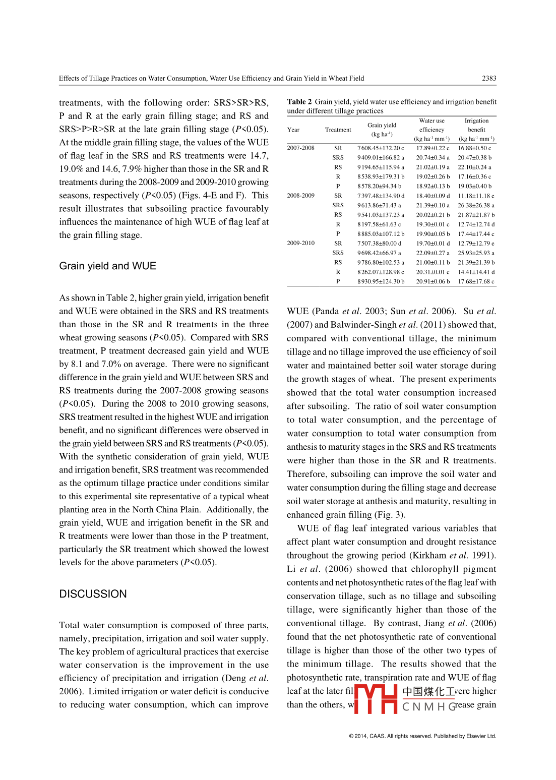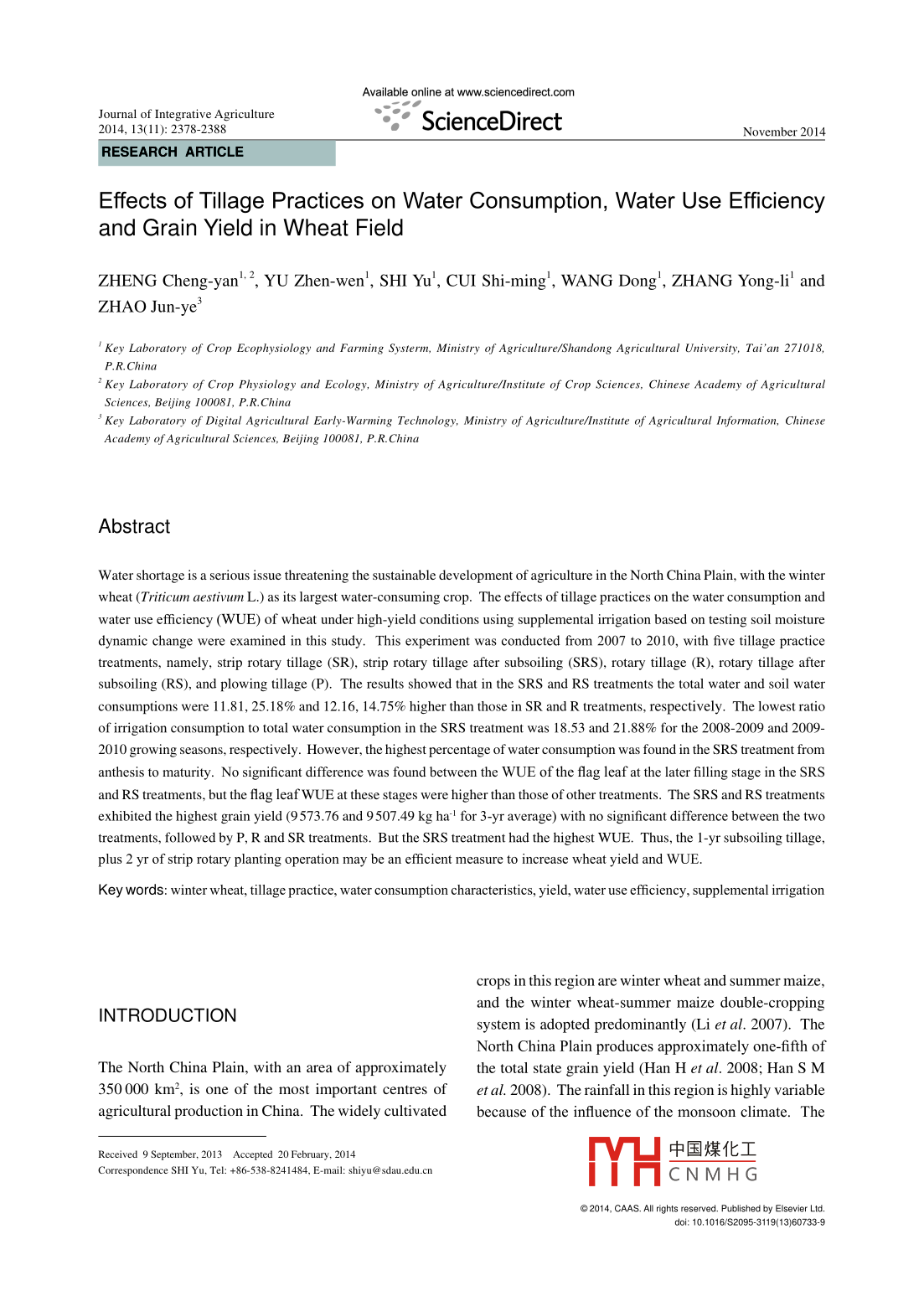 Available online at www. sciencedirect.comJournal of Integrative Agriculture。ScienceDirect2014, 13(11): 2378-2388November 2014RESEARCH ARTICLEEffects of Tillage Practices on Water Consumption, Water Use Efficiencyand Grain Yield in Wheat FieldZHENG Cheng-yan'2, YU Zhen-wen', SHI Yu', CUI Shi-ming , WANG Dong', ZHANG Yong-lil andZHAO Jun-ye''Key Laboratory of Crop Ecophysiology and Farming Systerm, Ministry of Agriculture/Shandong Agriculural University, Tai'an 271018,P.R.China2 Key Laboratory of Crop Physiology and Ecology, Ministry of Agriculture/Institute of Crop Sciences, Chinese Academy of AgriculturalSciences, Beijing 100081, P.R.China3 Key Laboratory of Digital Agricultural Early- Warming Technology, Ministry of Aricuture/Instiute of Agricultural Information, ChineseAcademy of Agricultural Sciences, Bejing 100081, P.R. ChinaAbstractWater shortage is a serious issue threatening the sustainable development of agriculture in the North China Plain, with the winterwheat (Triticum aestivum L.) as its largest water-consuming crop. The effects of tllage practices on the water consumption andwater use efficiency (WUE) of wheat under high-yield conditions using supplemental irigation based on testing soil moisturedynamic change were examined in this study. This experiment was conducted from 2007 to 2010, with five tllage practicetreatments, namely, strip rotary tllage (SR), strip rotary tllage after subsoiling (SRS), rotary tllge (R), rotary tllage aftersubsoiling (RS), and plowing tllage (P). The results showed that in the SRS and RS treatments the total water and soil waterconsumptions were 11.81, 25.18% and 12.16, 14.75% higher than those in SR and R treatments, respectively. The lowest ratioof rrigation consumption to total water consumption in the SRS treatment was 18.53 and 21.88% for the 2008-2009 and 2009-2010 growing seasons, respectively. However, the highest percentage of water consumption was found in the SRS treatment fromanthesis to maturity. No significant difference was found between the WUE of the flag leaf at the later flling stage in the SRSand RS treatments, but the flag leaf WUE at these stages were higher than those of other treatments. The SRS and RS treatmentsexhibited the highest grain yield (9 573.76 and 9507 49 kg hat for 3-yr average) with no significant difference between the twotreatments, followed by P, R and SR treatments. But the SRS treatment had the highest WUE. Thus, the 1-yr subsoiling tllage,plus 2 yr of strip rotary planting operation may be an eficient measure to increase wheat yield and WUE.Key words: winter wheat, tllage practice, water consumption characteristics, yield, water use efficiency, supplemental irigationcrops in this region are winter wheat and summer maize,and the winter wheat-summer maize double-croppingINTRODUCTIONsystem is adopted predominantly (Li et al. 2007). TheNorth China Plain produces approximately one-fifth ofThe North China Plain, with an area of approximatelythe total state grain yield (Han H et al.2008; Han S M350 000 km?, is one of the most important centres of et al. 2008). The rainfall in this region is highly variableagricultural production in China. The widely cultivatedbecause of the infuence of the monsoon climate. TheReceived 9 September, 2013 Accepted 20 February.2014中國(guó)煤化工Correspondence SHI Yu, Tel: +86- 538-8241484, E-mail: shiyu@ sdau.edu.cnYHCNM HG◎2014, CAAS. All rights reserved. Published by Elsevier Ltd.doi: 10.1016/S2095-3119(13)60733-9Effects of Tllage Practices on Water Consumption, Water Use Eficiency and Grain Yield in Wheat Field2379mean annual precipitation is 550 to 650 mm, a majority et al. 2005). Guzha et al. (2004) and Taa et al. (2004),of which occurs from June to September. Therefore,however, observed that wheat yields from no tillage andwater resource deficiency is one of the major problems minimum tllage were lower than those from traditionalin winter wheat production (Xiong et al.2010).tllage. Thus, before conservation tllage practices becomeIn the major crop production regions in China, some widely adopted in any particular region, their suitabiltyconventional soil management practices amplified theshould be locally assessed. In these experiments, thesoil, water and nutrient losses, and degraded soils with efects of tllge practice on water consumption and waterlow organic matter content and fragile physical structure use eficiency (WUE) under high-yield conditions were(Fabrizi et al.2005; He et al.2007; Su etal.2007; de examined using supplemental irigation based on theVita et al. 2007). In particular, the conventional tllagevariations in the testing soil moisture. A scientific basisfor wheat results in more compact soil, and a hardpan isfor the suitable tllage practice was provided to conserveusually developed underneath the plough layer, hinderingwater and attain high-yield cultivation of wheat in anair and water movements, and consequently inhibitingenvironment similar to the conditions prevailing in thisroot growth and reducing crop yield (Huang et al. 2012).experiment.Agricultural conservation technologies maintain soilRESULTSand water, increase soil moisture content and improvesoil quality and crop yields, which are beneficial to thesustainable development of agricultural production Precipitation conditions(Balwinder- Singh et al.2011; Pikul et al. 2003; Roscoeand Buurman 2003; Holland 2004; Riley et al. 2005).The mean annual precipitation for the past 60 yr (1951Compared withconventional ilage, several rserhers to 2010) and the dstribution of monthly precipitationhave found that subsoiling can decrease the effect of soilduring the study period from 2007 to 2010 are shown incompaction on crop growth (Evans et al. 1996; JenningsFig. 1. Precipitation during the winter wheat growingetal. 2012) as well as increase rooting depth and the season amounted to 228.0 mm in 2007-2008, 140.6 mmamount of water available to the crop (Lampurlanes et al.in 2008-2009 and 163.2 mm in 2