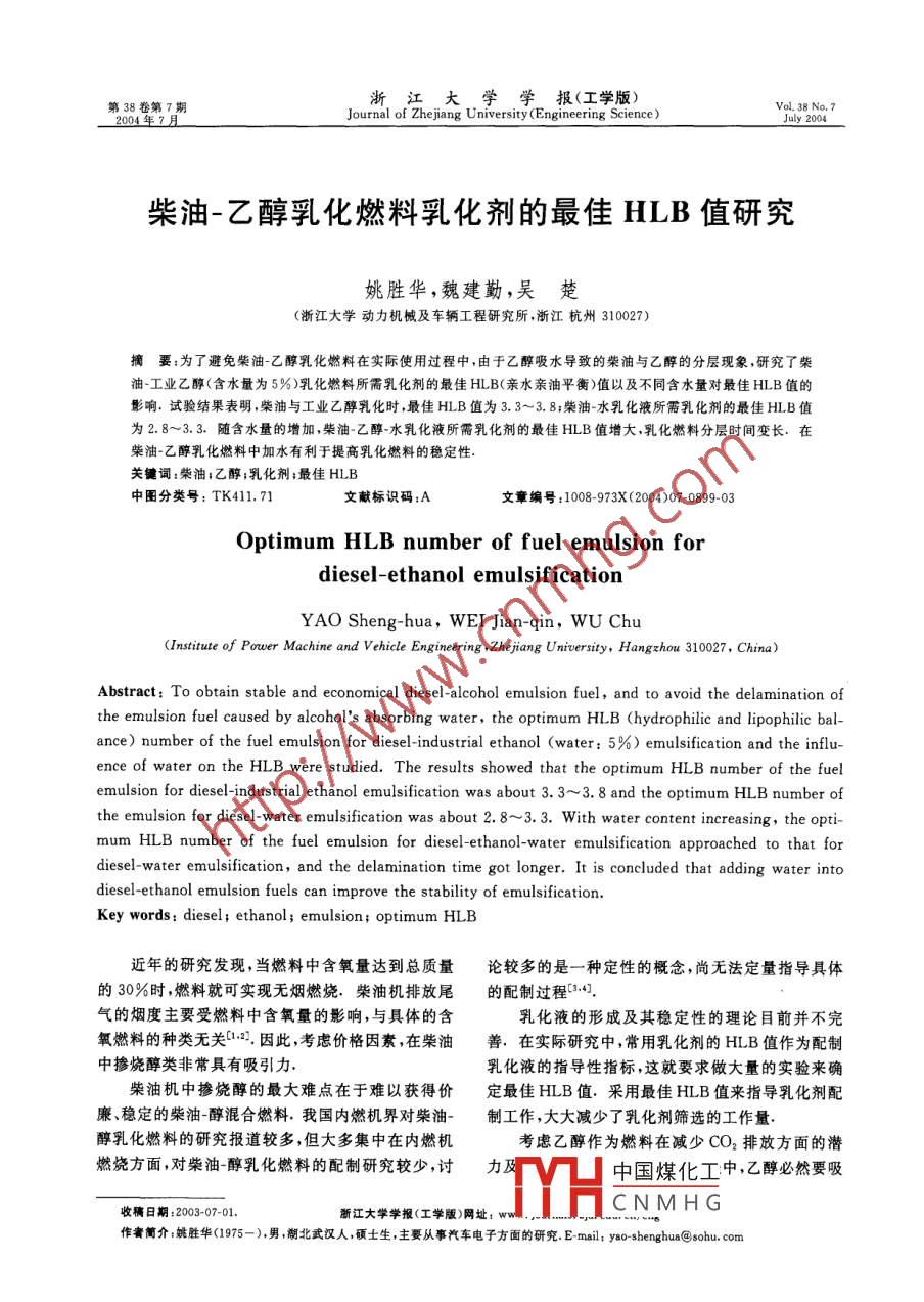 38卷第7期浙江大學(xué)學(xué)報(工學(xué)版)Journal of Zhe jiang Uniniversity(Engineering Science)柴油-乙醇乳化燃料乳化劑的最佳HLB值研究姚勝華,魏建勤,吳楚(浙江大學(xué)動力機械及車輛工程研究所,浙江杭州310027)摘要:為了避免柴油-乙醇乳化燃料在實際使用過程中,由于乙醇吸水導(dǎo)致的柴油與乙醇的分層現(xiàn)象,研究了柴油-工業(yè)乙醇(含水量為5%)乳化燃料所需乳化劑的最佳HLB(親水親油平衡)值以及不同含水量對最佳HLB值的影響,試驗結(jié)果表明,柴油與工業(yè)乙醇乳化時,最佳HLB值為3.3~38;柴油-水乳化液所需乳化劑的最佳HLB值為2.8~3.3.隨含水量的增加,柴油-乙醇水乳化液所需乳化劑的最佳HLB值增大,乳化燃料分層時間變長。在柴油-乙醇乳化燃料中加水有利于提高乳化燃料的穩(wěn)定性關(guān)鍵詞:柴油;乙醇;乳化劑;最佳HLB中圖分類號:TK411.71文獻標(biāo)識碼:A文章編號:1008-973X(2004)07-089903Optimum HLB number of fuel emulsion fordiesel-ethanol emulsificationYAO Sheng-hua, WEI Jian-qin, WU ChuInstitute of Power Machine and Vehicle Engineering, Zhejiang University, Hangzhou 310027, ChirAbstract: To obtain stable and economical diesel-alcohol emulsion fuel, and to avoid the delamination ofthe emulsion fuel caused by alcohols absorbing water, the optimum HLB(hydrophilic and lipophilic balance)number of the fuel emulsion for diesel-industrial ethanol (water: 5%)emulsification and the inflence of water on the hlB were studied. The results showed that the optimum HLB number of the fuelemulsion for diesel-industrial ethanol emulsification was about 3.3-3. 8 and the optimum HLB number ofthe emulsion for diesel-water emulsification was about 2.8-3. 3. With water content increasing, the optimum HLB number of the fuel emulsion for diesel-ethanol-water emulsification approached to that fordiesel-water emulsification, and the delamination time got longer. It is concluded that adding water intodiesel-ethanol emulsion fuels can improve the stability of emulsificationKey words: diesel; ethanol; emulsion; optimum HLB近年的研究發(fā)現(xiàn),當(dāng)燃料中含氧量達到總質(zhì)量論較多的是一種定性的概念,尚無法定量指導(dǎo)具體的30%時,燃料就可實現(xiàn)無煙燃燒.柴油機排放尾的配制過程41氣的煙度主要受燃料中含氧量的影響,與具體的含乳化液的形成及其穩(wěn)定性的理論目前并不完氧燃料的種類無關(guān):2.因此,考慮價格因素,在柴油善.在實際研究中,常用乳化劑的HLB值作為配制中摻燒醇類非常具有吸引力乳化液的指導(dǎo)性指標(biāo),這就要求做大量的實驗來確柴油機中摻燒醇的最大難點在于難以獲得價定最佳HLB值.采用最佳HLB值來指導(dǎo)乳化劑配廉、穩(wěn)定的柴油醇混合燃料.我國內(nèi)燃機界對柴油-制工作,大大減少了乳化劑篩選的工作量醇乳化燃料的研究報道較多,但大多集中在內(nèi)燃機考慮乙醇作為燃料在減少CO2排放方面的潛燃燒方面對柴油醇乳化燃料的配制研究較少,討力中國煤化工中,乙醇必然要吸收稿日期:2003-07-01浙江大學(xué)學(xué)報(工學(xué)版)網(wǎng)址:wCNMHG作者簡介:姚勝華(1975-),男,湖北武漢人,碩土生主要從事汽車電子方面的研究E-mailtyao-shenghus@sohu.com大學(xué)學(xué)報(工學(xué)版)第38卷水而使柴油與乙醇發(fā)生分層的現(xiàn)象,本文研究了柴油工業(yè)乙醇(v(H2O)為5%)最佳HLB值以及不同含水量對柴油乙醇最佳HILB值的影響1研究方法采用機械攪拌方式制備乳化劑.自行設(shè)計的攪圖2柴油-水?dāng)M乳化效率曲線拌器空載轉(zhuǎn)速在11000r/min以上,對柴油、醇混合Fig 2 Emulsification efficiency of diesel-water fuel by液的攪拌時間只需1min左右即可使柴油與醇均勻analogy混合·為了避免高速攪拌時溫度升高,從而影響乳化液的特性,制備乳化劑時連續(xù)攪拌時間不超過的擬乳化效率圖乳化液的組成為:V(柴油):V(工2min,相鄰兩次攪拌時間間隔不短于10min.本研業(yè)乙醇)=8:1,V(柴油):V(水)=8:1.將等體究在實際操作時,將柴油、醇或水按一定比例配制積但HLB值不同(1.8~6.0)的乳化劑加入到配制好,置入燒杯中攪拌,得到所需乳化液好的等體積的柴油工業(yè)乙醇混合液中圖中橫坐標(biāo)采用靜置等待、自然分層的辦法來獲得分層時為HLB值縱坐標(biāo)為分層時間比間.分層時間由目測確定.使用單側(cè)平行光源入射從圖1、2可知,當(dāng)HLB值為3.3~3.8時,柴試樣,觀察者從垂直于入射光的方向觀測,觀測距離油工業(yè)乙醇的分層時間最長;當(dāng)HLB值為2.8~不大于25cm,乳化柴油形成均質(zhì)的乳白色或乳黃3.3時,柴油水的分層時間最長,因此柴油工業(yè)乙色液體。一旦這種均質(zhì)液體中出現(xiàn)可觀測到的液滴醇所需乳化劑的最佳HLB值為3.3~3.8,柴油水或沉積物,那就意味著乳化柴油已經(jīng)開始分層規(guī)定所需乳化劑的最佳HLB值則為2.8~3.3從靜置開始到此時所經(jīng)歷的時間為分層時間22含水量對柴油-乙醇的乳化劑的最佳HLB值通過將等量、不同HLB值的乳化劑與相同的柴的影響油-工業(yè)乙醇溶液配制成多個試樣,然后測定各個試文獻[3]指出水對柴油-乙醇乳化液的分層時間樣的分層時間,確定具有最長分層時間的試樣,則這有很大影響.但缺少含水量對乳化效果影響的具體樣試樣所用乳化劑的HLB值就是最佳HLB.各試數(shù)據(jù),而且也未論及含水量不同時最佳HLB值是否樣分層時間與最長時間之比介于0~1.0,文中以變化.將不同含水量的乙醇水溶液與柴油按1:P來代表乳化效率繪出表面活性劑的擬乳