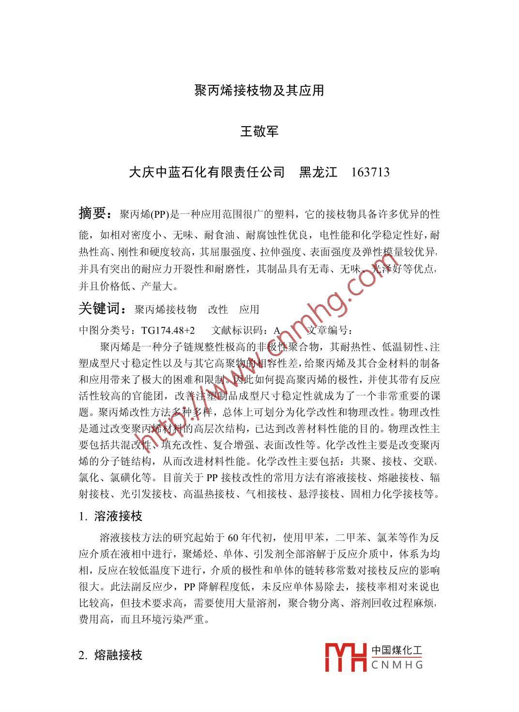 聚丙烯接枝物及其應(yīng)用王敬軍大慶中藍(lán)石化有限責(zé)任公司黑龍江163713摘要:聚丙烯(P)是一種應(yīng)用范圍很廣的塑料,它的接枝物具備許多優(yōu)異的性能,如相對(duì)密度小、無味、耐食油、耐腐蝕性優(yōu)良,電性能和化學(xué)穩(wěn)定性好,耐熱性高、剛性和硬度較髙,其屈服強(qiáng)度、拉伸強(qiáng)度、表面強(qiáng)度及彈性模量較優(yōu)異,并具有突出的耐應(yīng)力開裂性和耐磨性,其制品具有無毒、無味、光澤好等優(yōu)點(diǎn),并且價(jià)格低、產(chǎn)量大關(guān)鍵詞:聚丙烯接枝物改性應(yīng)用中圖分類號(hào):TG17448+2文獻(xiàn)標(biāo)識(shí)碼:A文章編號(hào):聚丙烯是一種分子鏈規(guī)整性極高的非極性聚合物,其耐熱性、低溫韌性、注塑成型尺寸穩(wěn)定性以及與其它高聚物的相容性差,給聚丙烯及其合金材料的制備和應(yīng)用帶來了極大的困難和限制。因此如何提高聚丙烯的極性,并使其帶有反應(yīng)活性較髙的官能團(tuán),改善注塑制品成型尺寸穩(wěn)定性就成為了一個(gè)非常重要的課題。聚丙烯改性方法多種多樣,總體上可劃分為化學(xué)改性和物理改性。物理改性是通過改變聚丙烯材料的高層次結(jié)構(gòu),已達(dá)到改善材料性能的目的。物理改性主要包括共混改性、填充改性、復(fù)合增強(qiáng)、表面改性等?;瘜W(xué)改性主要是改變聚丙烯的分子鏈結(jié)構(gòu),從而改進(jìn)材料性能?;瘜W(xué)改性主要包括:共聚、接枝、交聯(lián)、氯化、氯磺化等。目前關(guān)于PP接枝改性的常用方法有溶液接枝、熔融接枝、輻射接枝、光引發(fā)接枝、髙溫?zé)峤又?、氣相接枝、懸浮接枝、固相力化學(xué)接枝等。1.溶液接枝溶液接枝方法的硏究起始于60年代初,使用甲苯,二甲苯、氯苯等作為反應(yīng)介質(zhì)在液相中進(jìn)行,聚烯烴、單體、引發(fā)劑全部溶解于反應(yīng)介質(zhì)中,體系為均相,反應(yīng)在較低溫度下進(jìn)行,介質(zhì)的極性和單體的鏈轉(zhuǎn)移常數(shù)對(duì)接枝反應(yīng)的影響很大。此法副反應(yīng)少,PP降解程度低,未反應(yīng)單體易除去,接枝率相對(duì)來說也比較高,但技術(shù)要求高,需要使用大量溶劑,聚合物分離、溶劑回收過程麻煩,費(fèi)用高,而且環(huán)境污染嚴(yán)重。2.熔融接枝中國煤化工CNMHG熔融接枝是研究最多的一種接枝方法,反應(yīng)溫度在PP熔點(diǎn)之上(190-230℃常用單或雙螺桿擠岀機(jī)和密煉機(jī)等完成反應(yīng)特別是雙螺杄的巨大剪切力和自凈能力大大增大了PP熔體的比表面積,有利于傳質(zhì),使PP與接枝單體迅速充分地混和,保證接枝率和接枝產(chǎn)物的均勻性,反應(yīng)時(shí)加入一些含氮、磷、硫的有機(jī)化合物可在一定程度上抑制聚合物的降解反應(yīng)。此法具有操作簡單,無需回收溶劑、可以工業(yè)化連續(xù)生產(chǎn)等優(yōu)點(diǎn),但有兩大缺陷:()反應(yīng)溫度高,高溫和自由基引發(fā)劑使PP降解嚴(yán)重(2)未反應(yīng)的單體、引發(fā)劑殘留在產(chǎn)物中難以除去,阻礙了接枝共聚物功能的發(fā)揮,影響進(jìn)一步加工應(yīng)用,且設(shè)備投資大,接枝率低。3.輻射接枝輻射接枝聚合是用電子加速器產(chǎn)生的高能量電子或6o放射產(chǎn)生的中子射線照射PP引發(fā)反應(yīng),產(chǎn)生活性自由基,自由基再與單體反應(yīng)生成接枝聚合物的種接枝聚合方法。其接枝反應(yīng)的速率取決于輻照劑量的大小。此法接枝效率高反應(yīng)時(shí)間長,但技術(shù)尚未成熟,而且設(shè)備價(jià)格不菲,生產(chǎn)成本高,到目前還未實(shí)用化。4.光引發(fā)接枝光引發(fā)接枝聚合是將PP膜或纖維用芳基酮處理后,經(jīng)紫外光室溫下空氣中照射形成氫過氧化物,然后在還原劑的作用下與乙烯基單體反應(yīng)生成接枝共聚物5.懸浮接枝懸浮接枝聚合是九十年代才發(fā)展起來的一種新型接枝共聚技術(shù),它是將PP粉粒與單體一起在水相中進(jìn)行引發(fā)反應(yīng),反應(yīng)前通常在較低溫度下使聚合物和單體接觸一定時(shí)間,而后升溫反應(yīng)。其優(yōu)點(diǎn)是工藝比較簡單,溫度低且易控制,無溶劑回收問題,在反應(yīng)中若單體能溶脹聚合物則有較好的接枝率。此法不僅可以克服通常的固相接枝反應(yīng)容易岀現(xiàn)的物料粘結(jié)、攪拌和傳熱不均等缺點(diǎn),還可以在很大程度上克服PP在反應(yīng)過程中的降解現(xiàn)象,產(chǎn)物后處理也比較簡單。6.固相力化學(xué)接枝固相力化學(xué)接枝法運(yùn)用高分子在應(yīng)力作用下化學(xué)反應(yīng)的基本原理,利用應(yīng)力作用使PP降解產(chǎn)生大分子自由基,在固態(tài)下引發(fā)單體接枝共聚。反應(yīng)在借鑒中國傳統(tǒng)石磨的構(gòu)思和結(jié)構(gòu)所設(shè)計(jì)制造的磨盤型力化學(xué)反應(yīng)器中進(jìn)行,將一定配比的PP/馬來酸酐混合均勻加入到磨盤形反應(yīng)器中中國煤化工度0℃-30℃)、轉(zhuǎn)速、碾磨次數(shù)等條件下制備。此法具CNMHG發(fā)劑、催化劑和溶劑、空氣介質(zhì)、簡使節(jié)能、接枝率容易控制,易于實(shí)現(xiàn)工業(yè)化等,為PP高性能化提供了新的途徑。7聚丙烯接枝物的應(yīng)用主要在以下四個(gè)方面7.1增溶劑二種或二種以上聚合物共混體系大部分高聚物熱動(dòng)力學(xué)不相容
