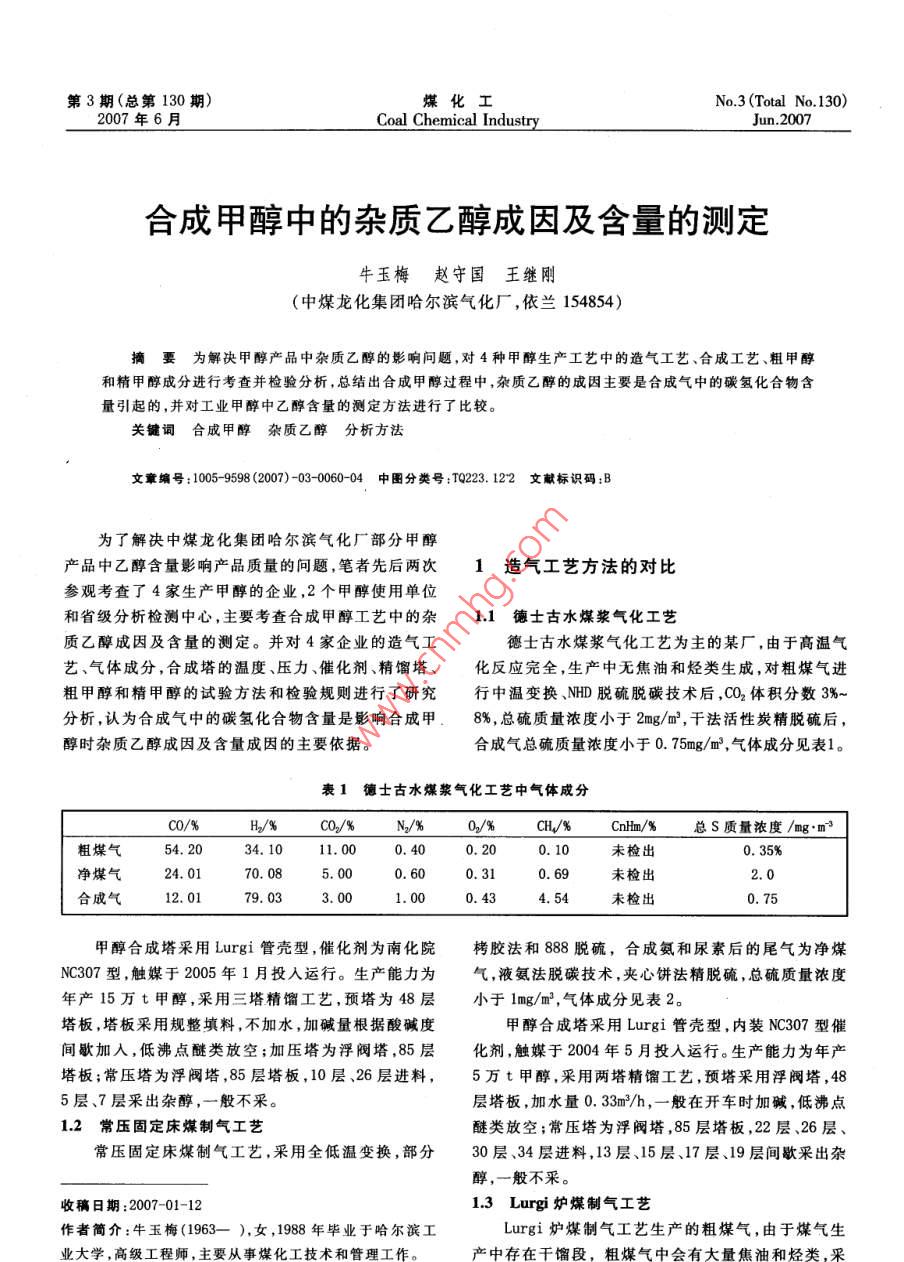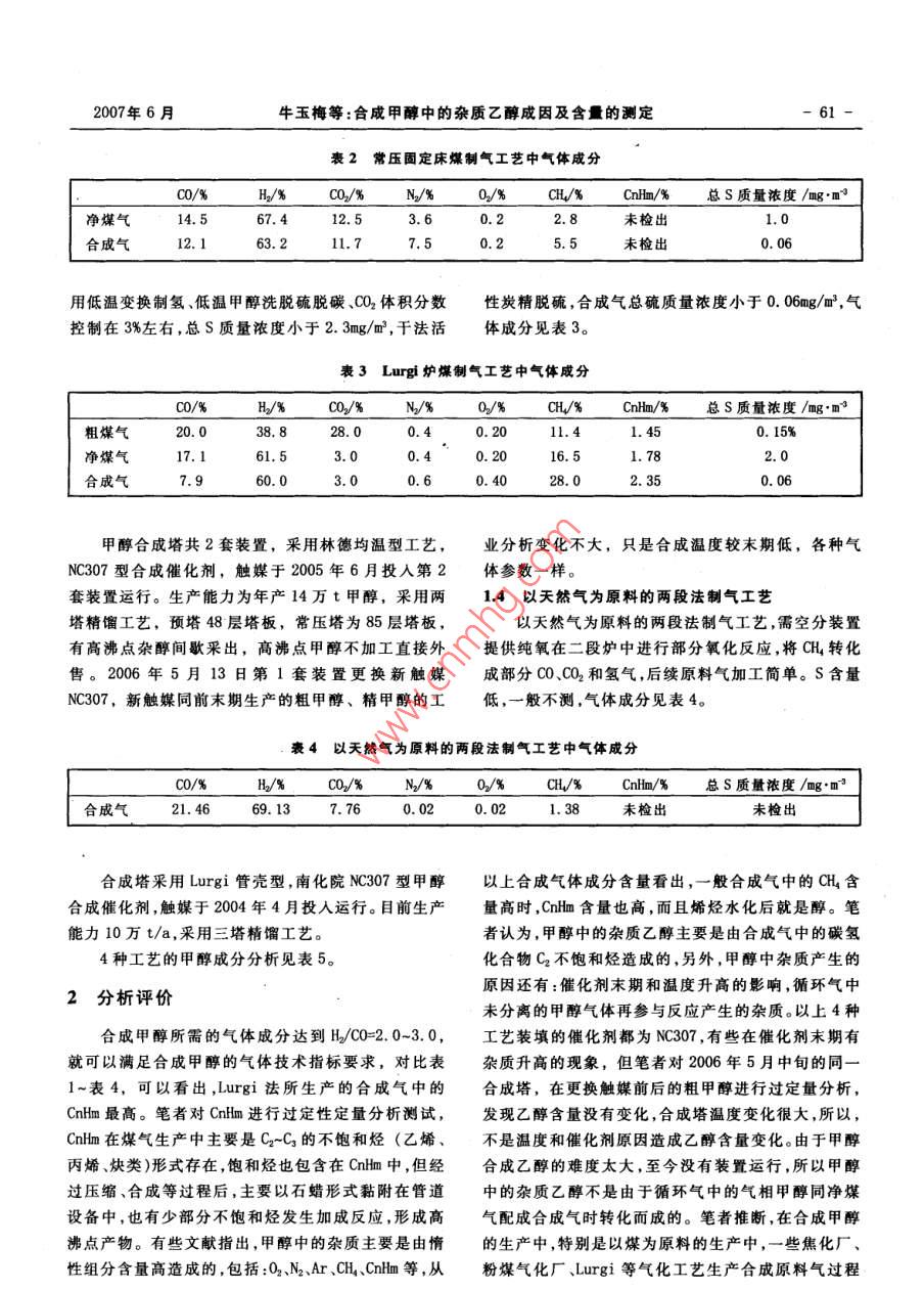 第3期(總第130期)No. 3 (Total No 130)2007年6月Coal Chemical IndustryJun.2007合成甲醇中的雜質(zhì)乙醇成因及含量的測(cè)定牛玉梅趙守國(guó)王繼剛(中煤龍化集團(tuán)哈爾濱氣化廠,依蘭154854摘要為解決甲醇產(chǎn)品中雜質(zhì)乙醇的影響問(wèn)題,對(duì)4種甲醇生產(chǎn)工藝中的造氣工藝、合成工藝、粗甲醇和精甲醇成分進(jìn)行考查并檢驗(yàn)分析,總結(jié)出合成甲醇過(guò)程中,雜質(zhì)乙醇的成因主要是合成氣中的碳?xì)浠衔锖恳鸬?并對(duì)工業(yè)甲醇中乙醇含量的測(cè)定方法進(jìn)行了比較。關(guān)鍵詞合成甲醇雜質(zhì)乙醇分析方法文章編號(hào):10059598(2007)-03-0060-04中圖分類號(hào):TQ223.122文獻(xiàn)標(biāo)識(shí)碼:B為了解決中煤龍化集團(tuán)哈爾濱氣化廠部分甲醇產(chǎn)品中乙醇含量影響產(chǎn)品質(zhì)量的問(wèn)題,筆者先后兩次1造氣工藝方法的對(duì)比參觀考查了4家生產(chǎn)甲醇的企業(yè),2個(gè)甲醇使用單位和省級(jí)分析檢測(cè)中心,主要考查合成甲醇工藝中的雜11德士古水煤漿氣化工藝質(zhì)乙醇成因及含量的測(cè)定。并對(duì)4家企業(yè)的造氣工德士古水煤漿氣化工藝為主的某廠,由于高溫氣藝、氣體成分,合成塔的溫度、壓力、催化劑、精餾塔、化反應(yīng)完全,生產(chǎn)中無(wú)焦油和烴類生成,對(duì)粗煤氣進(jìn)粗甲醇和精甲醇的試驗(yàn)方法和檢驗(yàn)規(guī)則進(jìn)行了研究行中溫變換、NHD脫硫脫碳技術(shù)后,CO2體積分?jǐn)?shù)3%~分析,認(rèn)為合成氣中的碳?xì)浠衔锖渴怯绊懞铣杉?%,總硫質(zhì)量濃度小于2mg/m3,干法活性炭精脫硫后醇時(shí)雜質(zhì)乙醇成因及含量成因的主要依據(jù)。合成氣總硫質(zhì)量濃度小于0.75mg/m3,氣體成分見(jiàn)表1。表1德士古水煤漿氣化工藝中氣體成分c0%B/%0/%N%0%a%cl%總S質(zhì)量濃度/E:m粗煤氣54.2034.1011.000.400.200.10未檢出0.35%凈煤氣24.0170.080.600.31未檢出2.0合成氣12.0179,033.000.434.54未檢出0.75甲醇合成塔采用urgi管殼型,催化劑為南化院栲膠法和888脫硫,合成氨和尿素后的尾氣為凈煤NC307型,觸媒于2005年1月投入運(yùn)行。生產(chǎn)能力為氣,液氨法脫碳技術(shù),夾心餅法精脫硫,總硫質(zhì)量濃度年產(chǎn)15萬(wàn)t甲醇,采用三塔精餾工藝,預(yù)塔為48層小于1mg/m3,氣體成分見(jiàn)表2。塔板,塔板采用規(guī)整填料,不加水,加堿量根據(jù)酸堿度甲醇合成塔采用 Lurgi管殼型,內(nèi)裝NC307型催間歇加入,低沸點(diǎn)醚類放空;加壓塔為浮閥塔,85層化劑,觸媒于2004年5月投入運(yùn)行。生產(chǎn)能力為年產(chǎn)塔板;常壓塔為浮閥塔,85層塔板,10層、26層進(jìn)料,5萬(wàn)t甲醇,采用兩塔精餾工藝,預(yù)塔釆用浮閥塔,485層、7層采出雜醇,一般不采。層塔板,加水量0.33m3/h,一般在開(kāi)車時(shí)加堿,低沸點(diǎn)12常壓固定床煤制氣工藝醚類放空;常壓塔為浮閥塔,85層塔板,22層、26層常壓固定床煤制氣工藝,采用全低溫變換,部分30層、34層進(jìn)料,13層、15層、17層、19層間歇采出雜醇,一般不采。收稿日期:2007-01-1213 Lurgi爐煤制氣工藝作者簡(jiǎn)介:牛玉梅(1963),女,1988年畢業(yè)于哈爾濱工Lurgi爐煤制氣工藝生產(chǎn)的粗煤氣,由于煤氣生大學(xué),高級(jí)工程師,主要從事煤化工技術(shù)和管理工2007年6月牛玉梅等:合成甲醇中的雜質(zhì)乙醇成因及含量的測(cè)定表2常壓固定床煤制氣工藝中氣體成分C0/%H2/%C02/%N/%0/%CH4/%Cnm/%總S質(zhì)量濃度/mg·m3凈煤氣14.567.43.6未檢出合成氣l1.77.50.2未檢出用低溫變換制氫、低溫甲醇洗脫硫脫碳、CO2體積分?jǐn)?shù)性炭精脫硫,合成氣總硫質(zhì)量濃度小于0.06mg/m3,氣控制在3%左右,總S質(zhì)量濃度小于2.3ng/m3,干法活體成分見(jiàn)表3。表3Lurg爐煤制氣工藝中氣體成分C/%CO2/%CnHm/%總S質(zhì)量濃度/mng·m3粗煤氣38.80.40.200.15%凈煤氣17.16l.53.00.40.2016.51.782.0合成氣7.960.03.00.60.4028.02.350.06甲醇合成塔共2套裝置,釆用林德均溫型工藝,業(yè)分析變化不大,只是合成溫度較末期低,各種氣NC307型合成催化劑,觸媒于2005年6月投入第2體參數(shù)一樣。套裝置運(yùn)行。生產(chǎn)能力為年產(chǎn)14萬(wàn)t甲醇,采用兩14以天然氣為原料的兩段法制氣工藝塔精餾工藝,預(yù)塔48層塔板,常壓塔為85層塔板以天然氣為原料的兩段法制氣工藝,需空分裝置有高沸點(diǎn)雜醇間歇采出,高沸點(diǎn)甲醇不加工直接外提供純氧在二段爐中進(jìn)行部分氧化反應(yīng),將CH4轉(zhuǎn)化售。2006年5月13日第1套裝置更換新觸媒成部分C0、CQ2和氫氣,后續(xù)原料氣加工簡(jiǎn)單。S含量NC307,新觸媒同前末期生產(chǎn)的粗甲醇、精甲醇的工低,一般不測(cè),氣體成分見(jiàn)表4表4以天然氣為原料的兩段法制氣工藝中氣體成分√%CnHm/%總S質(zhì)量濃度/合成氣21.4669.13760.020.021.38未檢出未檢出合成塔采用 Lurgi管殼型,南化院NC307型甲醇以上合成氣體成分含量看出,一般合成氣中的CH含合成催化劑,觸媒于2004年4月投入運(yùn)行。目前生產(chǎn)量高時(shí),Cnh恤m含量也高,而且烯烴水化后就是醇。筆能力10萬(wàn)t/a,采用三塔精餾工藝。者認(rèn)為,甲醇中的雜質(zhì)乙醇主要是由合成氣中的碳?xì)?種工藝的甲醇成分分析見(jiàn)表5?;衔顲2不飽和烴造成的,另外,甲醇中雜質(zhì)產(chǎn)生的2分析評(píng)價(jià)原因還有:催化劑末期和溫度升高的影響,循環(huán)氣中未分離的甲醇?xì)怏w再參與反應(yīng)