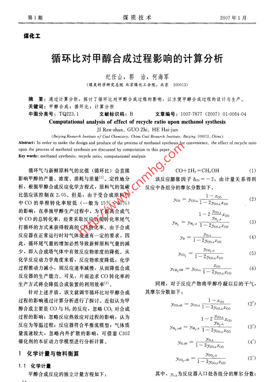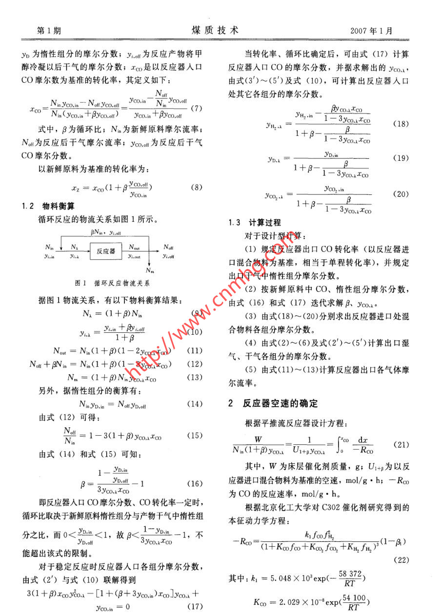 第1期煤質(zhì)技術(shù)2007年1月煤化工循環(huán)比對(duì)甲醇合成過程影響的計(jì)算分析紀(jì)任山,郭治,何海軍(煤炭科學(xué)研究總院北京煤化工分院,北京100013)摘要:通過計(jì)算分析,探討了循環(huán)比對(duì)甲醇合成過程的影響,以方便甲醇合成過程的設(shè)計(jì)與生產(chǎn)。關(guān)鍵詞:甲醇合成;循環(huán)比;計(jì)算分析中圖分類號(hào): TQ223. 1文獻(xiàn)標(biāo)識(shí)碼: B文章編號(hào): 1007-7677 (2007) 01-0064-04Computational analysis of effect of recycle ratio upon methanol systhesisJI Ren-shan, GUO Zhi, HE Hai-jun( Beijing Research Institute of Coal Chemistry, China Coal Research Institute, Beijing 100013, China)Abstract: In order to make the design and produce of the process of methanol systhesis for convenience, the effect of recycle ratioupon the process of methanol systhesis are discussed by computation in this paper.Key words: methanol systhesis; recycle ratio; computational analysis循環(huán)氣與新鮮原料氣的比值(循環(huán)比)會(huì)直接CO+2H2 =CH3OH(1)影響甲醇的產(chǎn)量、濃度、消耗與質(zhì)量。定性地分該反應(yīng)膨脹因子8co=-2,由計(jì)量關(guān)系得到析,根據(jù)甲醇合成反應(yīng)化學(xué)方程式,原料氣的氫碳反應(yīng)中各組分的摩爾分?jǐn)?shù)如下。比值應(yīng)該控制在2.05。但是,由于受合成原料氣1- .IcoYoo = Yco.(2)中CO的單程轉(zhuǎn)化率較低(一般為15%~20%)1- 2ycoxCo的影響,在單獨(dú)甲醇生產(chǎn)過程中,為了提高合成氣1一2Yco.xA Lco中CO的總轉(zhuǎn)化率,經(jīng)常采取反應(yīng)后低轉(zhuǎn)化率尾氣(3)打循環(huán)的方式來獲得較高的CO轉(zhuǎn)化率。由于合成反應(yīng)器在正常運(yùn)行時(shí)對(duì)氣體流速有一定的要求,因Y=1-22yco.,xTcoYD,a(4)此,循環(huán)尾氣量的增加必然導(dǎo)致新鮮原料氣量的減少,即人合成塔氣體中有效反應(yīng)物濃度的降低。從(5)化學(xué)反應(yīng)動(dòng)力學(xué)角度來看,反應(yīng)物濃度降低,化學(xué).過程推動(dòng)力減小,則反應(yīng)速率減慢,從而降低合成NcHgOH = JYco.1一2yco.x Ico(6)反應(yīng)器的生產(chǎn)能力??梢?,片面追求CO轉(zhuǎn)化率的生產(chǎn)方式將會(huì)降低合成裝置的利用效率[2]。同理,對(duì)于反應(yīng)產(chǎn)物將甲醇冷凝以后的干氣,針對(duì)上述矛盾,該文就調(diào)節(jié)循環(huán)比對(duì)甲醇合成其摩爾分?jǐn)?shù)如下:過程的影響通過計(jì)算分析進(jìn)行了探討。近似認(rèn)為甲1一xco醇合成主要是CO與H2的反應(yīng),忽略CO2對(duì)合成Yco.,ll = Vco.x1一3yco.xco(2')過程的影響;忽略反應(yīng)熱效應(yīng)對(duì)過程的影響,認(rèn)為1- 2 2C∞.x :Tic反應(yīng)為等溫過程;反應(yīng)器符合平推流模型;氣體質(zhì)(3')量流速較大,忽略內(nèi)外擴(kuò)散的影響,可借鑒C302催化劑的本征動(dòng)力學(xué)模型進(jìn)行分析計(jì)算。Yboe = - 3x0.x.YyD.2x(4')1化學(xué)計(jì)量 與物料衡算YCo.A(5')Jo.,.= - 3xvo.u.Co1.1 化學(xué)計(jì)量甲醇合成反應(yīng)的獨(dú)立計(jì)量方程如下:其中,y為反應(yīng)器人口處各組分的摩爾分?jǐn)?shù);64第1期煤質(zhì)技術(shù)2007年1月y為惰性組分的摩爾分?jǐn)?shù); y.or為反應(yīng)產(chǎn)物將甲當(dāng)轉(zhuǎn)化率、循環(huán)比確定后,可由式(17) 計(jì)算醇冷凝以后干氣的摩爾分?jǐn)?shù); xoo是以反應(yīng)器入口反應(yīng)器入口Co的摩爾分?jǐn)?shù),并據(jù)求解出的Vo,x,,CO摩爾數(shù)為基準(zhǔn)的轉(zhuǎn)化率,其定義如下:由式(3')~(5')及式(10), 可計(jì)算出反應(yīng)器入口處其它各組分的摩爾分?jǐn)?shù)。Nayc.n- Ntyo.d. Yco.n- N. Yo(7)βyco.xXcoNm (yco.in + Byo.oan)Yco.in + Pyco,ofe,二三3xox.cc(18)式中,β為循環(huán)比;N。為新鮮原料摩爾流率;1+β- iI - 3.co.x.Co. B_Nut為反應(yīng)后干氣摩爾流率; o.為反應(yīng)后干氣CO摩爾分?jǐn)?shù)。YD.a二YD.m(19)g以新鮮原料為基準(zhǔn)的轉(zhuǎn)化率為:1+β--3. 3yo.x Ico工= xo(1 +ρCc.o)(8)Yco2 .inYco,inYco,x = -(20)1.2物料衡算1+β-1一3co.x.co循環(huán)反應(yīng)的物流關(guān)系如圖1所示。1.3 計(jì)算過程BNm,yio對(duì)于設(shè)計(jì)型計(jì)算:Nm_↓N反應(yīng)器NostNot(1)規(guī)定反應(yīng)器出口CO轉(zhuǎn)化率(以反應(yīng)器進(jìn)Viayt,out口混合物料為基準(zhǔn),相當(dāng)于單程轉(zhuǎn)化率),并規(guī)定Na出口于氣中惰性組分摩爾分?jǐn)?shù)。圖1循環(huán)反應(yīng)物流關(guān)系(2)按新鮮原料中CO、惰性組分摩爾分?jǐn)?shù), .據(jù)圖1物流關(guān)系,有以下物料衡算結(jié)果:由式(16) 和式(17)迭代求解R、VCco.x.N,= (1 + β)N。(9)(3)由式(18)~(20)分別求出反應(yīng)器進(jìn)口處混y.. = 2'im + yio(10)合物料各組分摩爾分?jǐn)?shù)。1+β(4) 由式(2)~(6)及式(2' )~(5')計(jì)算出口濕Nout = N.(1 + β)(1 - 2yo,xco) (11)氣、干氣各組分的摩爾分?jǐn)?shù)。Noπ+βNin = N。(1 + p)(1一3yo,xco)(12)(5)由式(11)~(13)計(jì)算反應(yīng)器出口各氣體摩Na = (1 +β)Nxco.xICco .(13)爾流率。另外,據(jù)惰性組分的衡算有:NmYD,ia = NofrYD.ou(14)2反應(yīng)器空速的確定由式(12)可得:根據(jù)平推流反應(yīng)器設(shè)計(jì)方程:v.= 1-3(1+ β)vo,xT∞o(15)W1∞_ dxNn(1+β)co.x Ur+pYco.x」。-Roo(21)由式(14)和式(15)可知:YD.in其中,W為床層催化劑質(zhì)量,g; U1+p為 以反β= :3Jvco.x2coyD.of - 1(16)應(yīng)器進(jìn)口混合物料為基準(zhǔn)的空速,mol/g.h;- Roo為CO的反應(yīng)速率,mol/g. h。即反應(yīng)器人口CO摩爾分?jǐn)?shù)、CO轉(zhuǎn)