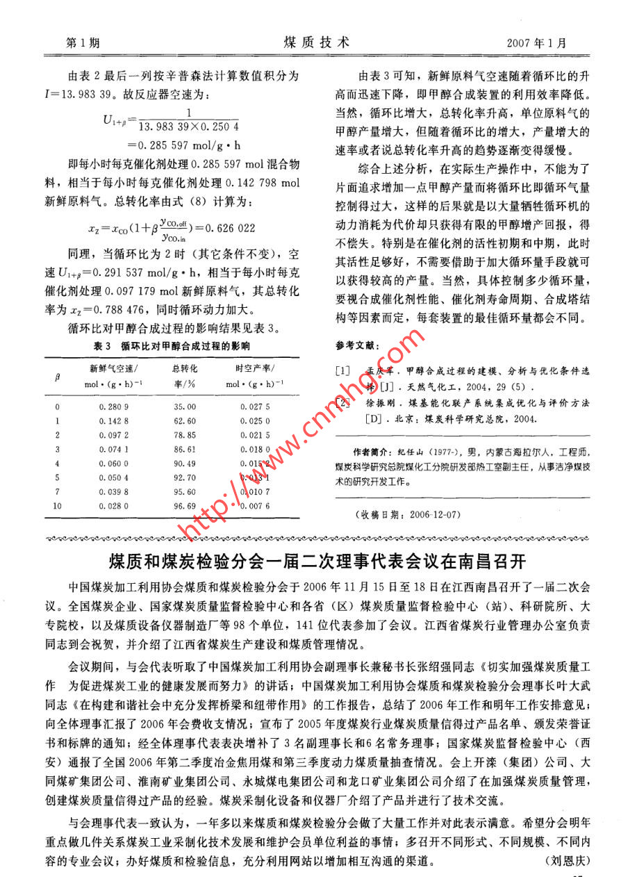 循環(huán)比對(duì)甲醇合成過程影響的計(jì)算分析