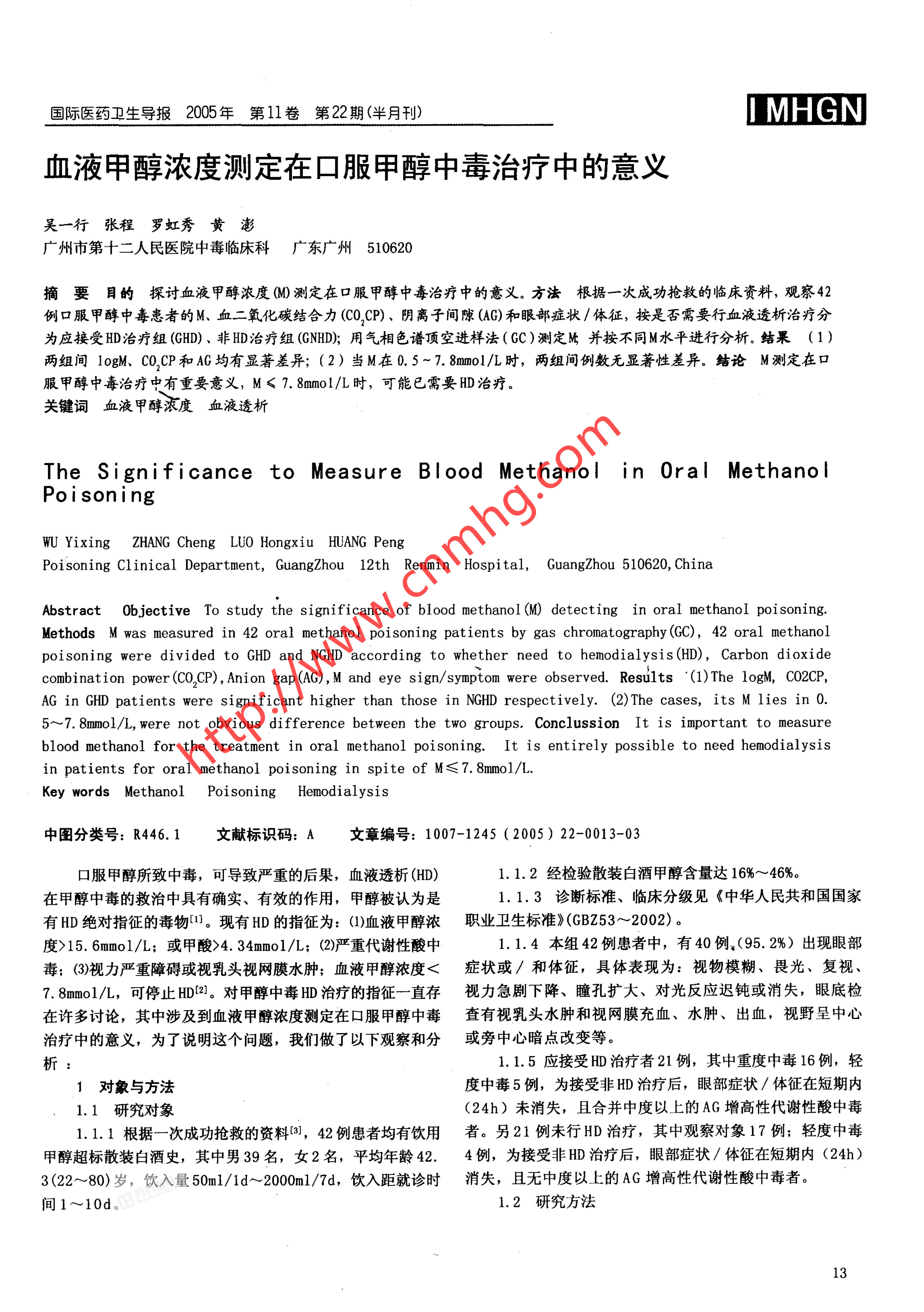 血液甲醇濃度測定在口服甲醇中毒治療中的意義