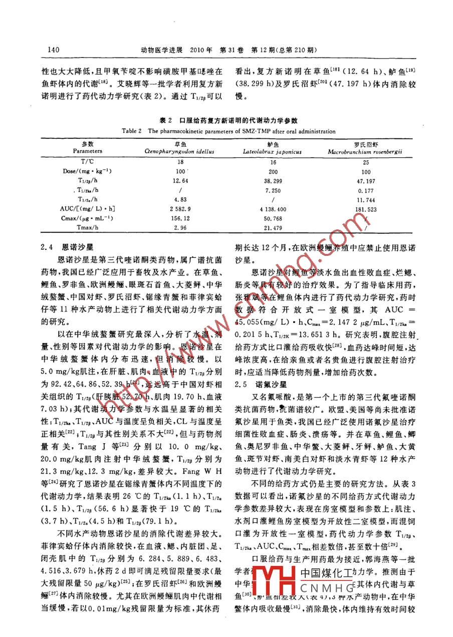 動物醫(yī)學(xué)進(jìn)展,2010,31(12):138-143Progress in Veterinary Medicine國內(nèi)漁藥代謝動力學(xué)研究現(xiàn)狀張洪玉,趙明軍’,周狀(中國水產(chǎn)科學(xué)研究院,北京100141)摘要:經(jīng)過近10年的發(fā)展,我國漁藥代謝動力學(xué)研究有了長足的進(jìn)展,截止目前,已經(jīng)對近30種漁藥進(jìn)行了研究。論文概述了土霉素、氟苯尼考、磺胺甲基晤唑、恩諾沙星和諾氟沙星等5種常用漁藥的代謝規(guī)律,包括影響因素、消除規(guī)律等研究情況,并對當(dāng)前漁藥代謝動力學(xué)研究的問題進(jìn)行了探討與分析。關(guān)鍵詞:漁藥;水產(chǎn)動物;代謝動力學(xué)中圖分類號:S948文獻(xiàn)標(biāo)識碼:B文章編號:1007-5038(2010)12-0138-06在漁用藥物代謝動力學(xué)方面,國內(nèi)起步較晚,直以上藥物中氯霉素、呋喃唑酮、環(huán)丙沙星等藥到上世紀(jì)末,我國才有組織地進(jìn)行這方面的研究。物已被我國列為水產(chǎn)養(yǎng)殖禁用藥,但它們的代謝動近10年國內(nèi)學(xué)者們做了大量的研究工作。據(jù)初步力學(xué)研究方法和結(jié)果,為其他漁藥的研究提供了參文獻(xiàn)統(tǒng)計,國內(nèi)有關(guān)漁藥代謝動力學(xué)的研究報道有考,并為我國漁藥監(jiān)管提供了科學(xué)依據(jù)近150篇,涉及近30種藥物和20多種水產(chǎn)動物。2抗菌藥劑的代謝動力學(xué)研究本文對近10年來我國漁藥代謝動力學(xué)方面的研究細(xì)菌性疾病是水產(chǎn)動物中最為常見、危害最為做了梳理總結(jié),旨在為漁藥代謝動力學(xué)進(jìn)一步發(fā)展嚴(yán)重的一類疾病抗菌藥也是生產(chǎn)上最常用的漁藥提供參考。我國已對重要的抗菌漁藥進(jìn)行了比較深人的代謝動1主要研究藥物力學(xué)研究。經(jīng)過近10年的發(fā)展,水產(chǎn)藥物代謝動力學(xué)已經(jīng)2.1土霉素涉及到包括土霉素( Oxytetracycline,OTC)、氯霉素20世紀(jì)90年代,土霉素是挪威等歐美國家的( Chloramphenicol,CAP)、氟苯尼考( Florfenicol,重要抗菌藥物,然而長期使用,藥物殘留會造成人體FF)、四環(huán)素( Tetracycline,TC)、磺胺甲基吒唑(Sula-肝損傷、免疫力降低及產(chǎn)生耐藥菌等危害,已逐漸被methoxazole,SMZ)、磺胺間甲氧嘧啶( Sulfamonome-其他抗菌藥取代。國內(nèi)學(xué)者通過口服給藥和注射給thoxiun,SMM)、磺胺二甲嘧啶( Sulfadimidinum,藥兩種方式在草魚、鯽魚、鯰魚、羅非魚、牙鲆、大菱SM)、磺胺喹啉( Sulfaquinoxaline,SQ)、甲氧芐啶鲆、黑鯛、中國對蝦等8種海水、淡水水產(chǎn)動物上進(jìn)( Trimethoprim,TMP)、瞟喹酸( Oxolinic acid,OA)、行了土霉素的代謝動力學(xué)研究。氟甲喹( Flumequine,FQ)、恩諾沙星( Enrofloxacin土霉素用于防治水產(chǎn)動物細(xì)菌性疾病,在體內(nèi)ERFX)、諾氟沙星( Norfloxacin,NFLX)、環(huán)丙沙星的消除速度較慢。在大菱鲆血液、肌肉中的半衰期( Ciprofloxacin,CPFX)、達(dá)氟沙星( Danofloxin)麻保(T1/a2)分別為219.972h、325.427h(16℃),黑沙星( Marbofloxacin,MBF)洛美沙星( Lomefloxa-鯛、羅非魚口、鯽魚Tma分別為46.663、60.312、cin)、米諾沙星( Miloxacin,MLX)、氧氟沙星(Ooxa-129.04h。根據(jù)半衰期的長短,畜禽上將藥物分為cin,OFL)、沙拉沙星( Sarafloxacin,SAR)、雙氟沙星五類,如參照這個標(biāo)準(zhǔn)進(jìn)行分類,可以將土霉素定為( Difloxacin,DIF)、呋喃唑酮( Furazolidone)、溴氯菊酯極慢消除類藥物(T/>24h)。為了保證水產(chǎn)品的Deltamethrin,DM)、乙胺嘧啶( Pyrimethamine,安全上市,需要制定合理的休藥期,目前較為公認(rèn)以PYR)、甲苯咪唑( Mebendazole,MBZ)、阿苯達(dá)唑(Al-度日(Cday)來表示。在特定溫度推薦休藥期的時bendazol,ABZ)、阿維菌素( Avermectin,AVM)等近間,水30種漁藥。HH中國煤化工消除速度將提高CNMHG收稿日期:2010-05-06基金項目:中央級公益性科研院所基本科研業(yè)務(wù)費(fèi)專項資全項目(2008C008)作者簡介:張洪玉(1981-)男,內(nèi)蒙古通遼人,研究實習(xí)員,碩士,主要從事漁藥研發(fā)工作?!巴ㄓ嵶髡邚埡橛竦?國內(nèi)漁藥代謝動力學(xué)研究現(xiàn)狀13910%。筆者認(rèn)為根據(jù)這個比例換算并估算出其他溫點叉尾血漿中吸收、分布和消除明顯加快。周群度下的休藥期,也是有一定的參考價值的。鑒于對蘭等(也證明氟苯尼考在羅氏沼蝦體內(nèi)高溫的代謝人體傷害以及產(chǎn)生耐藥性等問題,土霉素終將會淡速度比低溫的快。另外,鹽度對氟苯尼考代謝的影出漁藥市場。響也非常顯著, Feng j B等(分別在淡水和海水2.2氟苯尼考(16.5‰)條件下給羅非魚口服給藥,結(jié)果表明淡水作為氯霉素的替代藥物,具有廣譜高效的抗菌組氟苯尼考的分布水平高于海水組,但消除速率比效果,國外已在虹鱒、大西洋鮭等水產(chǎn)動物上進(jìn)行了海水組慢。系統(tǒng)深入的研究。1999年我國批準(zhǔn)氟苯尼考為國給藥方式對氟苯尼考的代謝動力學(xué)影響較大家二類新獸藥,在水產(chǎn)養(yǎng)殖上可用于治療鰻鱺愛德李靜云等以靜脈注射、肌肉注射和口服三種給藥華氏病和赤鰭病(NY5071-2002)。隨后,我國學(xué)方式研究氟苯尼考在中國明對蝦體內(nèi)的藥代動力學(xué)者在羅非魚、鯽魚、斑點叉尾鲴、中華鱉、歐洲鰻鱺、(表1),靜脈注射、肌肉注射兩種注射給藥方式的代中國對蝦、南美白對蝦、九孔鮑等8種水產(chǎn)動物上進(jìn)謝動力學(xué)特征比較相似,與藥餌給藥方式的差別較行了代謝動力