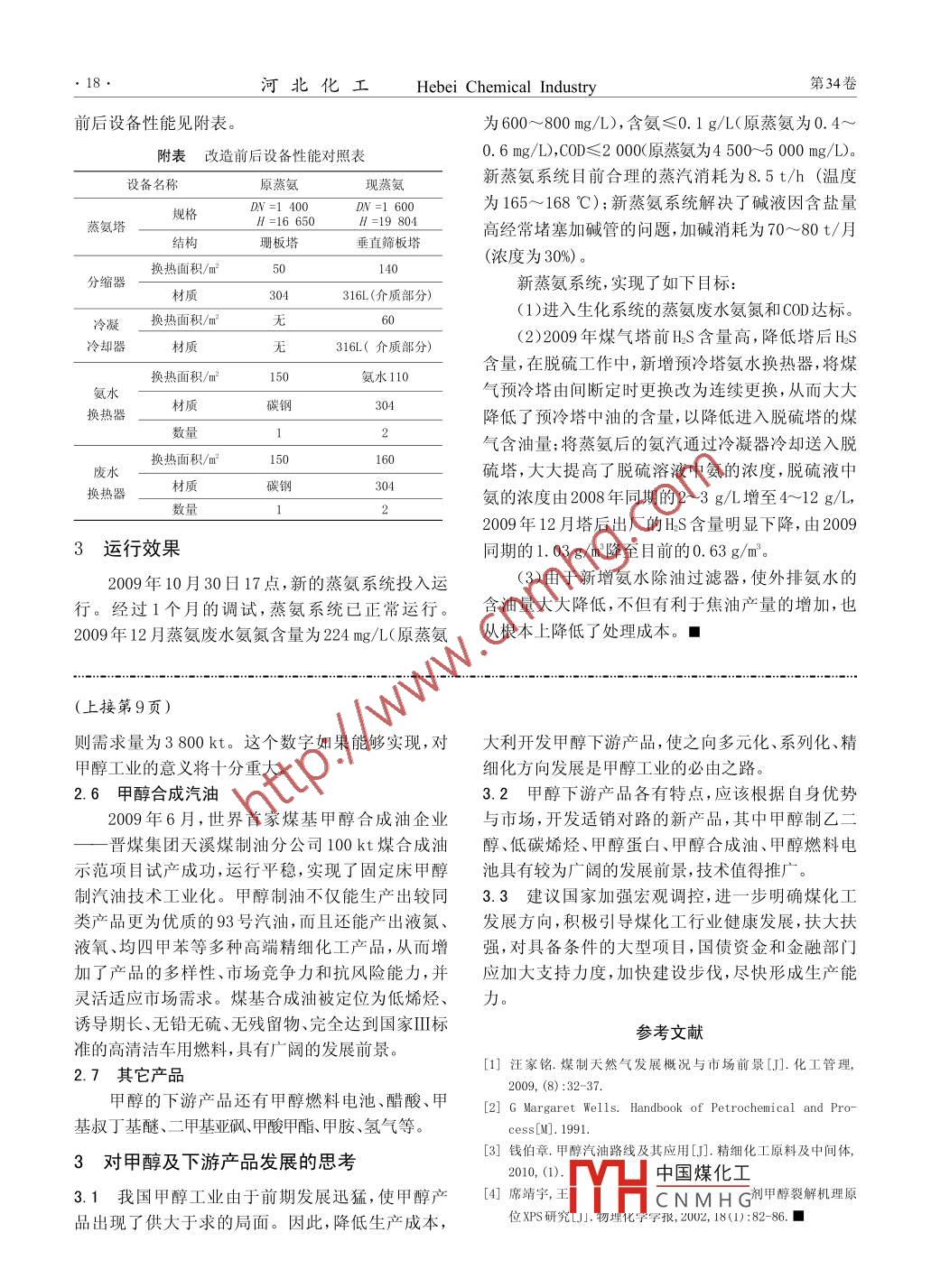 第34卷第1期Vol 34. No2011年1月HEBE HUAGONGJan 2011煤化工蒸氨系統(tǒng)的改造盛旺喜,王連根(景德鎮(zhèn)焦化工業(yè)集團(tuán),江西景德鎮(zhèn)330000摘要:針對(duì)原蒸氨系統(tǒng)存在蒸氨塔脫氨效率低、脫硫效果差等問題,提岀了蒸氨設(shè)計(jì)思路,實(shí)際應(yīng)用效果良好關(guān)鍵詞:蒸氨;廢水;脫硫液濃度中圖分類號(hào):TQ113文獻(xiàn)標(biāo)識(shí)碼:B文章編號(hào):1003-5095(2011)01-0017-02Improvement of ammonia evaporation systemSHENG Wang-Xi, WANG Lian-gen(ingdezhen Coking Industry Group, Jingdezhen 333000, China)Abstrac: To analyze the problems of the original ammonia evaporation system. To give a new ammonia evaporation ideasaimed at the existed problems. The system is better.Key words ammonia evaporation; wastewater; concentration of desulfurization solution景德鎮(zhèn)焦化工業(yè)集團(tuán)2006年11月投入運(yùn)行的過簡易焦炭過濾處理,含油量一般為20~-150mg/m3原蒸氨裝置,存在蒸氨塔脫氨效率低、脫硫效果差極易因含油過髙,造成對(duì)脫硫溶液質(zhì)量的影響。等問題,通過對(duì)蒸氨系統(tǒng)的改造,解決了問題,取得2新蒸氨系統(tǒng)設(shè)計(jì)思路了較好的結(jié)果。(1)蒸氨塔選用高效垂直篩板塔。1原有蒸氨系統(tǒng)存在問題(2)充分考慮加堿的效率,為保證在運(yùn)行過程(1)蒸氨塔脫氨效率低,主要表現(xiàn)在外排廢水中堿液與氨水的充分混和,在氨水管和堿液管的混含氨、氨氮、COD均無法達(dá)標(biāo);和處新增管道靜態(tài)混和器。(2)加堿裝置由于堿和氨水混和不均勻,脫固(3)為解決脫硫堿源不足的問題,繼續(xù)將氨汽定銨效率低引入到脫硫反應(yīng)槽溶液中,為保證脫硫溫度除増加(3)蒸氨后氨汽由于分縮器換熱面積太小,分分縮器的換熱面積外,還新增了氨冷凝冷卻器,使縮器后氨汽溫度一直無法冷卻到脫硫生產(chǎn)需要的進(jìn)入反應(yīng)槽的氨汽溫度降至40~60℃。溫度,當(dāng)80℃以上氨汽進(jìn)入脫硫反應(yīng)槽時(shí),不但不(4)為降低并穩(wěn)定剩余氨水含油量,在進(jìn)行蒸能使脫硫溶液堿度増加,反而使脫硫溶液溫度一直氨的氨水前増加氨水降低除油過濾器居高不下,達(dá)50~60℃,造成脫硫負(fù)反應(yīng)增多,嚴(yán)重(5)為保證蒸氨的長期穩(wěn)定運(yùn)行、充分利用廢影響脫硫效果水余熱,蒸氨塔材質(zhì)由304改為316L不銹鋼,廢水(4)氨水進(jìn)塔前沒有經(jīng)過高效除油過濾,只經(jīng)冷卻器和氨水冷卻器材質(zhì)均改為304不銹鋼。改造中國煤化工來稿日期:2010-12CNMHG作者簡介:盛旺喜(1968-),男,高級(jí)工程師,長期從事企業(yè)化工生產(chǎn)、技術(shù)管王持配保技不以關(guān)項(xiàng)目,成功運(yùn)用了“J法”配煤技術(shù),為企業(yè)節(jié)省原材料成本15%以上,電話:13582167276,E-mail:xd70@yahoo.coms18河北化工 Hebei Chemical Industry前后設(shè)備性能見附表。為600~800mg/L),含氨≤0.1g/L(原蒸氨為0.4~附表改造前后設(shè)備性能對(duì)照表0.6mg/L),COD≤2000原蒸氨為4500~5000mg/L)設(shè)備名稱原蒸氨新蒸氨系統(tǒng)目前合理的蒸汽消耗為8.5t/h(溫度DN=1400為165~168℃);新蒸氨系統(tǒng)解決了堿液因含鹽量蒸氨H=16650高經(jīng)常堵塞加堿管的問題,加堿消耗為70~80t/月珊板塔垂直篩板塔(濃度為30%)換熱面積/m分縮器新蒸氨系統(tǒng),實(shí)現(xiàn)了如下目標(biāo):材質(zhì)316L(介質(zhì)部分)(1)進(jìn)入生化系統(tǒng)的蒸氨廢水氨氮和COD達(dá)標(biāo)。冷凝換熱面積/m2無冷卻器材質(zhì)316L(介質(zhì)部分)(2)2009年煤氣塔前HsS含量高,降低塔后HS換熱面積/m2含量,在脫硫工作中,新増預(yù)冷塔氨水換熱器,將煤氨水110氣預(yù)冷塔由間斷定時(shí)更換改為連續(xù)更換,從而大大材質(zhì)304換熱器碳鋼降低了預(yù)冷塔中油的含量,以降低進(jìn)入脫硫塔的煤里氣含油量;將蒸氨后的氨汽通過冷凝器冷卻送入脫換熱面積/m2廢水硫塔,大大提高了脫硫溶液中氨的濃度,脫硫液中換熱器材質(zhì)碳鋼氨的濃度由2008年同期的2~3g/L增至4~12g/L,數(shù)量2009年12月塔后出廠的HS含量明顯下降,由20093運(yùn)行效果同期的1.03g/m3降至目前的0.63g/m3。2009年10月30日17點(diǎn),新的蒸氨系統(tǒng)投入運(yùn)(3)由于新增氨水除油過濾器,使外排氨水的行。經(jīng)過1個(gè)月的調(diào)試,蒸氨系統(tǒng)已正常運(yùn)行。含油量大大降低,不但有利于焦油產(chǎn)量的增加,也2009年12月蒸氨廢水氨氮含量為224mg/L(原蒸氨從根本上降低了處理成本?!?上接第9頁)則需求量為3800kt。這個(gè)數(shù)字如果能夠?qū)崿F(xiàn),對(duì)大利開發(fā)甲醇下游產(chǎn)品,使之向多元化、系列化、精甲醇工業(yè)的意義將十分重大。細(xì)化方向發(fā)展是甲醇工業(yè)的必由之路2.6甲醇合成汽油3.2甲醇下游產(chǎn)品各有特點(diǎn),應(yīng)該根據(jù)自身優(yōu)勢2009年6月,世界首家煤基甲醇合成油企業(yè)與市場,開發(fā)適銷對(duì)路的新產(chǎn)品,其中甲醇制乙晉煤集團(tuán)天溪煤制油分公司l00kt煤合成油醇、低碳烯烴、甲醇蛋白、甲醇合成油、甲醇燃料電示范項(xiàng)目試產(chǎn)成功,運(yùn)行平穩(wěn),實(shí)現(xiàn)了固定床甲醇池具有較為廣闊的發(fā)展前景,技術(shù)值得推廣。制汽油技術(shù)工業(yè)化。甲醇制油不僅能生產(chǎn)出較同3.3建議國家加強(qiáng)宏觀調(diào)控,進(jìn)一步明確煤化工類產(chǎn)品更為優(yōu)質(zhì)的93號(hào)汽油,而且