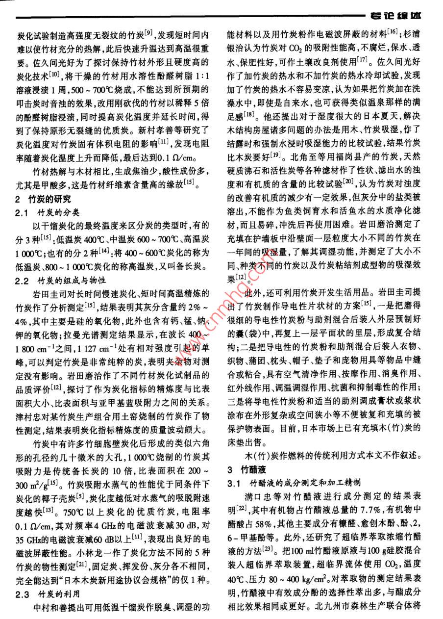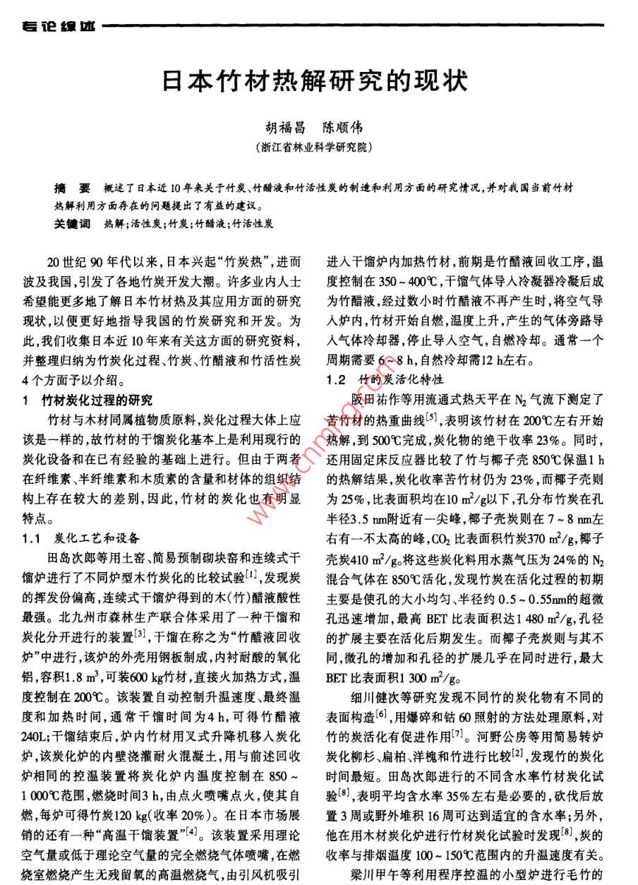 日本竹材熱解研究的現(xiàn)狀胡福昌陳順偉(浙江省林業(yè)科學研究院)摘要概述了日本近10年來關(guān)于竹炭、竹醋液和竹活性炭的制造和利用方面的研究情況,并對我國當前竹材熱解利用方面存在的問題提出了有益的建議。關(guān)鍵詞熱解;活性炭;竹炭;竹醋液;竹活性炭20世紀90年代以來,日本興起“竹炭熱”,進而進入干餾爐內(nèi)加熱竹材,前期是竹醋液回收工序,溫波及我國,引發(fā)了各地竹炭開發(fā)大潮。許多業(yè)內(nèi)人士度控制在350~400℃C,千餾氣體導人冷凝器冷凝后成希望能更多地了解日本竹材熱及其應用方面的研究為竹醋液,經(jīng)過數(shù)小時竹醋液不再產(chǎn)生時,將空氣導現(xiàn)狀,以便更好地指導我國的竹炭研究和開發(fā)。為爐內(nèi),竹材開始自燃,溫度上升,產(chǎn)生的氣體旁路導此,我們收集日本近10年來有關(guān)這方面的研究資料,人氣體冷卻器,停止導入空氣,自燃冷卻。通常一個并整理歸納為竹炭化過程、竹炭、竹醋液和竹活性炭周期需要6~8h,自然冷卻需12h左右。4個方面予以介紹。12竹的炭活化特性1竹材炭化過程的研究阪田祐作等用流通式熱天平在N2氣流下測定了竹材與木材同屬植物質(zhì)原料,炭化過程大體上應苦竹材的熱重曲線,表明該竹材在200℃左右開始該是一樣的,故竹材的于餾炭化基本上是利用現(xiàn)行的熱解,到500℃完成,炭化物的絕干收率23%。同時,炭化設備和在已有經(jīng)驗的基礎(chǔ)上進行。但由于兩者還用固定床反應器比較了竹與椰子殼850℃保溫1h在纖維素、半纖維素和木質(zhì)素的含量和材體的組織結(jié)的熱解結(jié)果,炭化收率苦竹材仍為23%,而椰子殼則構(gòu)上存在較大的差別,因此,竹材的炭化也有明顯為25%,比表面積均在10m2/g以下,孔分布竹炭在孔特點。半徑3.5m附近有一尖峰,椰子殼炭則在7~8m左1.1炭化工藝和設備右有一不太高的峰,CO2比表面積竹炭370m2/g,椰子田島次郎等用土窯、簡易預制砌塊窯和連續(xù)式干殼炭410m2/g將這些炭化料用水蒸氣壓為24%的N2餾爐進行了不同爐型木竹炭化的比較試驗,發(fā)現(xiàn)炭混合氣體在850℃活化,發(fā)現(xiàn)竹炭在活化過程的初期的揮發(fā)份偏高,連續(xù)式干餾爐得到的木(竹)醋液酸性主要是使孔的大小均勻、半徑約0.5~0.5sm的超微最強。北九州市森林生產(chǎn)聯(lián)合體采用了一種干餾和孔迅速增加,最高BET比表面積達1480m2/g,孔徑炭化分開進行的裝置,干餾在稱之為“竹醋液回收的擴展主要在活化后期發(fā)生。而椰子殼炭則與其不爐”中進行,該爐的外殼用鋼板制成,內(nèi)襯耐酸的氧化同,微孔的增加和孔徑的擴展幾乎在同時進行,最大鋁容積18m3,可裝600kg竹材,直接火加熱方式溫BE比表面積1300m3/g度控制在200℃。該裝置自動控制升溫速度、最終溫細川健次等研究發(fā)現(xiàn)不同竹的炭化物有不同的度和加熱時間,通常干餾時間為4h,可得竹醋液表面構(gòu)造6,用爆碎和鈷60照射的方法處理原料,對240L;干餾結(jié)束后,爐內(nèi)竹材用叉式升降機移入炭化竹的炭活化有促進作用7。河野公房等用簡易轉(zhuǎn)爐爐該炭化爐的內(nèi)壁澆灌耐火混凝土,用與前述回收炭化柳杉、扁柏、洋槐和竹進行比較2,發(fā)現(xiàn)竹的炭化爐相同的控溫裝置將炭化爐內(nèi)溫度控制在850~時間最短。田島次郎進行的不同含水率竹材炭化試100℃C范圍燃燒時間3h,由點火噴嘴點火,使其自驗8,表明平均含水率35%左右是必要的,砍伐后放燃,每爐可得竹炭120kg(收率20%)。在日本市場展置3周或野外堆積16周可達到適宜的含水率;另外,銷的還有一種“高溫干餾裝置”4。該裝置采用理論他在用木材炭化爐進行竹材炭化試驗時發(fā)現(xiàn)8,炭的空氣量或低于理論空氣量的完全燃燒氣體噴嘴,在燃收率與排煙溫度100~150℃范圍內(nèi)的升溫速度有關(guān)。燒室燃燒產(chǎn)生無殘留氧的高溫燃燒氣,由引風機吸引梁川甲午等利用程序控溫的小型爐進行毛竹的毒論象炭化試驗制造高強度無裂紋的竹炭,發(fā)現(xiàn)短時間內(nèi)能材料以及用竹炭粉作電磁波屏蔽的材料6;杉浦難以使竹材充分的熱解,此后快速升溫達到高溫很重銀治認為竹炭對CO2的吸附性能高,不腐爛,保水、透要。佐久間光好為了探討保持竹材外形且硬度高的水、保肥性好,可作土壤改良劑使用門。佐久間光好炭化技術(shù)10),將干燥的竹材用水溶性酚醛樹脂1:1作了加竹炭的熱水和不加竹炭的熱水冷卻試驗,發(fā)現(xiàn)溶液浸漬1周,500~700℃燒成,不能達到所預期的加了竹炭的熱水不容易變涼,認為如果把竹炭加在洗叩擊炭時音濁的效果,改用剛砍伐的竹材以稀釋5倍澡水中,即使是自來水,也可獲得類似溫泉那樣的滿的酚醛樹脂浸漬同時提高炭化溫度并延長時間得足感。他還提出對于濕度很大的日本夏天,解決到了保持原形無裂縫的優(yōu)質(zhì)炭。新村孝善等研究了木結(jié)構(gòu)房屋諸多問題的辦法是用木、竹炭吸濕,作了炭化溫度對竹炭固有體積電阻的影響,發(fā)現(xiàn)電阻結(jié)露時和強制水浸時吸濕能力的比較試驗結(jié)果竹炭率隨著炭化溫度上升而降低,最后達到0.1mcmo比木炭要好9。北角至等用福崗縣產(chǎn)的竹炭,天然竹材熱解與木材相比,生成焦油少酸性成份多,硬質(zhì)沸石和活性炭等各種濾材作了性狀、濾出水的濁尤其是甲酸多,這是竹材纖維素含量高的緣故5。度和有機質(zhì)的