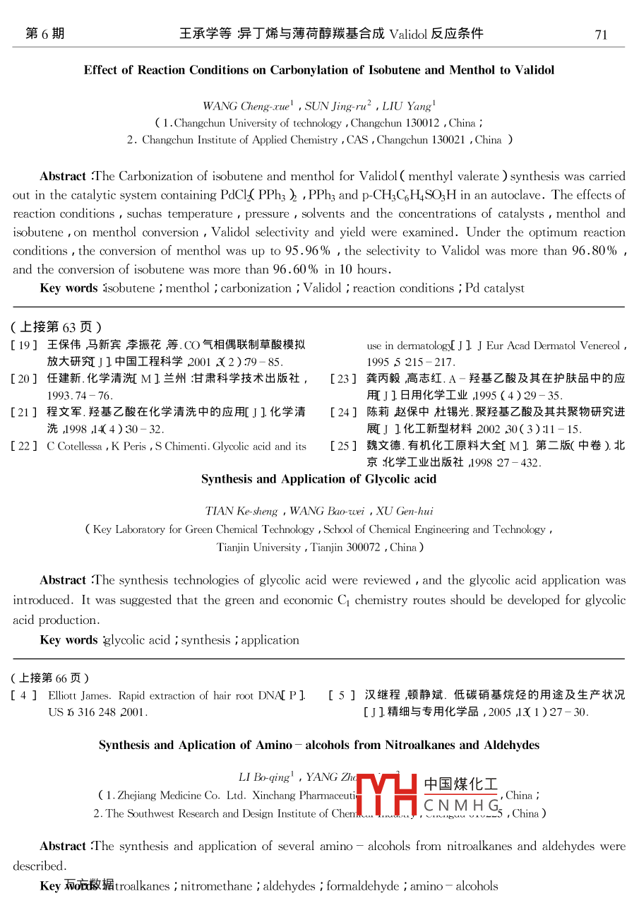 天然氣化工2006年第31卷乙醇酸的合成及應(yīng)用田克勝王保偉”許根慧天津大學化工學院綠色合成與轉(zhuǎn)化教育部重點實驗室天津300072)摘要泙述了的乙醇酸的合成方法并介紹了其用途。指出應(yīng)開發(fā)綠色、經(jīng)濟的C化學合成路線。關(guān)鍵詞乙醇酸合成方法應(yīng)用中圖分類號:Q23.2文獻標識碼:文章編號:001-92192006)6-60-04乙醇酸又稱羥基乙酸、甘醇酸是最簡單的α-羥2HOCH, COH- HOCH, CO, CH,COH+HO (1)基酸。在自然界尤其是甘蔗、甜菜以及未成熟的葡萄汁中存在但其含量甚低且與其它物質(zhì)共存灘難2HOCH,CO,H-fO+2H,O(2)于提純分離。工業(yè)上采用合成的方法來得到。乙醇nHOCH,CO,H-H OCH,CO OH+(n-I,0 (3)酸是一種重要的有機合成中間體和化工產(chǎn)品純品(1和2兩種酯化物很容易水解生成游離的乙為無色易潮解晶體工業(yè)品有70%的淡黃色水溶液醇酸(3泩成了高分子聚合物這種聚酯可以用作等多種規(guī)格。其可用于生產(chǎn)乙二醇,可制取纖維染醫(yī)學工程材料和生物降解材料。色劑、皮革染色劑、鞣革劑、清洗劑和焊接劑的配料此外乙醇酸還可以和乳酸等有機物發(fā)生共聚。等1聚乳酸-乙醇酸PLGA)是一種重要的生物降解材目前全球產(chǎn)能約13萬#21國內(nèi)雖有一定規(guī)料具有無毒、生物兼容、可在生物體內(nèi)外降解等獨模的生產(chǎn)但生產(chǎn)工藝相對落后產(chǎn)品質(zhì)量不高在特性能廣泛應(yīng)用于縫合補強材料手術(shù)縫合線、藥相當程度上仍然依賴進口。因此加強對乙醇酸的物緩釋載體、組織工程等醫(yī)用高分子領(lǐng)域。研究十分必要1.2.2加氫反應(yīng)1乙醇酸的性質(zhì)乙醇酸加氬得到一種很重要的有機化工原料乙二醇1.1乙醇酸的物理性質(zhì)3HOCH,COOH+ H,-HOCH, CH,OH+ H,O(4)乙醇酸常溫下為無色結(jié)晶固體易潮解熔點1.2.3氨化反應(yīng)80℃沸點100℃(分解)閃點300℃(分解)相對密乙醇酸氨化生成DL甘氨酸度d3-=1.49溶于水、乙醇丙酮和乙酸微溶于乙HOCH2 COOH+ NH3-H2NCH2 COOH+HO(5)蠆謎這種最簡單的氨基酸用途很廣泛??捎糜谏a(chǎn)1.2乙醇酸的化學性質(zhì)除草劑甘磷、植物生長調(diào)節(jié)劑增甘磷,用作藥物溶乙醇酸分子中含有一個羧基和一個羥基它既劑、金霉素緩沖劑以及多種藥物合成的中間體另外是一種有機酸又是一種醇同時具有有機酸和醇的還可以作調(diào)味劑糖精去苦味劑、飼料添加劑等。性質(zhì)1.24氧化脫氫反應(yīng)1.2.1聚合反應(yīng)4V凵中國煤化工R合成乙醛酸乙醇酸分子自身含有羥基和羧基官能團能夠CN MH GOH+2HO(6)發(fā)生自身聚合反應(yīng)乙醛酸也是一種很重要的化工原料可用于生收稿日期:2006011:作者簡介:田克勝(1982-)男,碩士產(chǎn)香蘭素、口服青霉素和尿囊素。也用于生產(chǎn)減壓藥甲基多巴、兒茶酚類藥物多巴胺、白內(nèi)停和敵菌劑寺。第6期田克勝等乙醇酸的合成及應(yīng)用612合成方法研究進展性低設(shè)備檢修困難。氫氰酸和甲醛的羥甲基化反應(yīng)在常溫下能自發(fā)進行加入催化劑的目的是控制2.1氯乙酸水解法反應(yīng)速度減少副反應(yīng)的發(fā)生7。Wittemann4早在1916年就采用氯乙酸在碳羥基乙腈水解合成乙醇酸工藝簡單產(chǎn)品質(zhì)量酸鈣或碳酸鋇作用下水解制乙醇酸用這種方法制較好生產(chǎn)成本低但由于羥基乙腈合成的過程中使備乙醇酸收率可達88.7%。但是該方法生產(chǎn)乙醇用氰化物環(huán)境污染與安全壓力較大酸存在著反應(yīng)時間過長過濾緩慢,鈣離子或鋇離2.3微生物催化法生產(chǎn)羥基乙酸子的除去要消耗大量的草酸或硫酸等缺點由此造上海生物化學工程研究中心在繼七五”“八成生產(chǎn)周期長成本太高不宜于工業(yè)化生產(chǎn)。目前五”九五”期間成功研究開發(fā)了微生物催化法生產(chǎn)工業(yè)生產(chǎn)多以氬氧化鈉代替碳酸鈣或碳酸鋇。氯乙丙烯酰胺產(chǎn)業(yè)化技術(shù)之后承擔了國家十五″期間酸水解法是國內(nèi)最傳統(tǒng)的生產(chǎn)工藝的973攻關(guān)項目微生物催化轉(zhuǎn)化腈類化合物的酶也有人研究以氯乙酸為原料在氫氧化鈉與甲學研究及產(chǎn)業(yè)化技術(shù)開發(fā)″又成功研究開發(fā)了微生醇存在下反應(yīng)得到乙醇酸甲酯然后再水解得到乙物催化法生產(chǎn)羥基乙酸的產(chǎn)業(yè)化技術(shù)。該工藝技術(shù)醇酸2。該工藝流程長、收率低僅適用于小規(guī)模通過微生物發(fā)酵生產(chǎn)含有特定腈水解酶的微生物的生產(chǎn)。在常溫常壓下利用該特定的腈水解酶催化羥基乙腈楊曉輝等5研究了氯乙酸氫氧化鈉催化水解生成羥基乙酸該工藝具有底物選擇性專-產(chǎn)品純制備羥基乙酸考察了反應(yīng)中氫氧化鈉的質(zhì)量分數(shù)、度高反應(yīng)條件溫和,產(chǎn)物提純簡單,設(shè)備要求不高反應(yīng)溫度和反應(yīng)時間等條件對反應(yīng)的影響。尤其對等化學法不可比擬的優(yōu)點反應(yīng)溫度和氫氧化鈉的質(zhì)量分數(shù)等條件進行了篩24草酸電還原法選有效地控制了聚合反應(yīng)的進行同時使得氯乙酸草酸電還原合成乙醛酸在20世紀9年代已實原料中的雜質(zhì)二氯乙酸反應(yīng)生成乙醇酸。在反應(yīng)過現(xiàn)工業(yè)化9李宇展等10研究了用草酸電還原的方程中進行氣相色譜跟蹤分析最終產(chǎn)品用直接精餾法來制備乙醇酸的過程并對