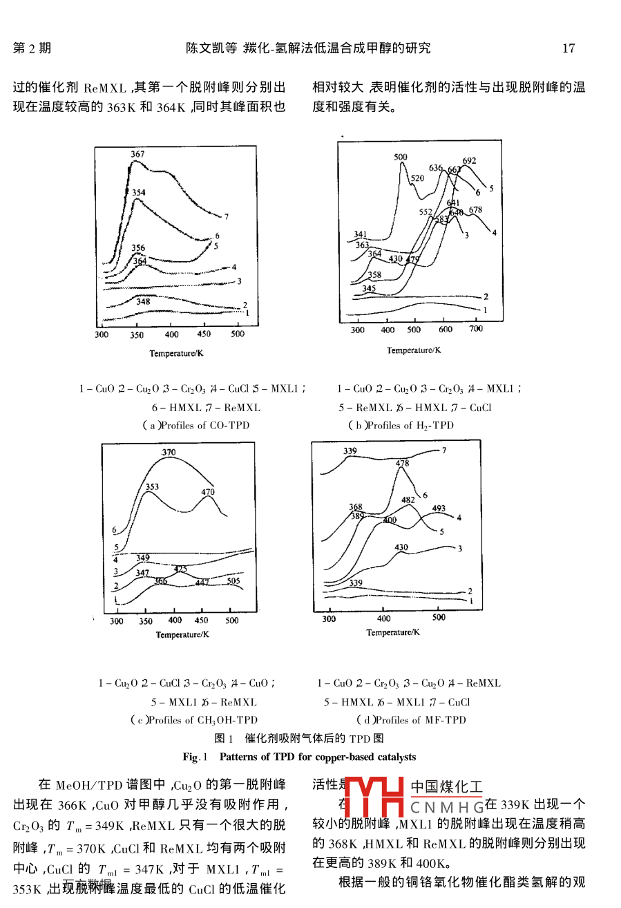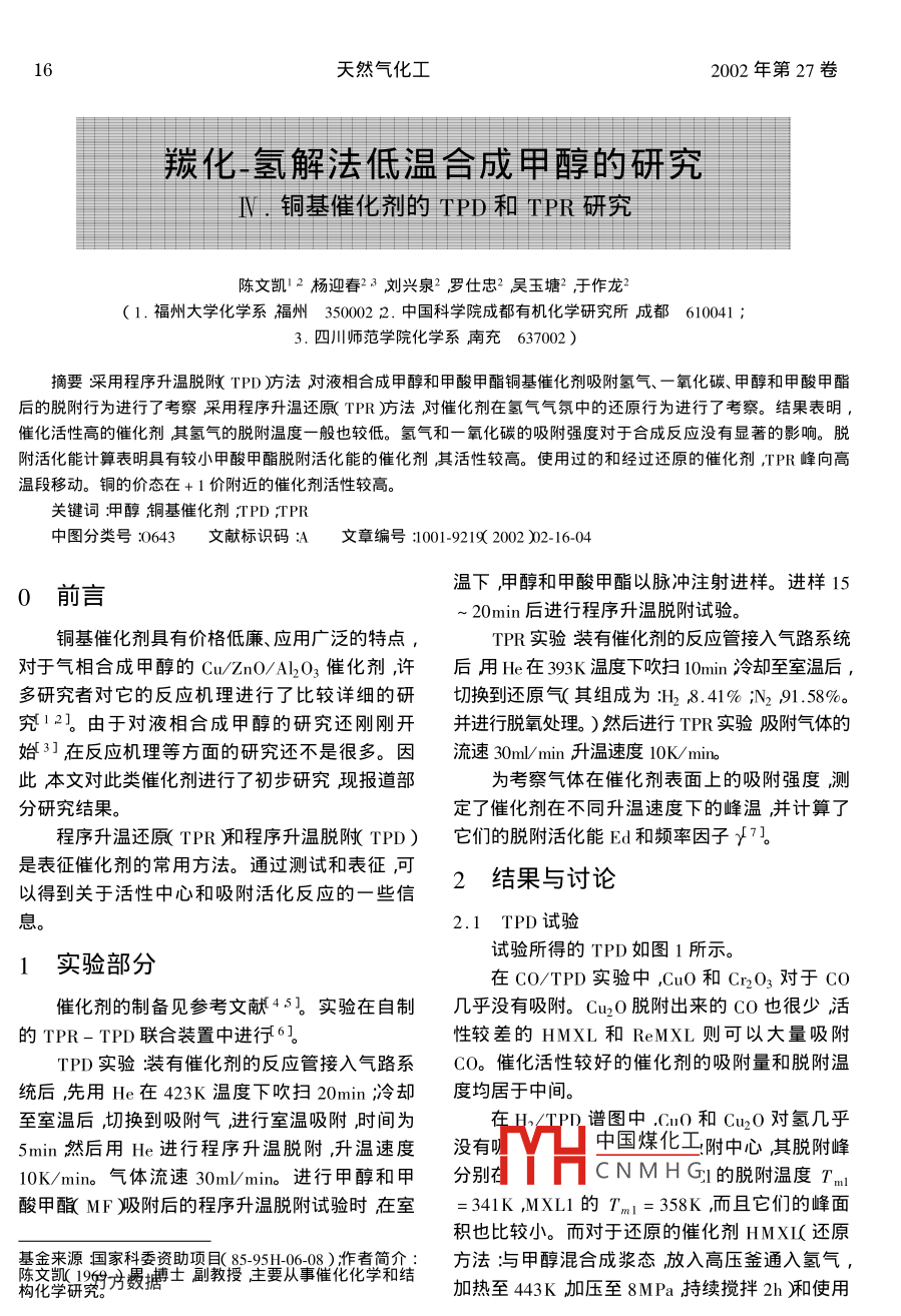 羰化-氫解法低溫合成甲醇的研究Ⅳ.銅基催化劑的TPD和TPR研究