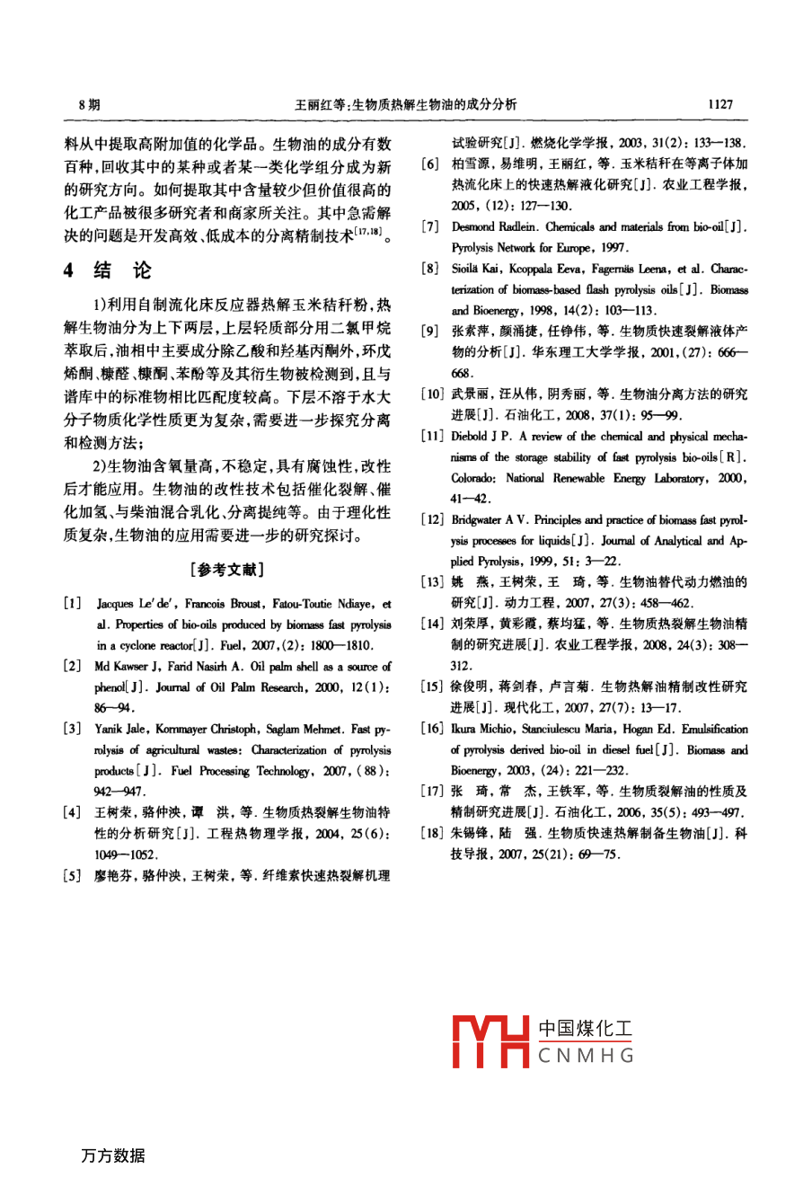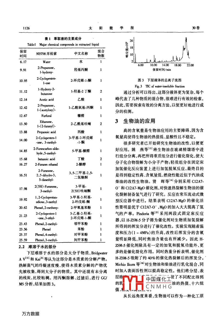 第30卷第8期太陽(yáng)能學(xué)報(bào)Vol 30. No 82009年8月ICTA ENERGIAE SOLARIS SINICAAg.,2009文章編號(hào):0254009%6(2009)03112405生物質(zhì)熱解生物油的成分分析王麗紅2,賈官臣3,柏雪源2,易維明2,殷哲2(1.沈陽(yáng)農(nóng)業(yè)大學(xué)工程學(xué)院,沈陽(yáng)10161;2.山東理工大學(xué)山東省清潔能源工程技術(shù)研究中心,淄博255049;3.淄博熱電股份有限公司,淄博2500)摘要:在流化床上快速熱解玉米秸稈粉得到成分復(fù)雜的生物油。生物油上層是溶于水的輕質(zhì)液體,下層是難溶于水的大分子物質(zhì)。用二氯甲烷萃取上層液體中的有機(jī)相,氣質(zhì)分析(GCMS)結(jié)果表明其主要成分除乙酸、羥基丙酮外,還有環(huán)戊烯酮糠醛糠酮苯酚等及其衍生物,與譜庫(kù)中的標(biāo)準(zhǔn)物對(duì)比有較高的匹配度。下層大分子部分化學(xué)性質(zhì)更為復(fù)雜需要進(jìn)一步探究分離和檢測(cè)方法。由于理化性質(zhì)復(fù)雜,生物油的應(yīng)用需要進(jìn)一步的研究探討。關(guān)鍵詞:熱解;生物油;萃取;氣相色譜/質(zhì)譜分析中圖分類號(hào);TK6文獻(xiàn)標(biāo)識(shí)碼:A0前言床反應(yīng)器,流化床系統(tǒng)如圖1熱解能力為5kg/h。采用兩級(jí)喂料裝置,確保生物質(zhì)粉連續(xù)均勻地進(jìn)入反生物質(zhì)熱解液化制取生物油是生物質(zhì)利用方式應(yīng)管且不發(fā)生堵塞。熱載體選用高鋁釩土避免發(fā)中很有前景的一項(xiàng)技術(shù),其核心是快速加熱快速冷生團(tuán)聚現(xiàn)象提高了與生物質(zhì)粉的傳熱效率。當(dāng)反卻通過快速冷卻可冷凝的氣體以期得到最大化的應(yīng)溫度500℃時(shí),玉米秸稈的生物油收集率最高為液體產(chǎn)物。熱解液化的主要產(chǎn)物是生物油生物油37.5%。是黑色酸性液體,有刺激性氣味,其構(gòu)成非常復(fù)雜,排管4廢氣除水以外,還有酸、醇、醛、酮、苯酚、呋喃等多種有含兩緩旋風(fēng)分離器」凝器氧官能團(tuán)的有機(jī)物。生物油熱值一般為16~19M口kg,pH值介于3~5之間。因反應(yīng)原料、反應(yīng)器類溫度采集型、熱解參數(shù)的不同,生物油的成分也有所不同,主監(jiān)測(cè)系統(tǒng)要表現(xiàn)在主要成分及其含量上-6。目前常用的分料斗儲(chǔ)油箱離生物油的方法有用溶劑萃取9和通過柱層析或離心分離等技術(shù)分離,但是這些方法都有待進(jìn)一步兩級(jí)螺旋喂料器完善本研究利用流化床快速熱解玉米秸稈粉,對(duì)熱熱載氣解生物油的兩部分進(jìn)行氣質(zhì)分析,并對(duì)生物油的應(yīng)用做了簡(jiǎn)單介紹。圖1流化床系統(tǒng)簡(jiǎn)圖g 1 Simplified schematic of fluidized bed pyrolysis system1材料與裝置2生物油分析實(shí)驗(yàn)原料為玉米秸稈粉,20月以下,粒徑在21輕質(zhì)液體lmm以內(nèi)。每次實(shí)驗(yàn)前將原料放入烘箱內(nèi),在105℃熱解得到的生物油有分層現(xiàn)象,上層為溶于水條件下烘24h后使用。生物質(zhì)熱解反應(yīng)器采用流化的部不資干水的子重質(zhì)部分(占總產(chǎn)中國(guó)煤化工收稿日期:200802-19基金項(xiàng)目:國(guó)家高技術(shù)研究發(fā)展(863)計(jì)劃(2007AA065Z451);國(guó)家自然科學(xué)基CN MHGOSGGI10mm2);山東理工大學(xué)科技基金(4040305018)通訊作者:易維明(1963-)男博士、博士生導(dǎo)師教授,主要從事生物質(zhì)能利用方面的研究。 weiming@ sc址,dhm8期王麗紅等:生物質(zhì)熱解生物油的成分分析1125量的0%)。每次實(shí)驗(yàn)后過濾上層溶液,除去其中少燒瓶放置在旋轉(zhuǎn)蒸餾裝置中,開始離心蒸餾。調(diào)節(jié)量殘?zhí)?因?yàn)闅執(zhí)恐泻械挠袡C(jī)酸和其他一些成分水浴溫度到50℃,至二氯甲烷不再餾出后停止。是很多反應(yīng)的催化劑,生物油中含殘?zhí)吭缴?穩(wěn)定性由于大部分有機(jī)成分存在于油相中,所以我們?cè)胶?。主要針對(duì)油相進(jìn)行氣質(zhì)聯(lián)用分析,分析儀器為Agi取一定量經(jīng)過過濾的上層生物油,按照以下步len6890/5793N。分析條件如下:驟進(jìn)行操作:①將0.lmo/L的H2SO4加到生物油中,CC條件:1909lⅣV-136 NNOWAX型毛細(xì)管柱直到溶液pH值變?yōu)?;②加入二氯甲烷油相物質(zhì)60mx0.25mmx0.25ym,柱溫采用程序升溫:初始溫溶解到其中;③萃取分離;④重復(fù)②③步驟至少3次度60℃,以升溫速率為10℃/min加熱到120℃,然后(加二氯甲烷到水相溶液中,再萃取分離);⑤向分離以s℃/min的升溫速率加熱到200℃保溫4min,載氣后的水相中加入1moL的NaoH使得pH值為12;為氦氣進(jìn)樣口溫度為280℃,分流比80:1⑥加入二氯甲烷萃取分離油相和水相;⑦重復(fù)步驟Ms條件:EI源,電子能量70eV,掃描范圍12⑥至少3次;⑧混合所有油相物質(zhì);⑨105℃,30min50am,離子源溫度150℃,接口溫度240℃。干燥50mL的蒸餾燒瓶;⑩取出燒瓶放入干燥器中冷分析結(jié)果如圖2所示。總離子流圖主要峰分離卻至室溫;①將25mL樣品注入到燒瓶中;@將蒸餾效果較好對(duì)其檢索,結(jié)果在表1中給出1242l1,1216.2713.8823.5620626.1720040060080010001200140016001800200022002400保留時(shí)間/min圖2萃取液的總離子流圖Fig2 TIC(Total ion chromatograms)of extracted liquid由表1可以看出,萃取出的油相中,主要成分中酸+醇→酯+水除羥基丙酮和乙酸外,環(huán)戊烯酮、糠醛、糠酮、苯酚等醛+水→氫氧化物及其衍生物等的含量也較高,與譜庫(kù)中標(biāo)準(zhǔn)物的匹醛+醇→半縮醛+酯+水配度