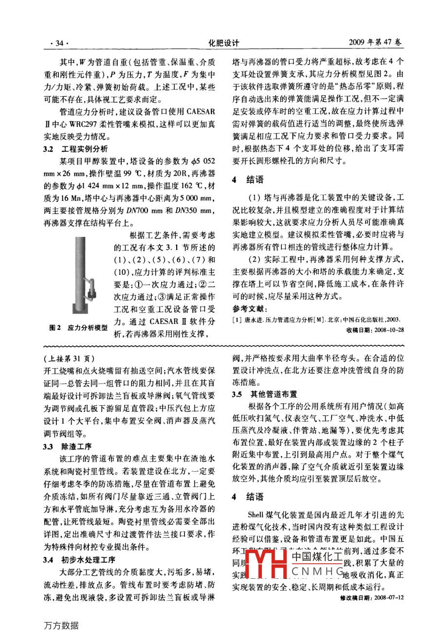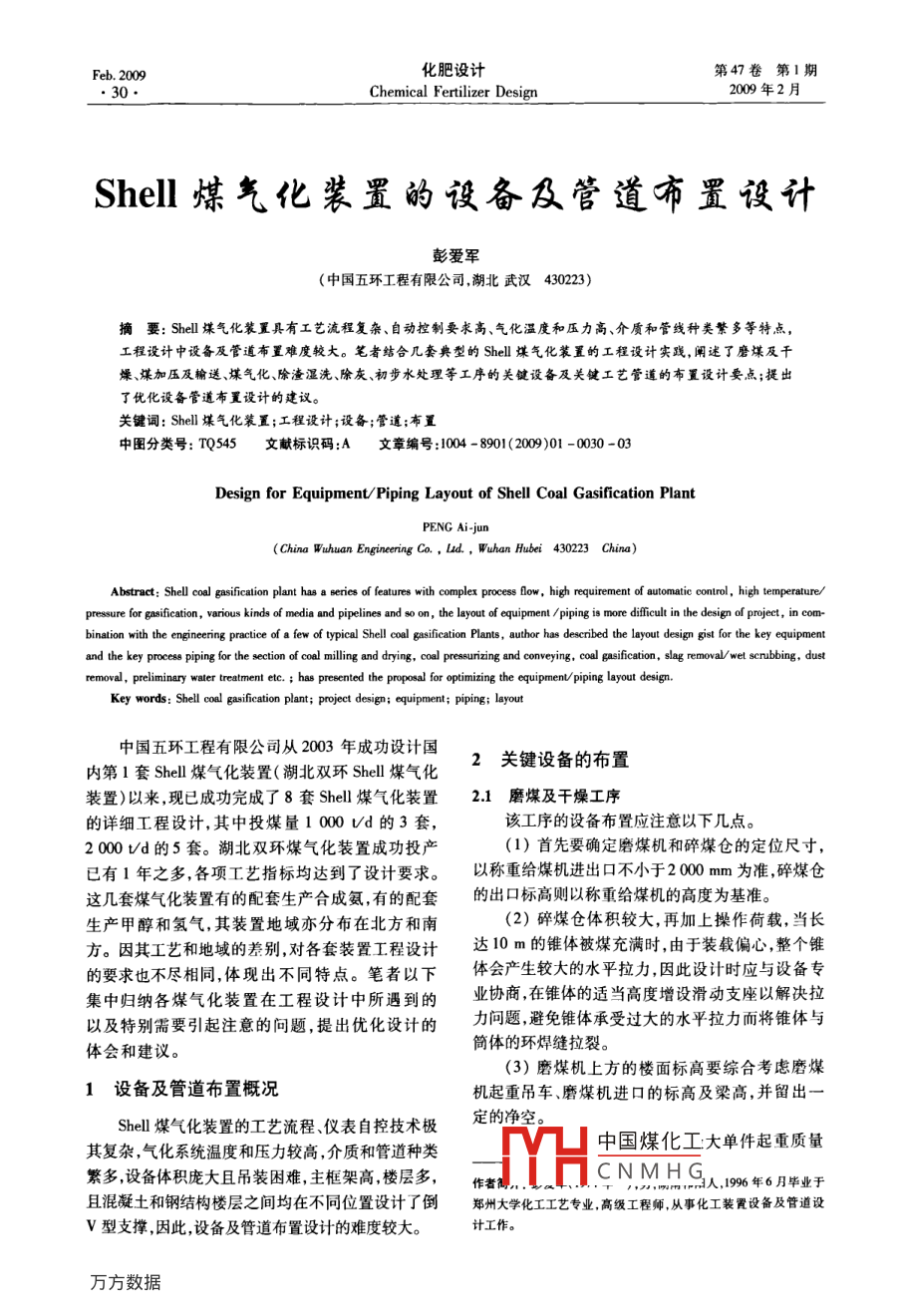 Feb. 2009化肥設(shè)計(jì)第47卷第1期●30●Chemical Fertilizer Design2009年2月Shell煤氣化裝置的設(shè)備及管道布置設(shè)計(jì)彭愛軍(中國(guó)五環(huán)工程有限公司,湖北武漢430223)摘要: Shell煤氣化裝置具有工藝流程復(fù)雜、自動(dòng)控制要求高、氣化溫度和壓力高、介質(zhì)和管線種類繁多等特點(diǎn),工程設(shè)計(jì)中設(shè)備及管道布置難度較大。筆者結(jié)合幾套典型的Shell煤氣化裝置的工程設(shè)計(jì)實(shí)踐,闡述了磨煤及干燥、煤加壓及輸送煤氣化、除渣濕洗、除灰、初步水處理等工序的關(guān)鍵設(shè)備及關(guān)鍵工藝管道的布置設(shè)計(jì)要點(diǎn);提出了優(yōu)化設(shè)備管道布置設(shè)計(jì)的建議。關(guān)鍵詞: Shell煤氣化裝置;工程設(shè)計(jì);設(shè)備;管道;布置中圖分類號(hào): TQ545文獻(xiàn)標(biāo)識(shí)碼:A文章編 號(hào):1004 - 8901(2009)01 -0030 -03Design for Equipment/Piping Layout of Shell Coal Gasification PlantPENG Ai-jun(China Wuhuan Enginering Co. , ld., Wuhan Huberi 43023 China)Abstract: Shell coal gasication plant has a series of fealures with complex process Alow. high requirement of automatie control, high temperature/resure for gasification, varous kinds of media and pipelines and s0 on, the layout of equipment / piping is more dificult in the design of projeet, in com-binalion with the engineeing practice of a few of uypical Shell coal gasification Plants, author has described the layout design gist for the key equipmentand the key process piping for the section of coal mlling and dring, coal pesurizing and conveying. coal gasification, slag removal/ wel scnubbing, dustremoval, preliminary water treatment etc. ; has presented the proposal for optimizing the equipmen/ piping layout design.Key words: Shell coal gasification plant; project design; equipment; piping; layout中國(guó)五環(huán)工程有限公司從2003年成功設(shè)計(jì)國(guó)2關(guān)鍵設(shè)備的布置內(nèi)第1套Shell煤氣化裝置(湖北雙環(huán)Shell煤氣化裝置)以來(lái),現(xiàn)已成功完成了8套Shell煤氣化裝置2.1磨煤及干燥工序的詳細(xì)工程設(shè)計(jì),其中投煤量1 000 V/d的3套,該工序的設(shè)備布置應(yīng)注意以下幾點(diǎn)。2 000V/d的5套。湖北雙環(huán)煤氣化裝置成功投產(chǎn)(1)首先要確定磨煤機(jī)和碎煤倉(cāng)的定位尺寸,已有1年之多,各項(xiàng)工藝指標(biāo)均達(dá)到了設(shè)計(jì)要求。.以稱重給煤機(jī)進(jìn)出口不小于2000mm為準(zhǔn),碎煤倉(cāng)這幾套煤氣化裝置有的配套生產(chǎn)合成氨,有的配套的出口標(biāo)高則以稱重給煤機(jī)的高度為基準(zhǔn)。生產(chǎn)甲醇和氫氣,其裝置地域亦分布在北方和南(2)碎煤倉(cāng)體積較大,再加上操作荷載,當(dāng)長(zhǎng)方。因其工藝和地域的差別,對(duì)各套裝置工程設(shè)計(jì)達(dá)10m的錐體被煤充滿時(shí),由于裝載偏心,整個(gè)錐的要求也不盡相同,體現(xiàn)出不同特點(diǎn)。筆者以下體會(huì)產(chǎn)生較大的水平拉力,因此設(shè)計(jì)時(shí)應(yīng)與設(shè)備專集中歸納各煤氣化裝置在工程設(shè)計(jì)中所遇到的.業(yè)協(xié)商,在錐體的適當(dāng)高度增設(shè)滑動(dòng)支座以解決拉以及特別需要引起注意的問(wèn)題,提出優(yōu)化設(shè)計(jì)的力問(wèn)題,避免錐體承受過(guò)大的水平拉力而將錐體與簡(jiǎn)體的環(huán)焊縫拉裂。體會(huì)和建議。(3)磨煤機(jī)上方的樓面標(biāo)高要綜合考慮磨煤.1設(shè)備及管道布置概況機(jī)起重吊車、磨煤機(jī)進(jìn)口的標(biāo)高及梁高,并留出-Shell煤氣化裝置的工藝流程、儀表自控技術(shù)極定的凈空。中國(guó)煤化工:大單件起重質(zhì)量其復(fù)雜,氣化系統(tǒng)溫度和壓力較高,介質(zhì)和管道種類繁多,設(shè)備體積龐大且吊裝困難,主框架高,樓層多,作者簡(jiǎn),.MCHC N M.H .19年6月畢業(yè)于且混凝土和鋼結(jié)構(gòu)樓層之間均在不同位置設(shè)計(jì)了倒鄭州大學(xué)化工工藝專業(yè),高級(jí)工程師,從事化工裝置設(shè)備及管道設(shè)V型支撐,因此,設(shè)備及管道布置設(shè)計(jì)的難度較大。計(jì)工作。第1期彭愛軍Shell 煤氣化裝置的設(shè)備及管道布置設(shè)計(jì)●31.確定單軌吊噸位,以風(fēng)機(jī)殼清灰口高出地面500mm的角度和各個(gè)設(shè)備吊裝方案來(lái)確定支撐點(diǎn)標(biāo)高和以上確定支撐點(diǎn)標(biāo)高。后澆梁板的條件;對(duì)于飛灰貯倉(cāng)的支撐高度要依據(jù)(5)由于熱風(fēng)爐出口與磨煤機(jī)進(jìn)口相距較近,下灰方式確定其出口高度后再定;同時(shí)在高溫高壓且介質(zhì)溫度在250 C以上,應(yīng)盡量以兩者管口中心飛灰過(guò)濾器頂部設(shè)計(jì)合適噸位的吊車,隨整個(gè)煤氣線同高來(lái)確定熱風(fēng)爐的支撐點(diǎn)標(biāo)高?;蚣芄灿?并在約46 m高的樓層設(shè)計(jì)接力吊車。2.2 煤加壓及輸送工序2.6初步水處理 及公用工程工序該工序設(shè)備布置的要點(diǎn)如下。由于各個(gè)取樣,點(diǎn)和泵等眾多排放點(diǎn)的污水大(1)因該工序的設(shè)備布置基本上是按照葫蘆部分經(jīng)過(guò)自流匯集于排污水收集槽,因此布置排污串的方式,因此,需吊裝設(shè)備的布置應(yīng)嚴(yán)格按吊裝水收集槽時(shí)要保證其與所有排污點(diǎn)有足夠的高差。方案進(jìn)行,并提出結(jié)構(gòu)條件。加熱高壓氮?dú)庥脩艟诟邩菍?因此應(yīng)將
