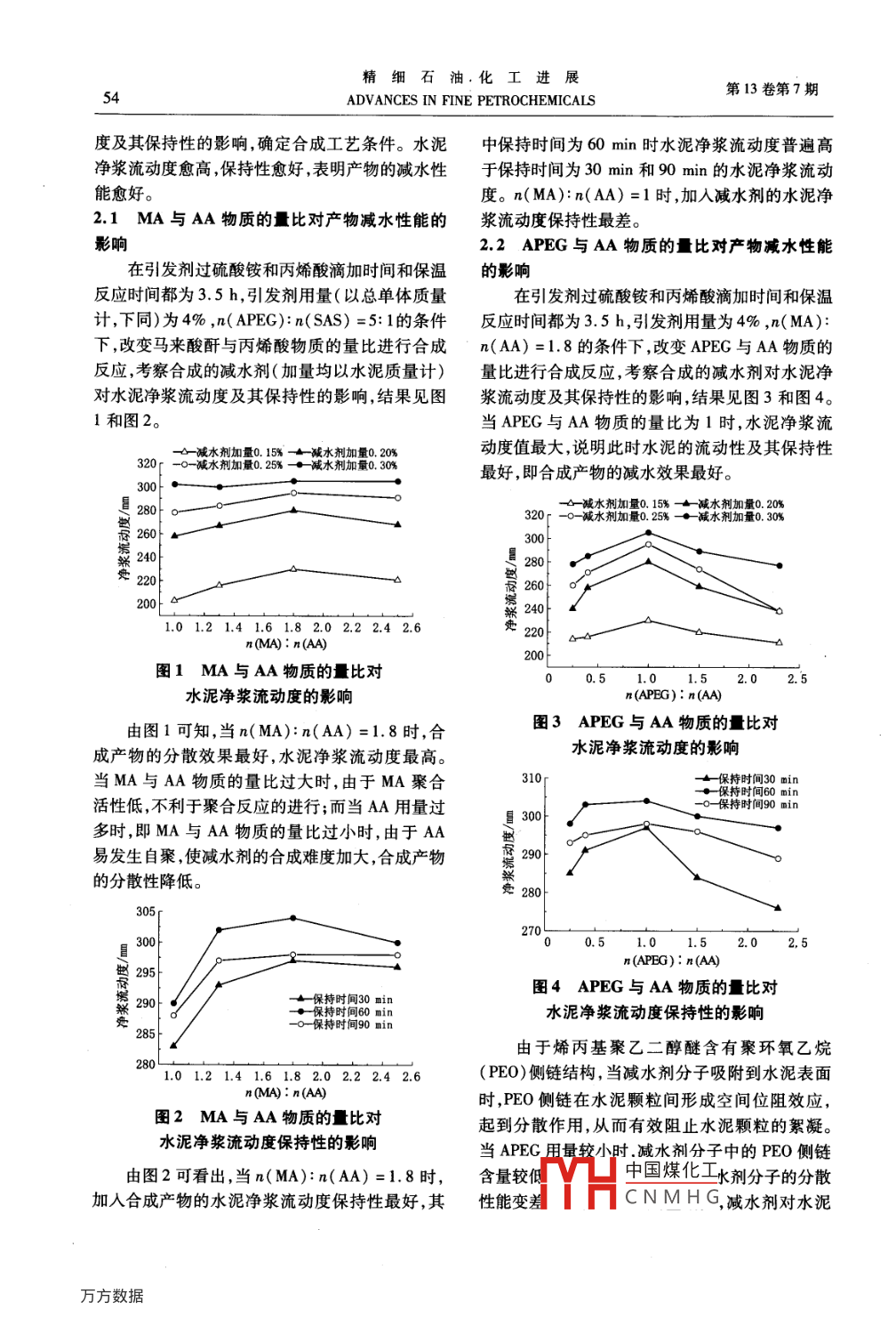 2012年7月郝秋芬等.聚乙二醇接枝醚型聚羧酸減水劑的合成及性能研究聚乙二醇接枝醚型聚羧酸減水劑的合成及性能研究郝秋芬,李艷靜,潘月,張國政,唐林生(青島科技大學化工學院,青島266042)[摘要]以烯丙基聚乙二醇醚( APEG)、丙烯酸( AA)、馬來酸酐(MA).烯丙基磺酸鈉(SAS)為原料,合成了聚乙二醇接枝醚型聚羧酸鈉減水劑??疾炝撕铣蓷l件對產(chǎn)物減水性能的影響。在n( APEG): n( AA): n( MA): n(SAS) =5:5:9: 1,引發(fā)劑用量為4%的優(yōu)化條件下合成的減水劑,以0.32%的摻量加入到P. I42. 5R水泥中,水泥的凈漿流動度為305 mm,砂漿減水率為31%,泌水率比為30%,含氣量為3.0%,初凝時間之差和終凝時間之差分別為+70min和+5min,坍落度為220 mm,60 min后坍落度損失約為4. 5% ;1,3,7,28 d的抗壓強度增長比分別為220%,190%,170%,170%;收縮率比為75%。以上各項指標均符合高性能減水劑中的標準型減水劑性能指標。合成的醚型聚羧酸減水劑在減水率和抗壓強度增長比方面均優(yōu)于以甲氧基聚乙二醇馬來酸單酯和甲氧基聚乙二醇衣康酸單酯為大單體合成的酯型聚羧酸減水劑。[關(guān)鍵詞]烯丙基聚乙二醇醚 醚型聚羧酸減水劑水泥合成聚羧酸系高性能減水劑具有摻量低、減水率P. I42. 5R水泥,山水東岳水泥有限公司;細集高混凝土拌合物工作性能及工作保持性能好、與料:河砂,細度模數(shù)為2.6;粗集料:碎石,最大粒其他外加劑和不同種類的水泥相容性好、收縮率徑為30.5 mm。小環(huán)保等優(yōu)點,因而在國內(nèi)外得到飛速發(fā)展。1.2儀器設(shè)備2001年,日本聚羧酸系減水劑的用量在AE(引氣WJ21型水泥標準稠度及凝結(jié)時間測定儀、型)減水劑中超過了80%。近年來,歐洲和北美BTC-1型坍落度測定儀.NZ - 160型水泥凈漿攪也開始從萘系、蜜胺系減水劑向聚羧酸系減水劑拌機、HQG-1000型貫人式混凝土強度測定儀,方向發(fā)展。2006年,我國聚羧酸系減水劑生產(chǎn)企均為北京鑫宇試驗儀器廠生產(chǎn)。業(yè)已經(jīng)超過了60家,產(chǎn)量在150 kt以上[1-4。但1.3 聚羧酸減水劑的合成國內(nèi)生產(chǎn)的聚羧酸系減水劑品種較少,而且主要按一定物料比將APEG, MA ,SAS和水加人到以酯型聚羧酸減水劑為主,難以滿足不同用途的250 mL的三口燒瓶中,攪拌升溫,待物料溫度升至需求。醚型聚羧酸高性能減水劑是第I二代聚羧酸80~85,C時,分別緩慢滴加丙烯酸和過硫酸銨溶減水劑,與第- -代酯型聚羧酸減水劑相比,它具有液,滴加時間約為3.5 h,然后升溫至85 ~90 C,保合成工藝簡單、成本低、性能穩(wěn)定、環(huán)保等優(yōu)點,因溫反應(yīng)約3.5 h;反應(yīng)完畢后冷卻至室溫,用氫氧化而成為最具發(fā)展?jié)摿Φ木埕人釡p水劑[5.6]。但國鈉溶液中和至pH為7左右,即得目標產(chǎn)物。1.4性能測試內(nèi)對該類減水劑的研究較少。本文報道了以烯丙基聚乙二醇醚( APEG)為按照GB/T 8077- -2000<混凝土外加劑勻質(zhì)大單體,采用直接共聚法,合成醚型聚羧酸減水性試驗方法》的規(guī)定,測定水泥凈漿流動度及保持凈漿流動度。按照GB 8076--1997的規(guī)定,測劑,并對其減水性能進行了研究。定減水率、泌水率、泌水率比凝結(jié)時間差、抗壓強1試驗部分度比、收縮率比;按照GB/T 50080 ,測定混凝土坍1.1合成材料落度、含氣量。氫氧化鈉、過硫酸銨、馬來酸酐(MA)、丙烯2結(jié)果與討論酸( AA) ,均為分析純,天津市博迪化工有限公司;通過考察制備的減水劑樣品對水泥凈漿流動烯丙基聚乙二醇醚( APEG),相對分子質(zhì)量1000,工業(yè)品,江蘇海安石油化工有限公司;烯丙基磺酸收稿日期中國煤化工鈉( SAS),工業(yè)品,濰坊聯(lián)盟有限公司;作者簡介MYHCNMH G向為精細化工。精細石油,化工進展第13卷第7期54ADVANCES IN FINE PETROCHEMICALS度及其保持性的影響,確定合成工藝條件。水泥中保持時間為60min時水泥凈漿流動度普遍高凈漿流動度愈高,保持性愈好,表明產(chǎn)物的減水性于保持時間為30 min和90 min的水泥凈漿流動能愈好。度。n(MA):n(AA) =1時,加人減水劑的水泥凈2.1MA與AA物質(zhì)的比對產(chǎn)物減水性能的漿流動度保持性最差。影響2.2 APEG 與AA物質(zhì)的量t 比對產(chǎn)物減水性能在引發(fā)劑過硫酸銨和丙烯酸滴加時間和保溫的影響反應(yīng)時間都為3.5 h,引發(fā)劑用量(以總單體質(zhì)量計,下同)為4% ,n( APEG): n(SAS) =5: 1的條件反應(yīng)時間都為3.5 h,引發(fā)劑用量為4% ,n( MA):下,改變馬來酸酐與丙烯酸物質(zhì)的量比進行合成n(AA) =1.8的條件下,改變APEG與AA物質(zhì)的反應(yīng),考察合成的減水劑(加量均以水泥質(zhì)量計)量比進行合成反應(yīng),考察合成的減水劑對水泥凈對水泥凈漿流動度及其保持性的影響,結(jié)果見圖漿流動度及其保持性的影響,結(jié)果見圖3和圖4。.1和圖2。當APEG與AA物質(zhì)的量比為1時,水泥凈漿流心減水劑加量0.15% +越水劑加量0. 20%動度值最大,說明此時水泥的流動性及其保持性320r -0-減水劑加量0. 25%-減水劑加量0. 30%最好,即合成產(chǎn)物的減水效果最好。300,E 280-320p - 0-減水劑加量0.25% -◆減水劑加量0. 30%a 260-300菜2402202602002401.0 1.2 1.4 1.6 1.8 2.0 2.2 2.4 2.6n(MA) : n(AA)圖1MA與AA物質(zhì)的比對0.51.0 1.5 2.0 2. 5水泥凈漿流動度的影響n(APEG): n(AA)囝3APEG與AA物質(zhì)的比對由圖1可知,當n(MA):n(AA)=1.8時,合成產(chǎn)物的分散效果最好,水泥凈漿流動度最高。當MA與AA物質(zhì)的量比過大時,由于MA聚合310 r十一保持