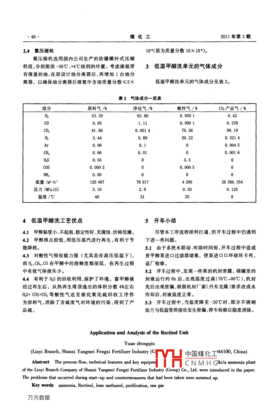 低溫甲醇洗裝置的應(yīng)用與分析