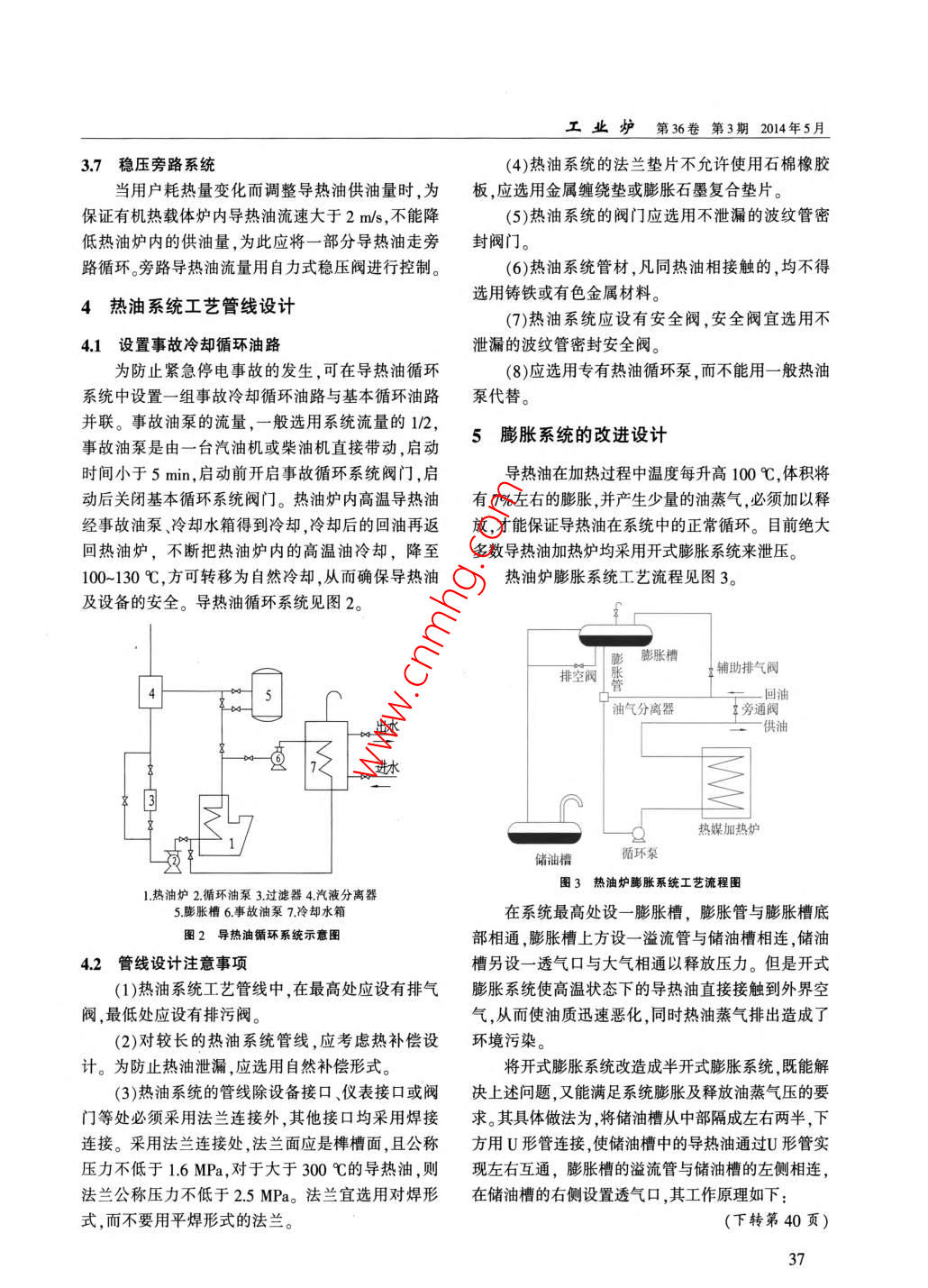 第36卷第3期工業(yè)爐Vol 36 No.32014年5月Industrial FumaceMay 2014燃水煤漿導(dǎo)熱油爐供熱系統(tǒng)設(shè)計(jì)汪琦,季炳奎2,季俊2(1上海熱油爐設(shè)計(jì)開發(fā)中心,上海20002;2上海恒欣化工有限公司,上海200436)摘要:介紹了水煤漿種類、制備工藝及濾漿環(huán)節(jié)。分析了導(dǎo)熱油供熱系統(tǒng)的工藝流程,總結(jié)了導(dǎo)熱油系統(tǒng)工藝管線的設(shè)計(jì)注意事項(xiàng),并對導(dǎo)熱油膨脹系統(tǒng)的改進(jìn)設(shè)計(jì)方法進(jìn)行了探討。關(guān)鍵詞:水煤漿;制備工藝;導(dǎo)熱油;供熱系統(tǒng);工藝管線;膨脹系統(tǒng)中圖分類號:TK75文獻(xiàn)標(biāo)識碼:B文章編號:1001-6988(2014)03-0035-03Heating System Design of Burning Coal Water SlurryHeat Conduction Oil FurnaceWANG Qi, JI Bing-kui, JI Jun2(1. Hot Oil Furnace Design and Development Center in Shanghai, Shanghai 200042, China;2. Shanghai Hengxin Chemical Co, Lid, Shanghai 200436, China)Abstract: The types, preparation technology and coal water slurry feed slurry link of coal water slurryare introduced. The technological process of heat conduction oil heating system is analyzed, the processpipeline design considerations of heat conduction oil system are summarized, and improvement of heatconduction oil expansion system design methods are discussedKey words: coal water slurry; preparation process; heat conduction oil; heating system; processpipeline; expansion system水煤漿是由大約70%煤、29%水和1%添加劑通煤炭產(chǎn)品過物理加工得到的一種低污染、高效率,可以采用管12中濃度水煤漿道輸送的代油煤基流體燃料,水煤漿可以替代煤炭由平均粒徑小于0.3mm且有一定級配細(xì)度的直接在導(dǎo)熱油爐中燃燒,并且水煤漿還具有良好的煤粉與水混合,煤水比為11左右,具有較好的流動(dòng)穩(wěn)定性及流變性,易于裝卸、儲存、輸送及直接霧化性和一定穩(wěn)定性,可遠(yuǎn)距離泵送的漿狀煤炭產(chǎn)品。燃燒,能夠管道輸送,運(yùn)行費(fèi)用低,是環(huán)保效益好降13精細(xì)水煤漿低環(huán)境污染的一種有效途徑。用超低灰(A<1%)精煤經(jīng)過超細(xì)磨碎粒度上1水煤漿種類限在44μm以下,平均粒度小于10μm,濃度約50%,表觀黏度在剪切速率為100s-時(shí),小于40011高濃度水煤漿mPas,是重柴油的一種代替燃料。由平均粒徑小于006mm,且有一定級配(不同1.4煤泥漿粒級的配比)細(xì)度的煤粉與水混合,濃度在60%以利用洗煤廠生產(chǎn)過程中產(chǎn)生的煤泥,保持55%上,黏度在1500mPas以下,穩(wěn)定性在一個(gè)月內(nèi)不左右的濃度就地應(yīng)用的漿狀煤漿燃料。產(chǎn)生硬沉淀,可以長距離泵送,霧化直接燃燒的漿狀2水煤漿制備工藝收稿日期:2013-11-05;修回日期:201401-31作者簡介:汪琦(1%61-),男,工學(xué)碩士,高級工程師,長期從水煤漿制備工藝通常包括選煤(脫灰、脫硫)、破事熱油爐、焚燒爐生物質(zhì)氣化爐的設(shè)計(jì)研究、開發(fā)碎、磨礦、加人添加劑捏混、攪拌與剪切,以及為剔除最終產(chǎn)品中的超粒與雜物的濾漿等環(huán)節(jié)。35經(jīng)驗(yàn)交流:燃水煤漿導(dǎo)熱油爐供熱系統(tǒng)設(shè)計(jì)2.1選煤當(dāng)原料煤的質(zhì)量滿足不了用戶對水煤漿灰分、管道流硫分與熱值的要求時(shí),制漿工藝中應(yīng)設(shè)有選煤環(huán)節(jié)。電自然循環(huán)4除制備超低灰(灰分小于1%)精細(xì)水煤漿外,制漿6用煤的洗選采用常規(guī)的選煤方法。大多數(shù)情況下選煤應(yīng)設(shè)在磨礦前,只有當(dāng)煤中礦物雜質(zhì)嵌布很細(xì),需SYZY排污經(jīng)磨細(xì)方可解離雜質(zhì)選出合格制漿用煤時(shí),才考慮+84Y采用磨礦后再選煤的工藝。煙囪22礦碎與磨礦1用熱設(shè)備2熱油爐3離心油泵4膨脹槽5儲油槽6油氣分離器7導(dǎo)熱油過濾器8齒輪油泵在制漿工藝中,破碎與磨礦是為了將煤炭磨碎圖1導(dǎo)熱油供熱系統(tǒng)工藝流程圖至水煤漿產(chǎn)品所要求的細(xì)度,并使粒度分布具有較高的堆積效率,它是制漿廠中能耗最高的環(huán)節(jié)。為送至用熱設(shè)備,經(jīng)油氣分離器和油過濾器,排除導(dǎo)熱了減少磨礦功耗,除特殊情況外(如利用粉煤或煤泥油中的氣體和雜質(zhì)后,再經(jīng)循環(huán)泵送回有機(jī)熱載體制漿),磨礦前必須先經(jīng)破碎。磨礦可用干法,亦可爐,從而實(shí)現(xiàn)供熱循環(huán)。用濕法。磨礦回路可以是一段磨礦,也可以是由多導(dǎo)熱油供熱方式有一次循環(huán)供熱、二次循環(huán)供臺磨機(jī)構(gòu)成的多段磨礦。熱和間歇性供熱等幾種23捏混與攪拌32注油系統(tǒng)捏混只是在干磨與中濃度濕磨工藝中才采用向供熱系統(tǒng)注入導(dǎo)熱油有以下幾種情況:它的作用是使干磨所產(chǎn)生煤粉或中濃度產(chǎn)品經(jīng)過過(1)將外部導(dǎo)熱油經(jīng)注油泵注入膨脹槽或儲濾機(jī)脫水所得濾餅?zāi)芘c水和分散劑均勻混合,并初油槽。步形成有一定流動(dòng)性的漿體,便于在下一步攪拌工(2)將儲油槽內(nèi)的導(dǎo)熱油經(jīng)注油泵注入膨脹槽。序中進(jìn)一步混勻。這種物料如不先經(jīng)捏混,直接進(jìn)(3)將儲油槽內(nèi)的導(dǎo)熱油用注油泵排至供熱系入攪拌機(jī)是無法把漿體混勻的統(tǒng)外,以更換導(dǎo)熱油。攪拌是為了使煤漿混勻,還具有在攪拌過程中33排氣系統(tǒng)使煤漿經(jīng)受強(qiáng)力剪切,加強(qiáng)添加劑與煤粒表面間作導(dǎo)熱油供熱循環(