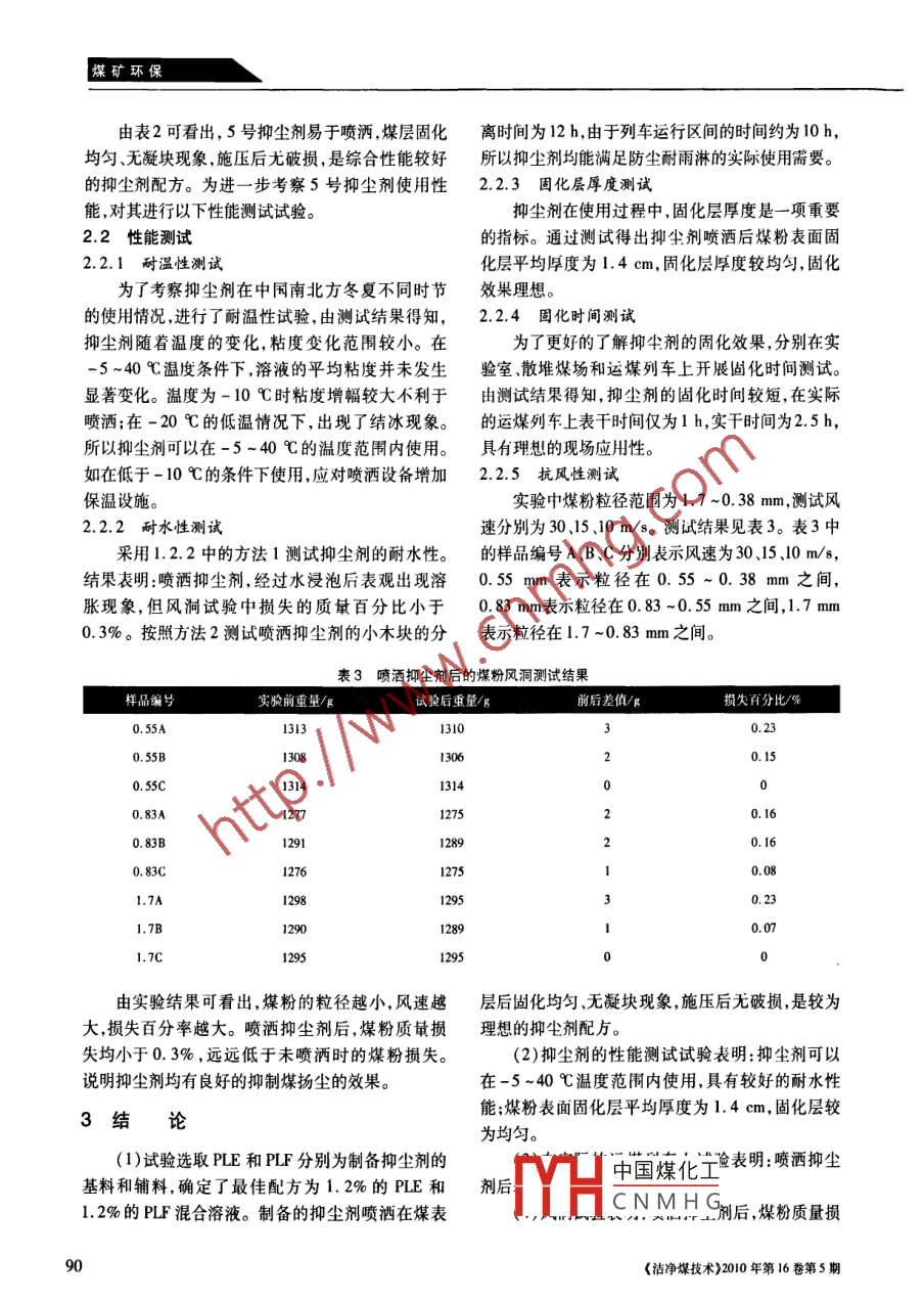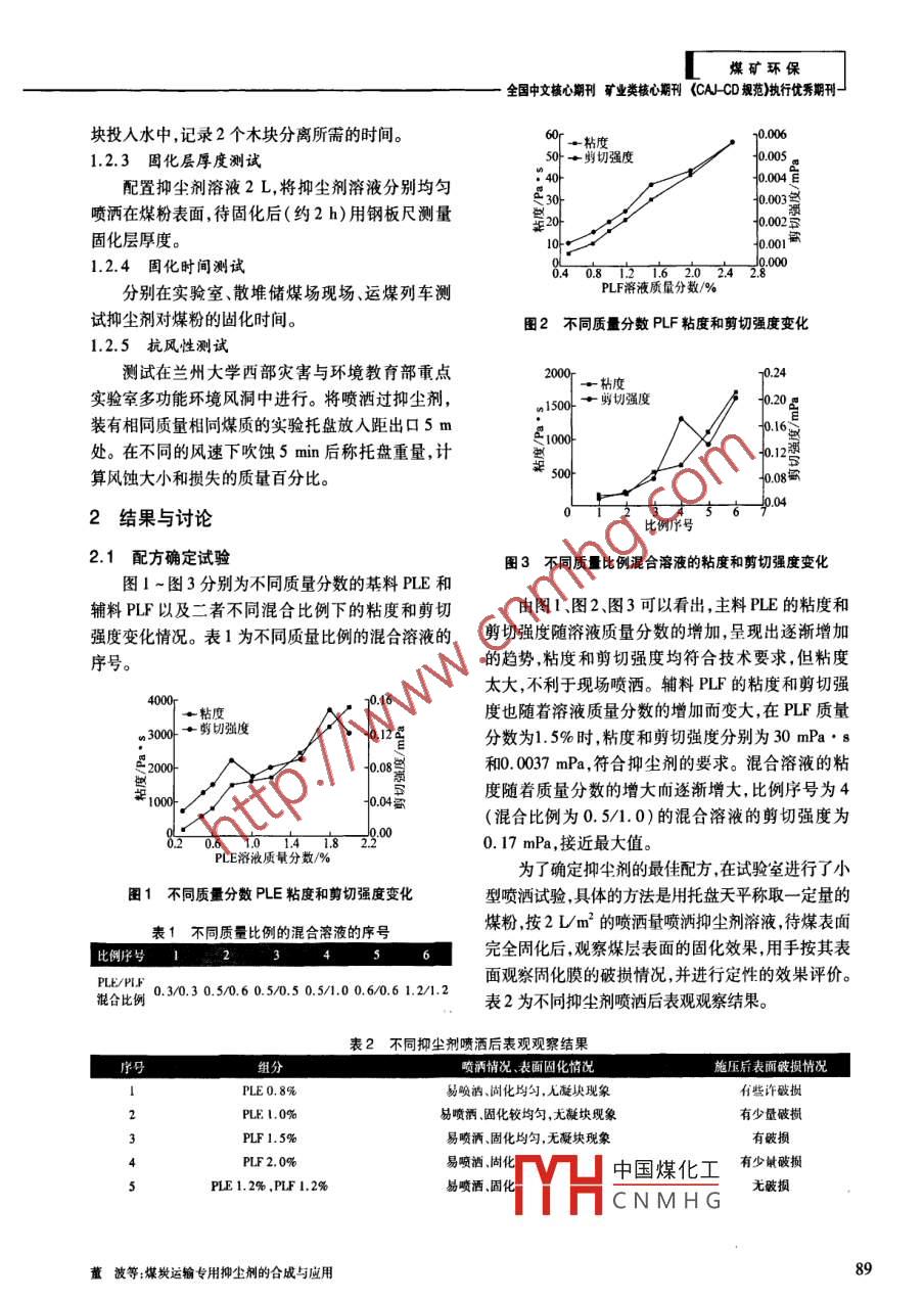 煤礦環(huán)保煤炭運輸專用抑塵劑的合成與應(yīng)用董波,蔡覺先,李穎泉(蘭州交通大學環(huán)境與市政工程學院,甘肅蘭州730070)摘要:為了滿足中國煤炭鐵路運輸?shù)囊謮m需求,研究了一種新型復合型抑塵劑。通過對基料和輔料的粘度和剪切強度的試驗篩選確定了最佳配方。針對抑塵劑實際應(yīng)用效果開展了耐溫性、耐水性、抗風性、固化層厚度和固化時間等綜合性能的試驗測試。結(jié)果表明:新型抑塵劑在常溫下即可溶解,能夠在-5~40 C溫度范圍內(nèi)正常使用,固化時間短,固化層厚度均勻,固化效果好,具有實際應(yīng)用價值。關(guān)鍵詞:抑塵劑;抑塵性能;固化層中圖分類號:TD714文獻標識碼:A文章編號:1006 -6772(2010)05 -0088 -04中國鐵路煤炭運輸基本為敞車運輸,運輸中由1試驗部分于線路因素和列車交會時的風壓作用,尤其是列車進人隧道時產(chǎn)生瞬間擾動氣流,使煤層表面的煤粉1.1 配方確定.顆粒被吹離車體,散落到線路上,造成沿線環(huán)境污分別考察不同質(zhì)量分數(shù)基料PLE和輔料PLF染和煤炭資源浪費"。此外,中國許多散堆儲煤場單獨和混合后制備的抑塵劑的粘度和剪切強度,并都處于多風地域,而且煤炭是露天堆放,大風對煤結(jié)合實驗室噴灑試驗結(jié)果確定出最佳配方,即為試堆的吹蝕作用給煤場周邊的環(huán)境造成了污染,給企驗所用抑塵劑。1.2 性能測試方法業(yè)帶來了一定的經(jīng)濟損失”。試驗測試中所使用煤粉為甘肅華亭原煤。研發(fā)多組分、環(huán)保型的抑塵劑是國內(nèi)外抑塵課1.2.1耐溫性測試題的主要研究方向[6-4。該類抑塵劑除具有較強的將抑塵劑溶液分別在40、20、-5.-10、-20 C抑塵效果外,還應(yīng)具有在常溫下可快速溶解于水、的恒溫條件下放置一段時間(2 h),取出測定其無毒、無害、無腐蝕等特點,以減少抑塵劑現(xiàn)場配制1.2.2耐水性測試粘度。所需的加熱設(shè)備,縮短溶液配制時間,降低電能消采用以下2種方法測試抑塵劑的耐水性。耗,使現(xiàn)場應(yīng)用適用性更強。(1)按2 LV/m2的噴灑量噴灑在煤樣品上,待其選取有機高分子化合物PLE和PLF(注:此處固結(jié)成殼后,在煤層表面噴灑1 ~1.5 mm厚的水涉及到專利,故用字母代替)分別作為抑塵劑的基層,晾干水分后觀察表面現(xiàn)象并通過風洞試驗進行料和輔料,制備新型抑塵劑,確定最佳配方,并對其評估。進行相關(guān)抑塵性能測試‘5一7。(2)將抑塵劑溶液涂抹在2個木塊中間,將木塊粘接在一起,放置- -段時間使其粘結(jié),然后將木收稿日期:2010-06 -22中國煤化工基金項目:甘肅省科技支撐項目(0708GKCA010)M.HCNMHG作者簡介:董波(1956~-) ,男,甘肅蘭州人,教授,從事污水處理及揚塵污染治理研究。88《潔凈煤技術(shù)2010年第16卷第5期煤礦環(huán)保全國中文核心期刊礦業(yè)類核心期刊(CAJ-CD 規(guī)苑)執(zhí)行優(yōu)秀期刊一塊投入水中,記錄2個木塊分離所需的時間。60r. 粘皮1.2.3 固化層厚度測試50+剪切強度+0.005.”404+0.004百配置抑塵劑溶液2L,將抑塵劑溶液分別均勻+0.00多噴灑在煤粉表面,待固化后(約2 h)用鋼板尺測量+0.0020固化層厚度。10to.0011.2.4固化時 間測試0.40.812162024J0000分別在實驗室、散堆儲煤場現(xiàn)場、運煤列車測PLF溶液質(zhì)量分數(shù)/%試抑塵劑對煤粉的固化時間。圖2不同質(zhì)分數(shù)PLF粘度和剪切強度變化1.2.5 抗風性測試測試在蘭州大學西部災(zāi)害與環(huán)境教育部重點實驗宰多功能環(huán)境風洞中進行。將噴灑過抑塵劑,+剪切強度n1500-裝有相同質(zhì)量相同煤質(zhì)的實驗托盤放人距出口5 m∈1000處。在不同的風速下吹蝕5 min后稱托盤重量,計算風蝕大小和損失的質(zhì)量百分比。2結(jié)果與討論比例號2.1配方確定試驗圖3不同質(zhì)比例混合溶液的粘度和剪切強度變化圖1 ~圖3分別為不同質(zhì)量分數(shù)的基料PLE和輔料PLF以及二者不同混合比例下的粘度和剪切由圖1、圖2、圖3可以看出,主料PLE的粘度和強度變化情況。表1為不同質(zhì)量比例的混合溶液的剪切強度隨溶液質(zhì)量分數(shù)的增加,呈現(xiàn)出逐漸增加序號。.的趨勢,粘度和剪切強度均符合技術(shù)要求,但粘度太大,不利于現(xiàn)場噴灑。輔料PLF的粘度和剪切強y0.16一粘度度也隨著溶液質(zhì)量分數(shù)的增加而變大,在PLF質(zhì)量的300分數(shù)為1. 5%時,粘度和剪切強度分別為30 mPa. s0.08和0.0037mPa,符合抑塵劑的要求?;旌先芤旱恼扯入S著質(zhì)量分數(shù)的增大而逐漸增大,比例序號為400040.04葛(混合比例為0.5/1.0)的混合溶液的剪切強度為0.17 mPa,接近最大值。PLE溶液質(zhì)量分數(shù)/%為了確定抑塵劑的最佳配方,在試驗室進行了小圉1不同質(zhì)量分數(shù) PLE粘度和剪切強度變化型噴灑試驗,具體的方法是用托盤天平稱取一定量的煤粉,按2 Lm2的噴灑量噴灑抑塵劑溶液,待煤表面表1不同質(zhì) 量比例的混合溶液的序號完全周化后,觀察煤層表面的固化效果,用手按其表比例序號面觀察固化膜的破損情況,并進行定性的效果評價。PLE/PIF0.3/0.3 0.5/0.6 0.5/0.5 0.5/1.0 0.6/0.6 1.2/1.2混合比例表2為不同抑塵劑噴灑后表觀觀察結(jié)果。表2不同抑塵劑噴酒后表觀觀察結(jié)果組分噴灑情況、表面固化情況施壓后表面破損情況PLE 0.8%易吸洶、固化均勻,兒凝塊現(xiàn)象有些許破損PLE 1.0%易噴灑.固化較均勻,尤凝塊現(xiàn)象有少量破損PLF 1.5%易噴灑、固化均勻,無